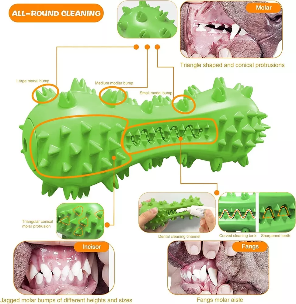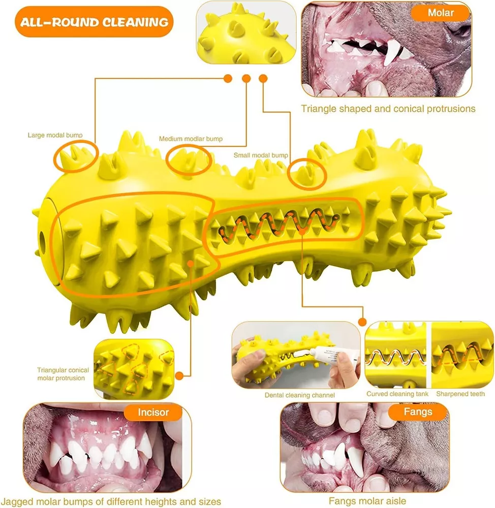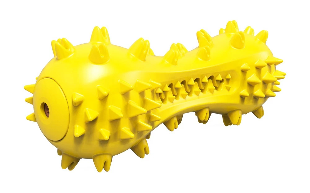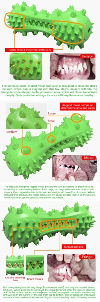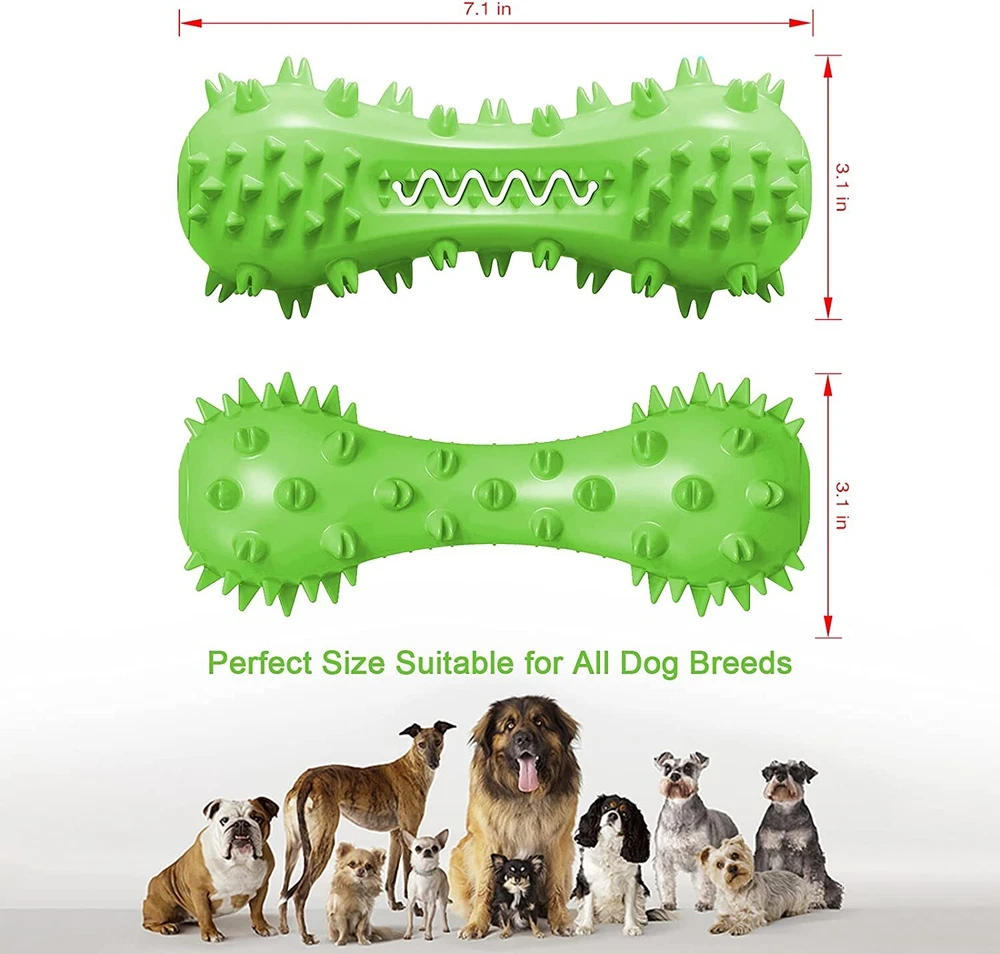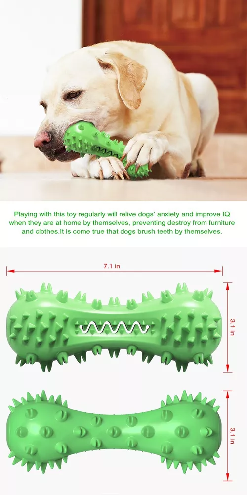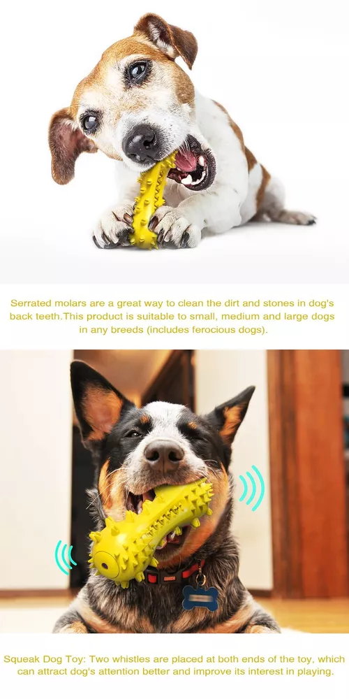 Dog Squeaky Chew Toy Specifications: •1. Size: 7.1*3.1*3.1in / 180 x 78.7 x 78.7 mm. •2. Weight: 5.6oz / 160g •3.Color: Yellow, Turquoise, Green •4. Material: Natural Rubber Note: •1. Please clean the toy regularly. •2. You'd better put some food kibble that your dogs like on it to attract them. •3. This Rubber Chew Toy is lightweight and soft different as the heavy tough Nylon Chew Toy. Dog IQ Training Toy This dog toy keeps your dog playing all day without getting bored, making them more lively and lovely. LIFEIN helps provide mental and physical stimulation. Squeaky Dog Toys The both ends are equipped with a sound devices, it can make a squeak to attract the dog's attention when your dog is biting or playing with it, thereby increasing the dog's more interest in playing. Tooth Cleaning Toy This LIFEIN dog toys can be used as a dog tooth cleaning brush. Squeezing toothpaste on toys can effectively help dogs clean their teeth, reduce their mouth odor and help dogs grow up positively and happily. Soft Durable Rubber Material • Rubber Chew Toy is designed for dog teeth cleaning, it's lightweight soft but durable and safe for dogs gums. • So it's different from the Nylon Chew Toy, which it's heavier, tough and hard as bone, good on heavy duty chewing but risk on gums hurting. Safe Insipidness Material • This dog chew toy is insipidness for absolutely safe chewing. • So you'd better put some food kibble that your dogs like on it to attract them to chew, like toothpaste, peanut butter, mashed potatoes , pumpkin puree, etc. Easy to Clean •You can easily wash it by hand with the attached brush. For the durable surface, you don't need to worry about damaging this toy due to repeated cleaning.