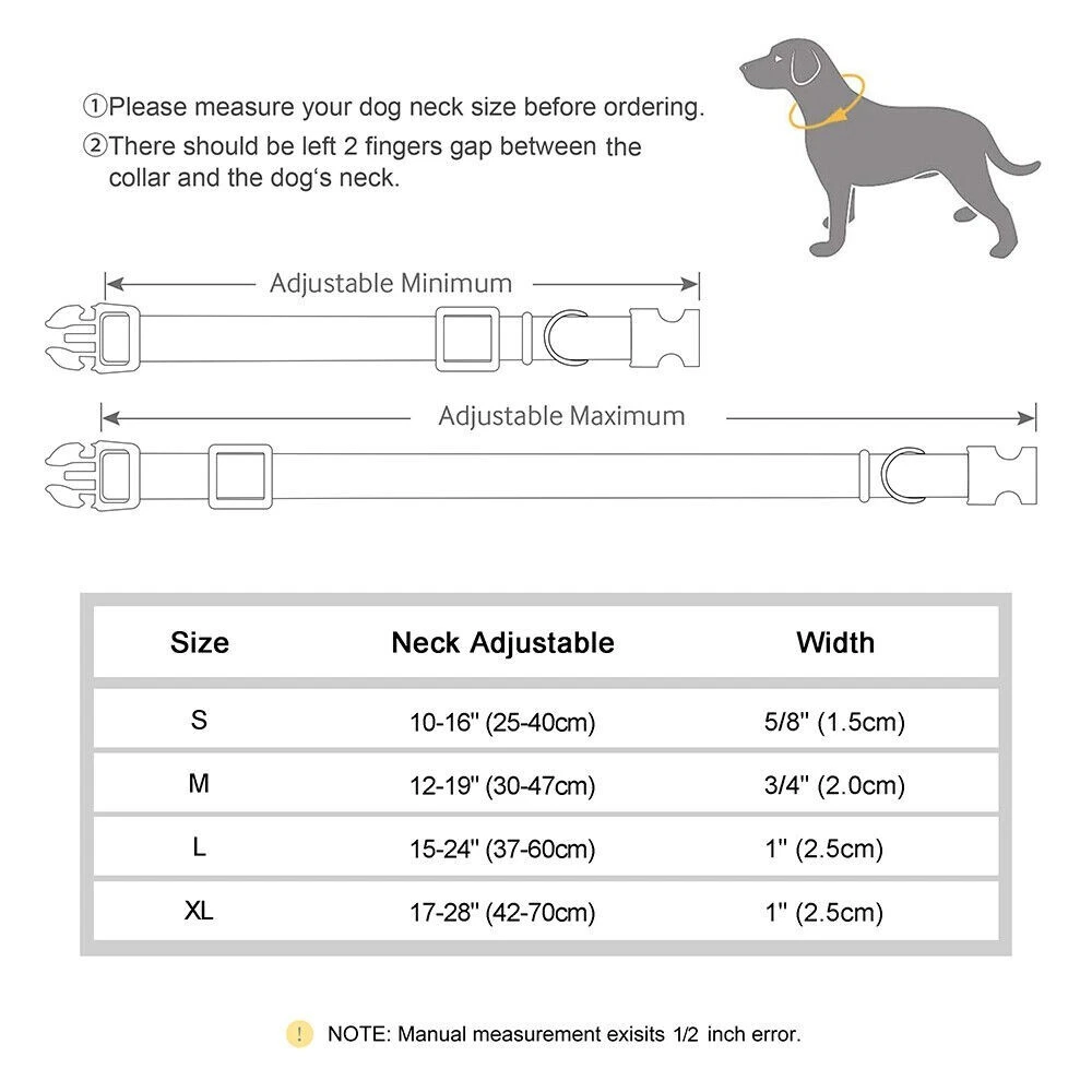 Dog Collar Personalised Embroidered Custom ID Name Phone Number Reflective Nylon If you need to purchase multiple, You first choose a color to fill in the text you need, then add it to the shopping cart, and the other one will do the same. Finally, you can make the payment together. You can get the discount. Dog Collar Personalised Type: Dog Collar Personalised Material:Nylon 11 Colours:Black/Dark Blue/Blue/Green/Light Green/Dark Purple/Purple/Hot Pink/Pink/Orange/Red Features: Soft Durable nylon material,it's comfortable for your pet to wear. A great way to know that someone can contact you if something happens and your dog gets away from you. Personalized dog collars are made from the strongest and most durable products Reflective design,safety walking at night. The collar features a secure side-release buckle and a non-corrosive D-ring. Embroidered design will make your dog more cool . The stitching can be done in color as picture shows Different colors and sizes,you can choose a right 1 pcs for your pet. Measurement of current collar. This will make it much easier for me to keep from covering the embroidery. Fit for small to large dogs.e.g.Chihuahua/Yorkie/Pug/Bichon Frise/Dachshund/Schnauzer/French Bulldog/Beagle/Pitbull/Labardor/German Shepherd, Golden Retriever,Rottweiler.etc Package Include:1xDog Collar Personalised. If you need to purchase multiple, You first choose a color to fill in the text you need, then add it to the shopping cart, and the other one will do the same. Finally, you can make the payment together.You can get the discount. Sample Text:(Please leave us engrave information at check out,we will embroidery it for you ) Abby*012-345-6789 Size Neck Adjustable Width S 10-16"(25-40cm) 5/8"(1.5cm) M 12-19"(30-47cm) 3/4"(2.0cm) L 15-24"(37-60cm) 1.0"(2.5cm) XL 17-28"(42-70cm) 1.0"(2.5cm) Note: Please measure the neck size of your pet before ordering.That's important! Please allow 0.5-1 inch(1-3cm) error due to manual measurement.