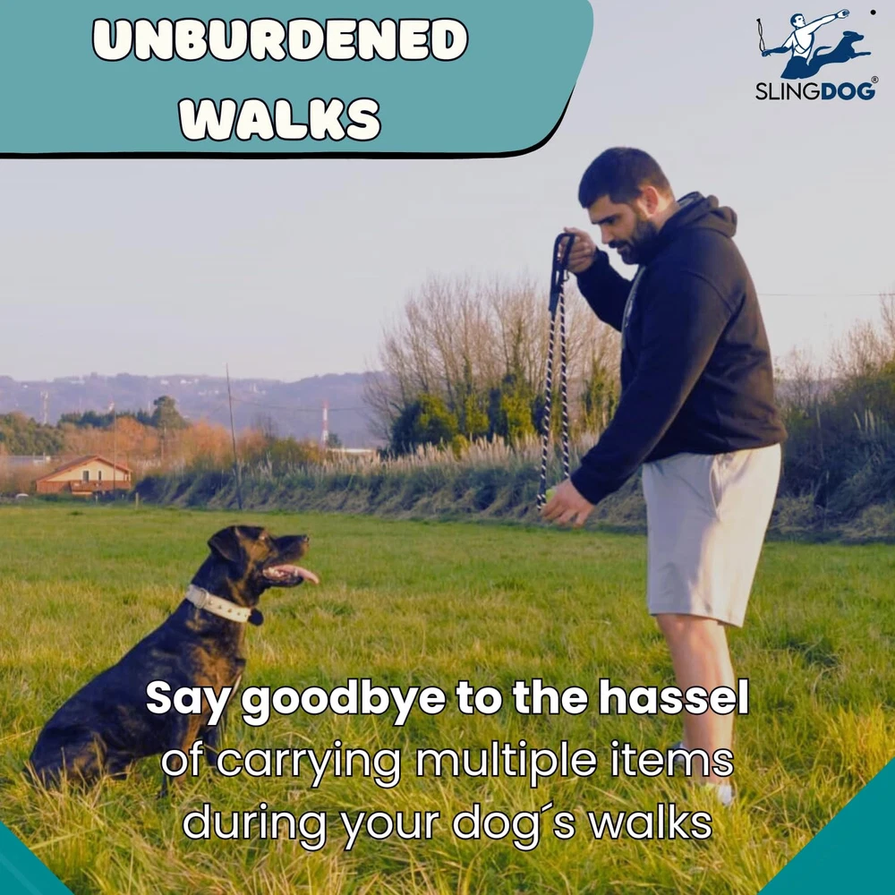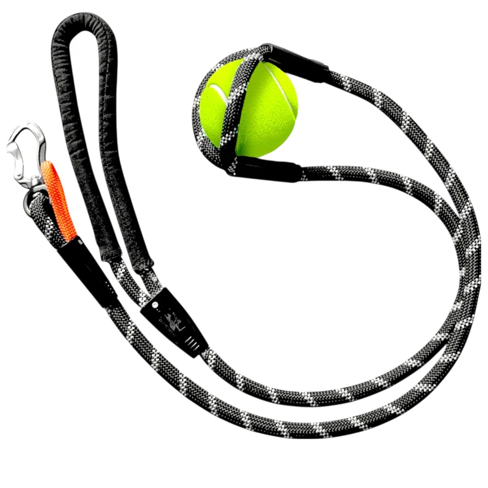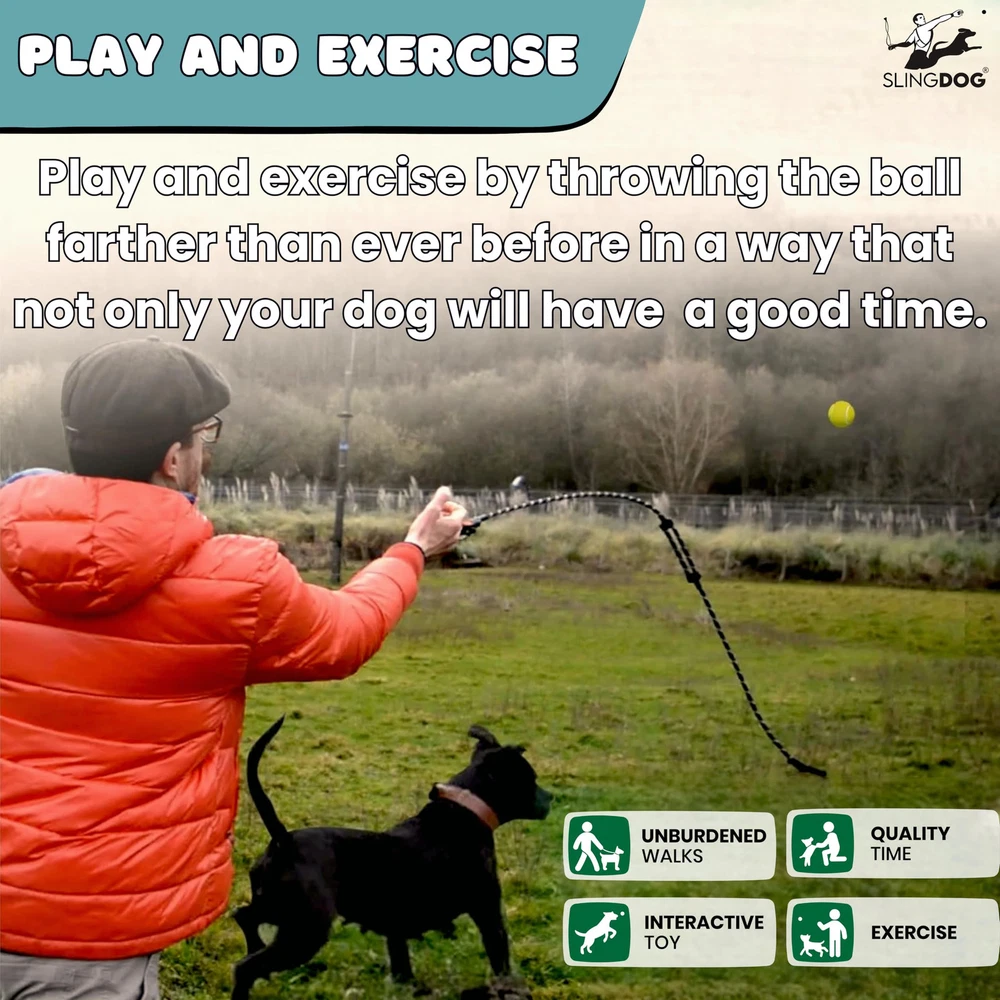 ALL-IN-SOLUTION - Our -in-dog leash and ball launcher defines convenience and fun during your dog walks. Ball holder strings doubles as a second handle, providing enhanced control in challenging or training situations. Our product can be a dog leash, a ball launcher, or a pet toy. It's all three in smart design, making your dog's outdoor adventures more enjoyable. COMPATIBILE WITH ALL TYPES OF BALLS - ball launcher is designed to work with most types and sizes of dog balls, ensuring that you can use your dog's favorite ball without any issue. Our set includes a standard tennis ball to get you started, along with a complimentary cotton bag for carrying the ball on walks. UNBURDENED WALKS - With our Ball Launcher for Dogs you can say goodbye to the hassle of carrying multiple items during your dog walks. Dog Leash and Ball Launcher combo streamlines your outings, with the ball launcher's handle serving as a dual-purpose tool. It's an interactive toy that offers both exercise and the protection, making your walks even funnier. INNOVATIVE EXERCISE SOLUTION - We have combined play and exercise by enabling you to launch a ball further than ever before for your dog using a slingshot-style rope. Provides an interactive playtime experience for your dog, keeping them active and ensures happy experience and quality time for you and for your dog. PRIORITIZING COMFORT AND SAFETY - we have designed our product with your dog's safety and well-being in mind. It features a secure and padded neoprene handle for a comfortable grip, a lightweight and durable carabiner with 360º rotation to prevent pulling, highly reflective nylon fibers woven into the leash which provides comfort and safety during play and exercise. LxWxH 59×0.4×0.4 Inches