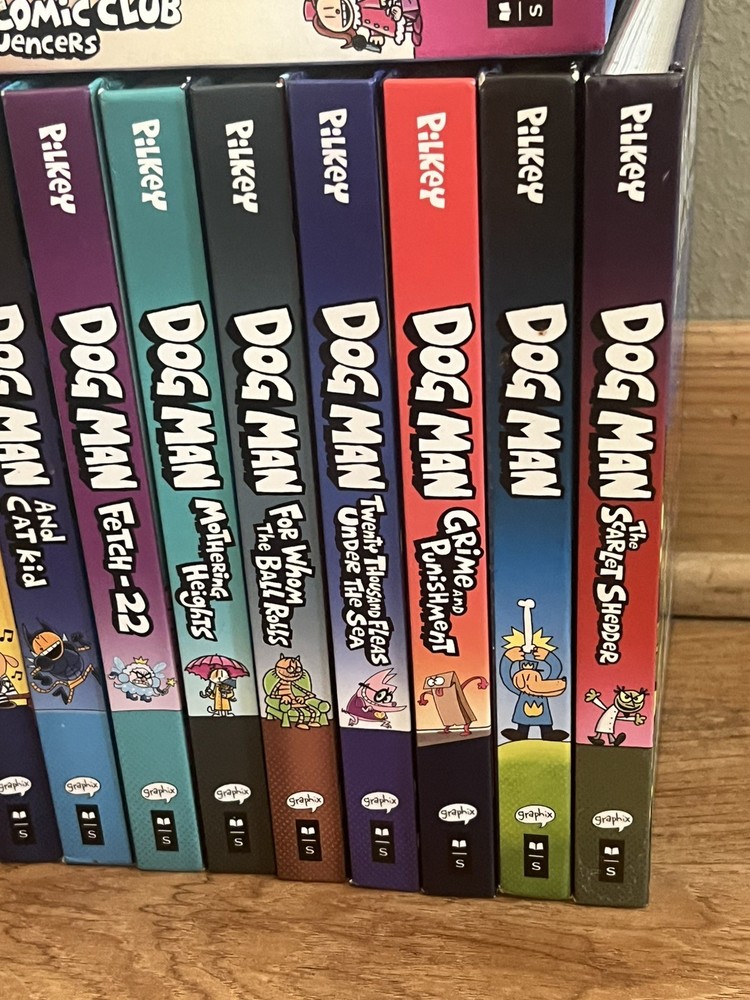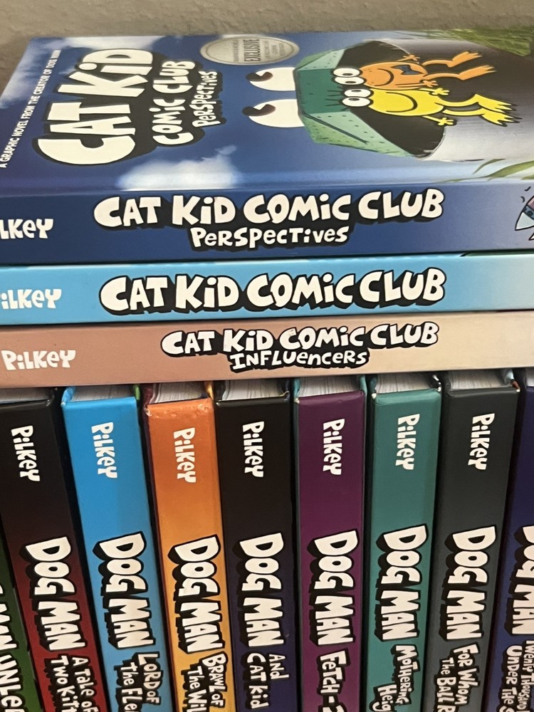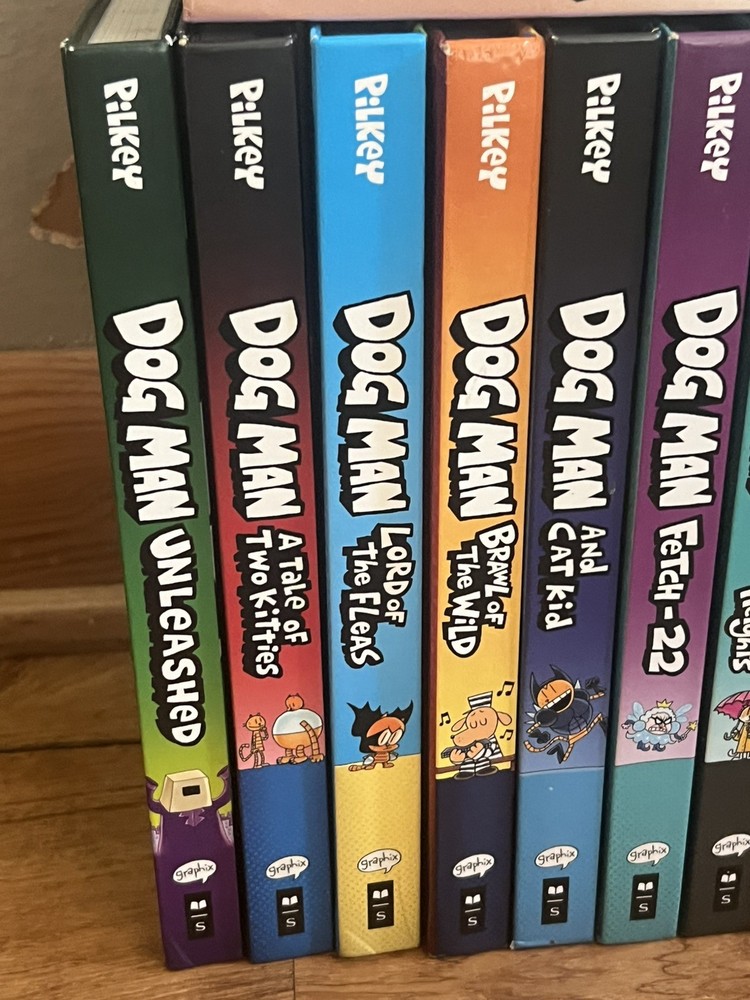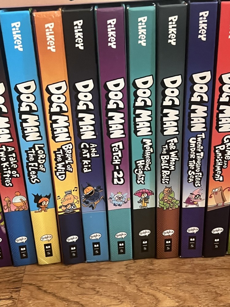 1. Dog Man 2. Dog Man Unleashed 3. Dog Man: A Tale of Two Kitties 4. Dog Man and Cat Kid 5. Dog Man: Lord of the Fleas 6. Dog Man: Brawl of the Wild 7. Dog Man: For Whom the Ball Rolls 8. Dog Man: Fetch-22 9. Dog Man: Grime and Punishment 10. Dog Man: Mothering Heights 11. Dog Man: Twenty Thousand Fleas Under the Sea 12. Dog Man: The Scarlet Shedder PLUS 3 Cat Kid books All books are in beautiful condition and ready for their new home