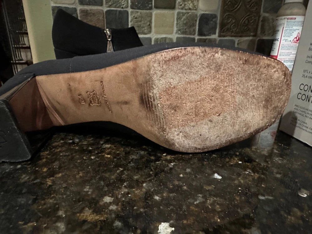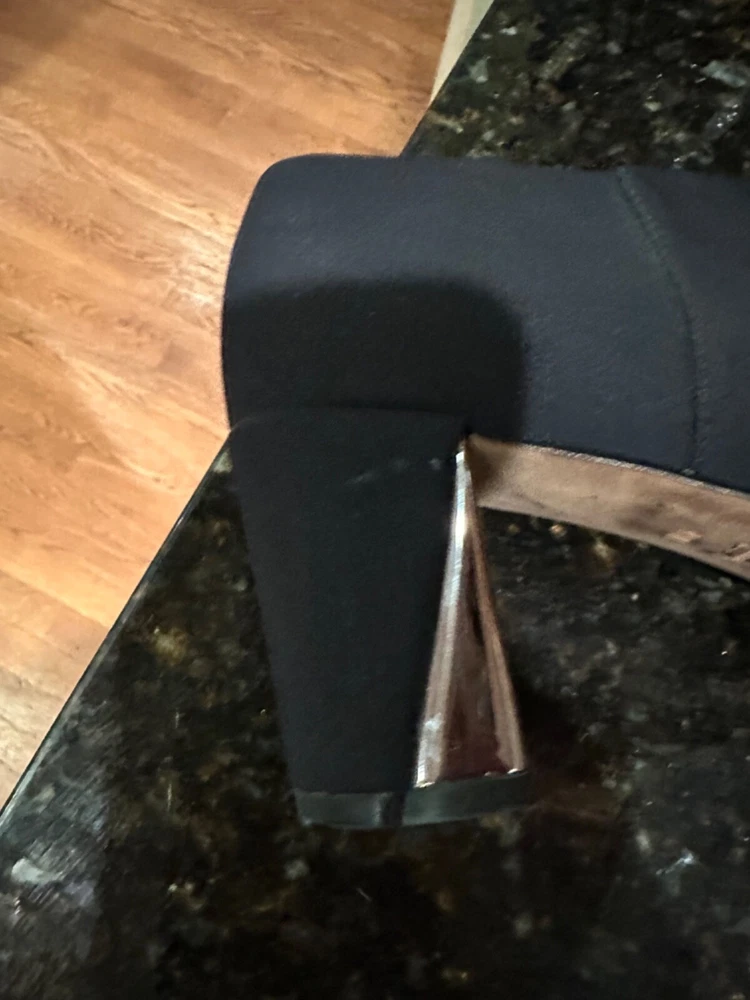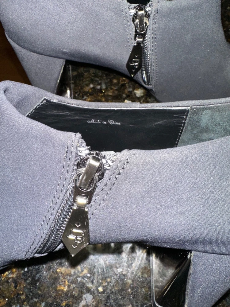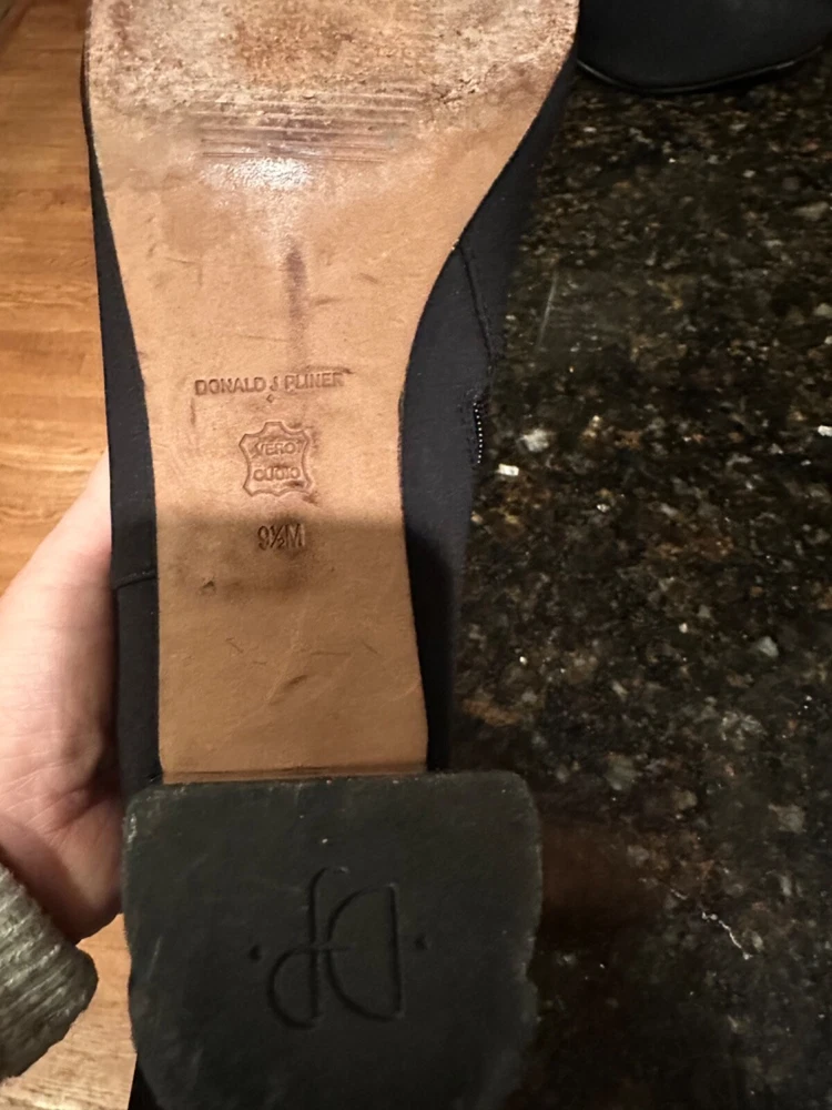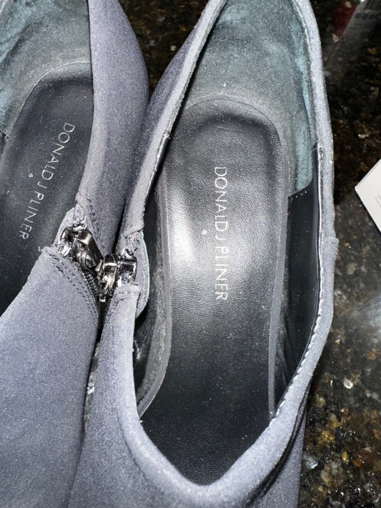 This listing is for a great Donald J. Pliner black stretch crepe booties with mirrored heels. Very good used condition--see close up photos for condition. Smoke free home. Shipping: Buyers to pay shipping cost per calculator below. Additional clothing items are $1 additional per item. Outside U.S. please contact for shipping rates. Make sure to add us to your favorites as new items are added daily.