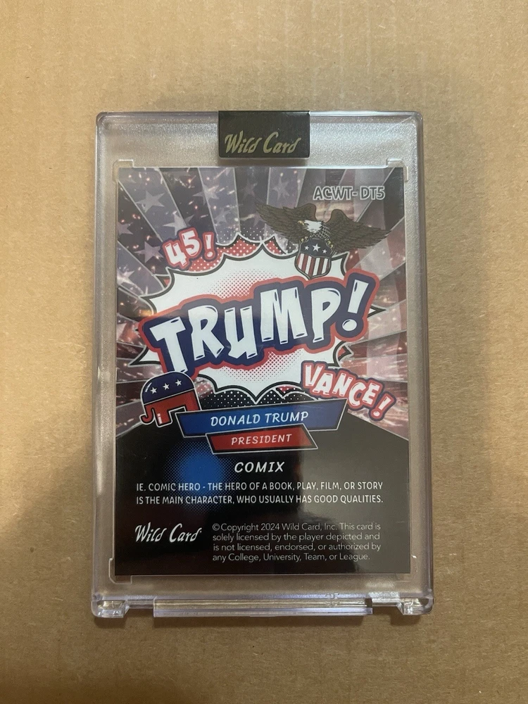 Features: Serial Numbered, Short Print Parallel/Variety: Commander In Chief Character: Donald Trump Graded: No Featured Person/Artist: Donald Trump Year Manufactured: 2024 Manufacturer: Wild Card Type: Non-Sport Trading Card Franchise: US Presidents Autographed: No Set: Election