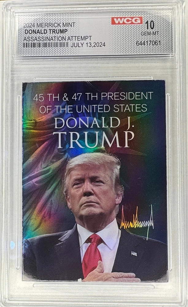 Donald Trump "Pledge to America" Historical Collectible Card – GEM-MT 10 Commemorate a defining era of American leadership with this stunning Donald J. Trump Collectible Card , graded GEM-MT 10 by WCG. This card celebrates the steadfast determination of the 45th and 47th President of the United States, Donald J. Trump, symbolizing his pledge to lead America to greatness with resilience and unwavering resolve. Card Highlights: Iconic Imagery: Featuring a bold portrait of Donald J. Trump in a solemn and determined pose, this card captures the essence of his promise to restore American values and greatness. Holographic Brilliance: Enhanced with a dazzling holographic design that makes this card a vibrant and visually striking collectible. Historic Significance: This card commemorates the defining events surrounding his leadership, with a focus on strength, determination, and his enduring legacy. Perfect Grading: Certified GEM-MT 10, ensuring flawless condition and exceptional value for collectors. Certificate of Authenticity: The reverse side of the card includes a Certificate of Authenticity , validating its role as part of the Merrick Mint's Greatest Presidents Collection. It emphasizes Trump’s dedication to preserving the ideals of the Founding Fathers and his efforts to "Make America Great Again." Why This Card Matters: Symbol of Leadership: This card embodies Trump’s commitment to the nation during one of its most transformative periods. Artistic and Historical Value: A combination of exquisite design and historical importance makes it a treasured keepsake. Rarity and Prestige: Limited production and a GEM-MT 10 grade ensure this card is both an investment and a piece of history. Perfect for Collectors and Patriots: Whether you are an avid collector, history enthusiast, or a proud supporter of President Trump’s vision, this card is an invaluable addition to your collection. It represents a pivotal chapter in America’s story and is a powerful testament to patriotism and leadership. Don’t miss the chance to own this remarkable Donald Trump "Pledge to America" collectible card—a timeless piece of history and inspiration. Order now!