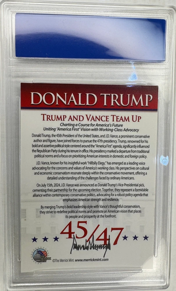 Donald Trump and J.D. Vance 2024 Campaign Collectible Card Celebrate a historic moment in American politics with this Donald Trump and J.D. Vance "Make America Great Again!" 2024 Campaign Card . This card commemorates the union of Donald Trump, the 45th and 47th President of the United States, and his Vice Presidential pick, J.D. Vance, as they chart a bold vision for America's future. Card Features: Dynamic Dual Portrait: Featuring Donald Trump and J.D. Vance side-by-side, symbolizing their united effort to lead America with strength, resilience, and a commitment to the "America First" agenda. Holographic Brilliance: The vivid, eye-catching design enhances the card's visual appeal, making it a centerpiece in any collection. Historic Campaign Slogan: "Make America Great Again!" and "Continuing the Legacy" encapsulate the enduring vision and determination behind the 2024 campaign. Certificate of Authenticity Included: The reverse side of the card features a detailed Certificate of Authenticity , highlighting the significance of Trump and Vance's collaboration. It outlines their shared commitment to the "America First" agenda, advocating for the concerns of the working class and redefining political norms. Why This Card is Exceptional: Historic Partnership: Commemorates the landmark announcement of J.D. Vance as Donald Trump's running mate for the 2024 Presidential Election, representing a powerful alliance within conservative politics. Artistic and Political Significance: This card combines striking visuals with the historical importance of their campaign, making it a treasured keepsake. Perfect for Collectors and Enthusiasts: Whether you're a political memorabilia collector, a supporter of Donald Trump and J.D. Vance, or someone who values the historical significance of modern elections, this card is a meaningful addition to your collection. Don't miss your chance to own this exclusive Donald Trump and J.D. Vance 2024 Campaign collectible card—a stunning and historic tribute to their shared vision for America. Order yours today!