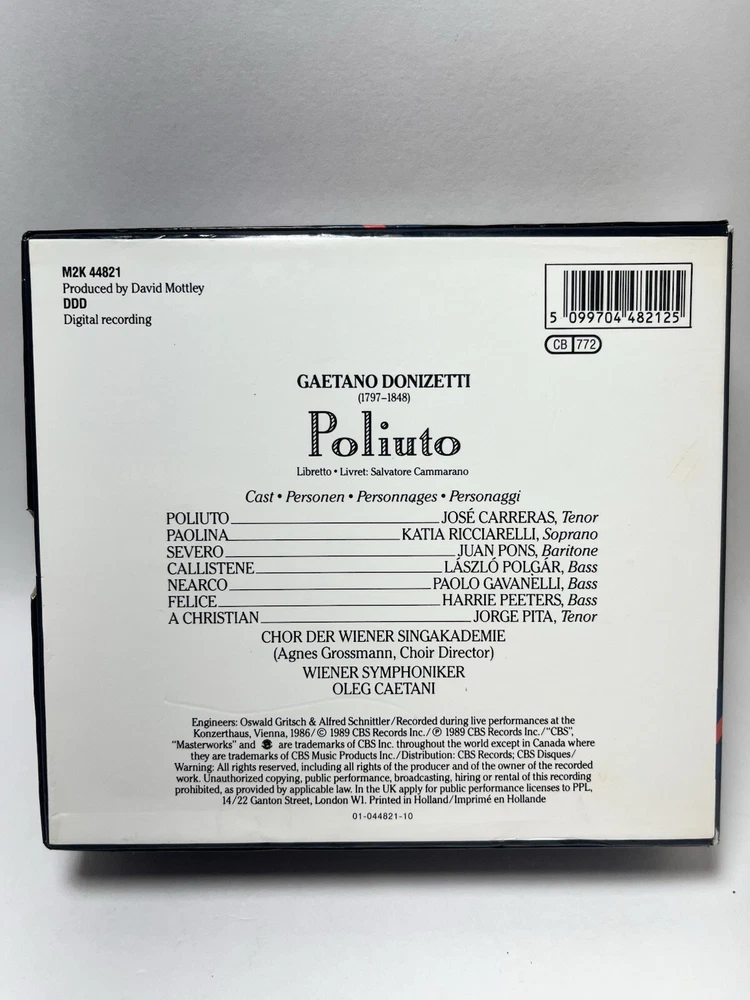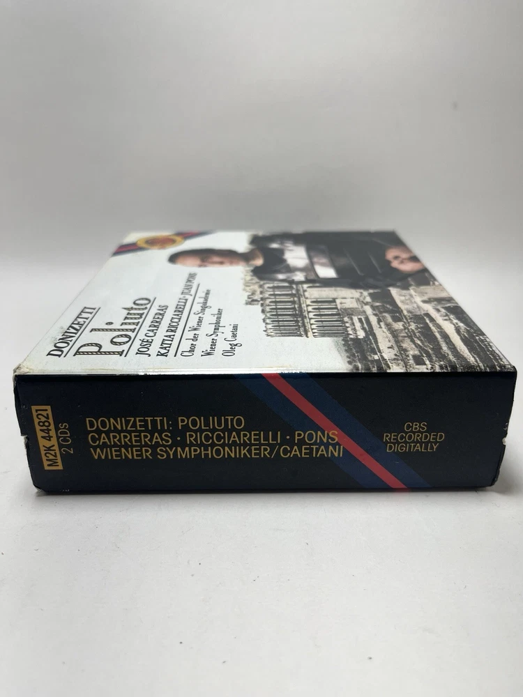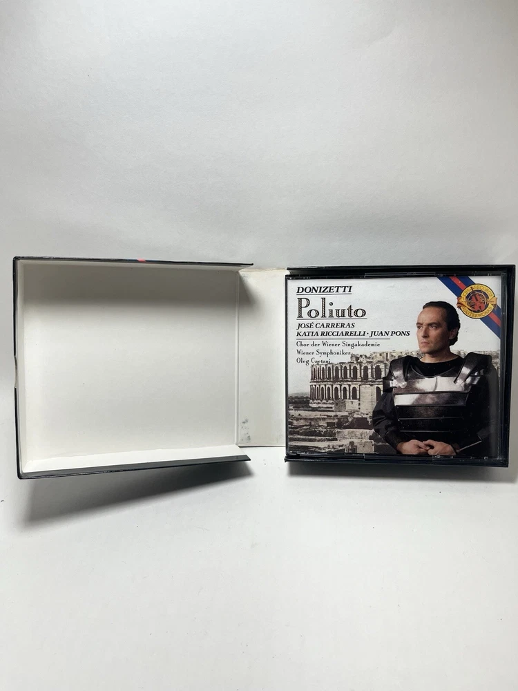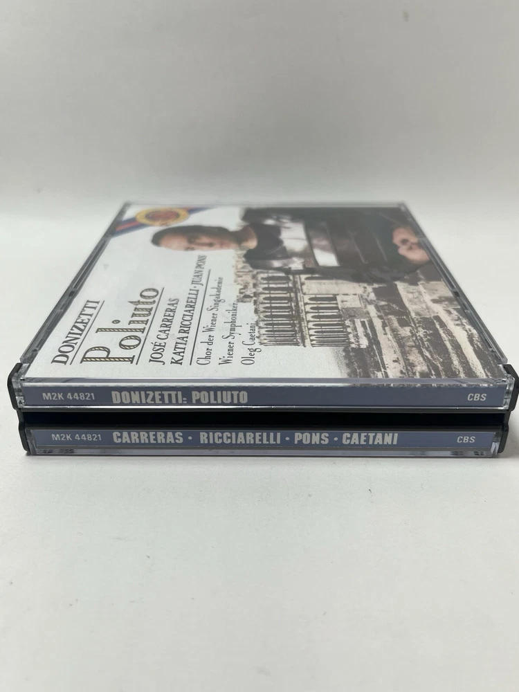 This is a listing for a Donizetti Poliuto Jose Carreras Katina Ricciarelli Juan Pons Oleg Caetani 2CD Set CBS. PLEASE SEE PHOTOS FOR THE PRODUCT YOU WILL RECEIVE! MORE PHOTOS ARE AVAILABLE UPON REQUEST! This set is in very good used condition. Overall, it has minimal signs of wear. The set includes the original box, inlay, and discs. The box has some small wear to the edges. The jewel case may have a few scratches and scuff marks to it, but the discs are in excellent used condition with no signs of any scratches. The inlay has no major signs of wear to it. PLEASE REACH OUT IF YOU HAVE ANY QUESTIONS OR OFFERS! If an item is purchased on business days between the hours of 12AM-10PM, the item will be in the mail shipped the following day.