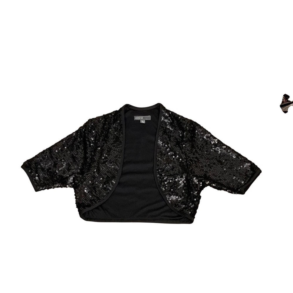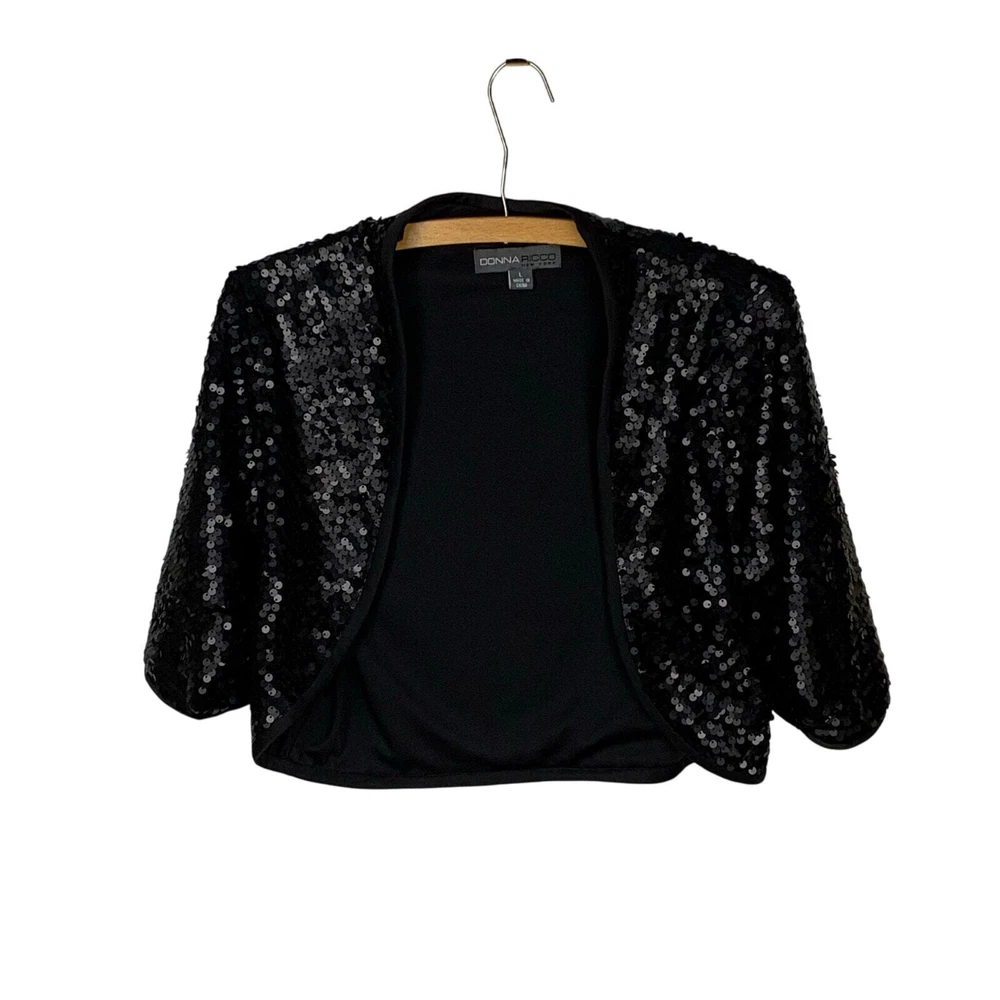 Donna Ricco Matte Black Sequined Bolero Shrug - Size L Short Sleeve Matte Sequins Cropped style Lined SIZE: L CONDITION: Excellent Used Condition MEASURMENTS: Bust: 17" Length (back of collar to hem): 18" *Consistent 5 Star Seller - Shipping M, W, F & SA *Feel free to Send me an OFFER - All Reasonable OFFERS Welcome! *From a Smoke-Free/Pet Friendly Home *Check out my closet for other similar sizes & don't forget to BUNDLE for more Discounts!! TAGS: Donna Ricco Matte Black Sequined Bolero Shrug - Size L Black sequined bolero Matte sequin shrug Donna Ricco cropped jacket Cropped formal bolero Short sleeve evening shrug Lined black bolero jacket Sequined formal jacket Cocktail party bolero Elegant sequin shrug Cropped sequin cover-up ophisticated holiday shrug Classic black bolero Maximalist evening bolero NYE sequin jacket Vintage-inspired shrug Wedding guest bolero Luxe sequin cover-up Formal cropped shrug Glam evening jacket Demure party bolero Holiday party shrug Special event cover-up New Year’s Eve jacket Wedding bolero jacket Gala-ready shrug Awards event bolero Christmas party outfit jacket Red carpet inspired shrug Festive layering bolero Metallic trend bolero