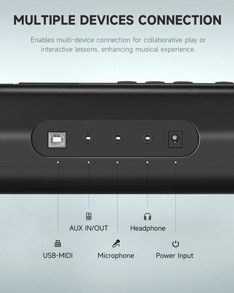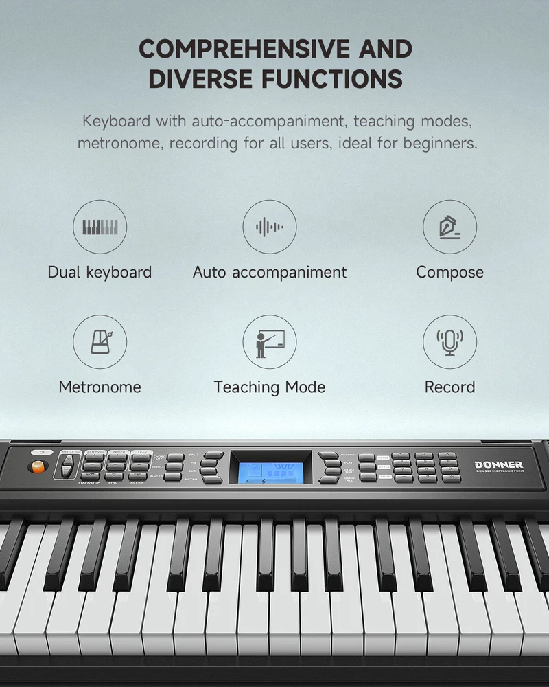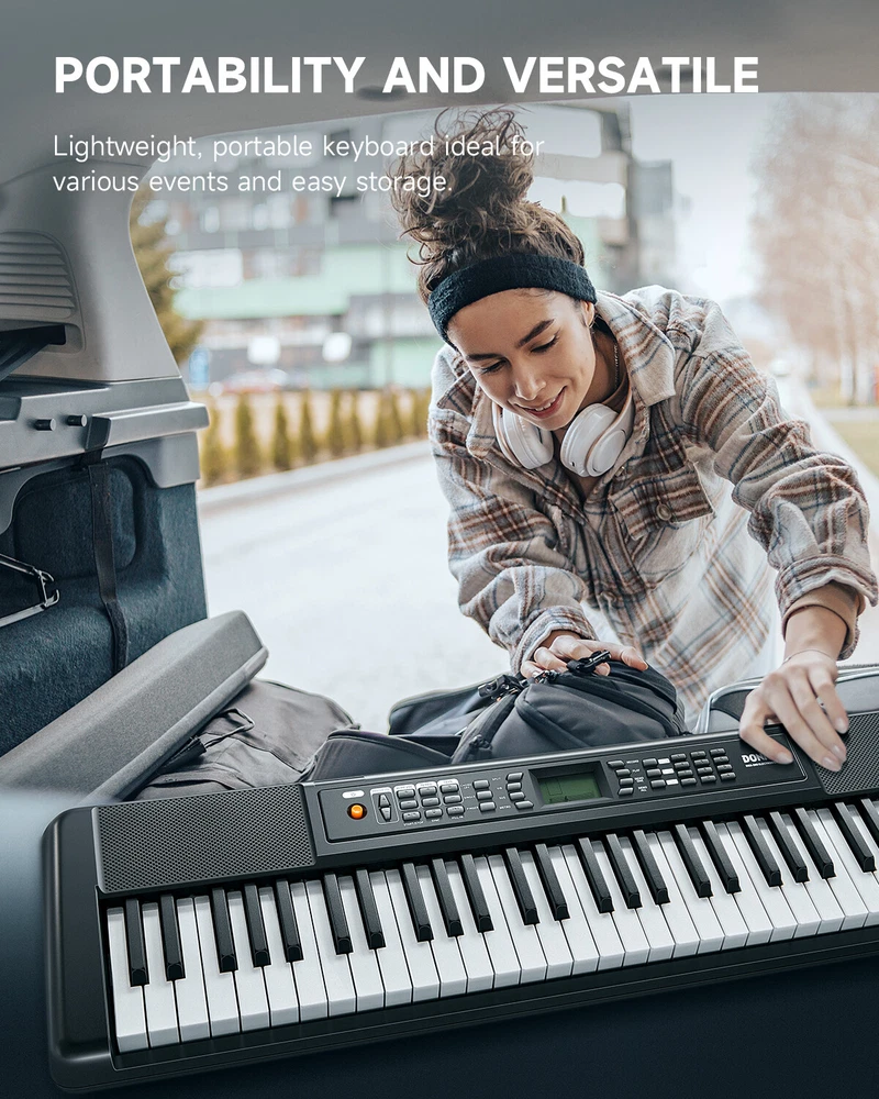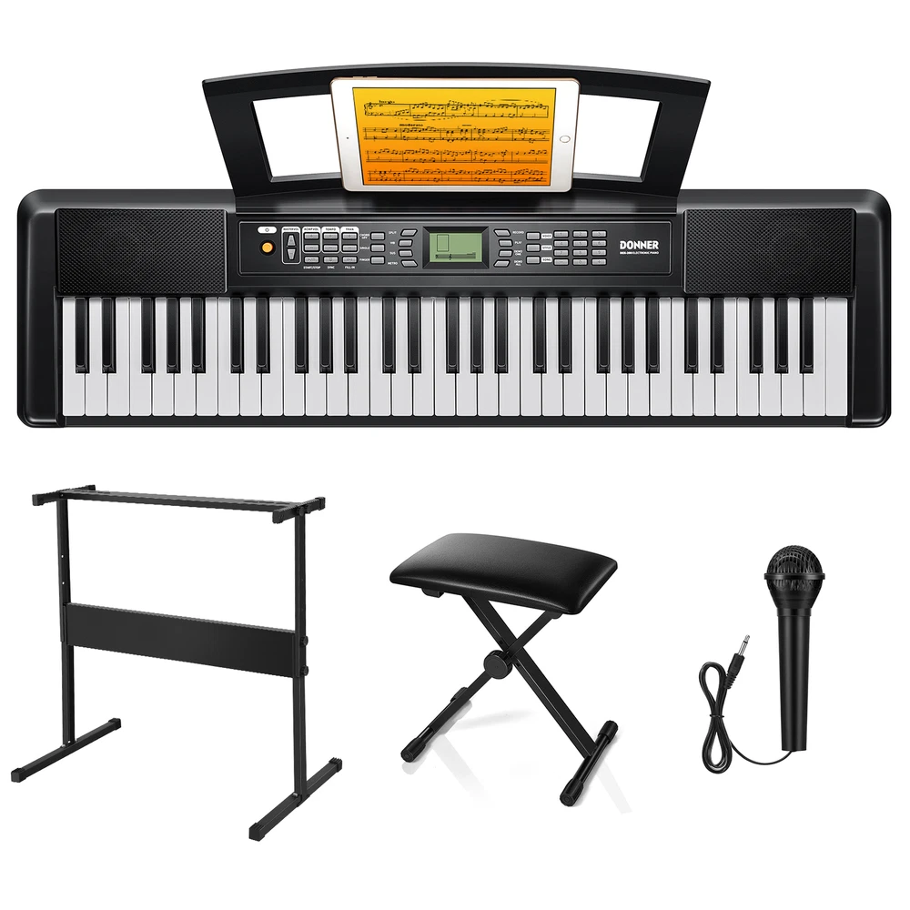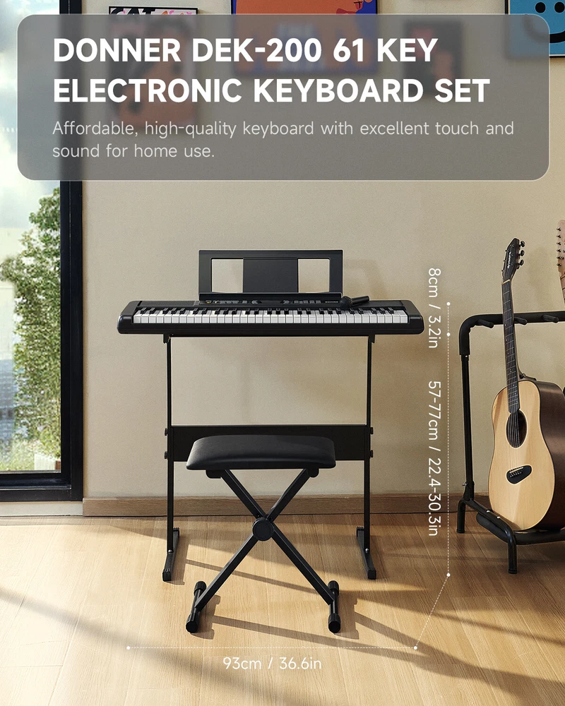 All-Inclusive Kit - The DEK-610S Piano Keyboard Kit includes an easy-to-assemble keyboard stand, an adjustable-height bench, a sheet music stand, a microphone, and a power adapter. It provides everything you need in one package. Unlimited Possibilities - With 32-note polyphony, 249 voices, 249 rhythms, 50 demo songs, and 3 teaching functions, you can unleash your creativity and enjoy band performances. HD Display - The 61-key beginner keyboard piano features an LCD display panel that shows the current functions and operations. Practice Makes Perfect - The "Record" feature allows you to capture your performances for timely correction. The headphones with a 1/8" jack enable private practice. Superior Sound & Portability - Equipped with two built-in 10W speakers, the DEK-610S electric piano delivers room-filling sound. Its slim piano body makes it portable and perfect for indoor or outdoor activities. All-Inclusive Kit - The DEK-610S Piano Keyboard Kit includes an easy-to-assemble keyboard stand, an adjustable-height bench, a sheet music stand, a microphone, and a power adapter. It provides everything you need in one package. Unlimited Possibilities - With 32-note polyphony, 249 voices, 249 rhythms, 50 demo songs, and 3 teaching functions, you can unleash your creativity and enjoy band performances. HD Display - The 61-key beginner keyboard piano features an LCD display panel that shows the current functions and operations. Practice Makes Perfect - The "Record" feature allows you to capture your performances for timely correction. The headphones with a 1/8" jack enable private practice. Superior Sound & Portability - Equipped with two built-in 10W speakers, the DEK-610S electric piano delivers room-filling sound. Its slim piano body makes it portable and perfect for indoor or outdoor activities. On Nov 11, 2024 at 01:25:26 PST, seller added the following information: