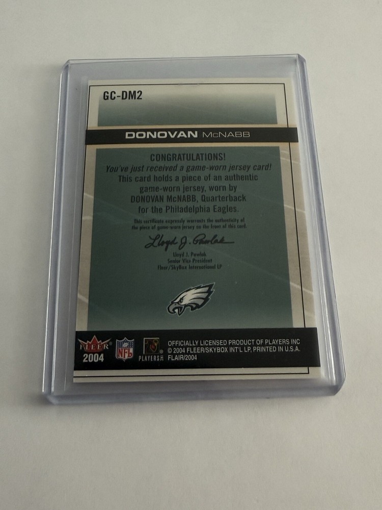 The Donovan McNabb 2004 Fleer Green Gridiron Cuts GU Jersey Eagles Card #GC-DM2 is a sports trading card featuring a memorabilia piece from Donovan McNabb, a former quarterback for the Philadelphia Eagles in the National Football League (NFL). This card is part of the 2004 Fleer set and includes a jersey relic from McNabb, making it a sought-after collectible for fans and collectors of football trading cards.