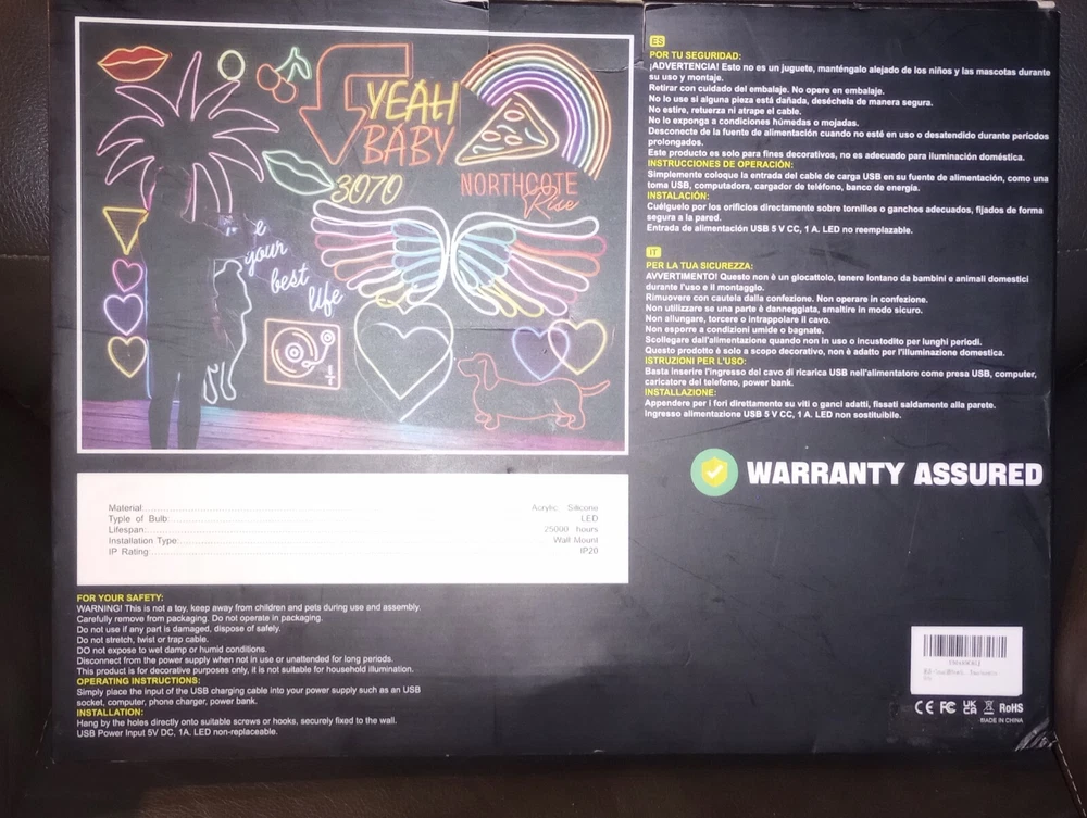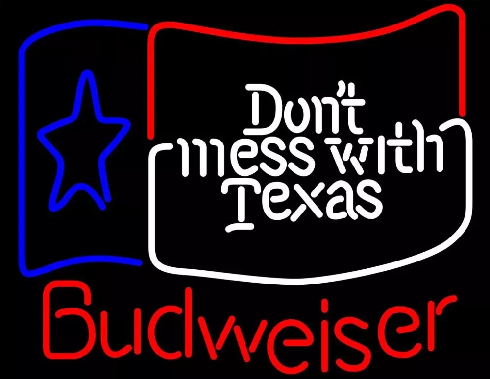 "D on't Mess with Texas" Budweiser---- NEON Sign Dimensions: approx 10" x 16" x 2" Product Features: Striking neon-style design with "Don't Mess with Texas" text over iconic Budweiser logo Equipped with adjustable dimmer control for customizable brightness (10%-100% range) Inline power switch provides easy access to on/off and dimming functions Flexible silicone LED tubing creates a vibrant, authentic neon-like glow Clear acrylic backing provides sturdy support and clean appearance Pre-drilled mounting holes with included hanging chain Lightweight construction (under 2 pounds) Technical Specifications: Power Source: Standard USB connection Operating Voltage: 5V DC (safe, low-voltage operation) Construction: Durable silicone LED strips on acrylic backing Lighting: Bright, energy-efficient LED technology Temperature: Cool-running design Easy plug-and-play installation Package Includes: LED Neon-Style Sign (12" x 18" x 2") USB Power Cord with Dimming Controller Mounting Chain Set Basic mounting hardware Key Benefits: Safe Operation: No glass, low voltage, minimal heat Energy Efficient: Low power consumption Durable Design: Impact-resistant materials Simple Setup: Just plug into any USB port Adjustable Light Output: Control brightness to suit your space Silent Operation: No buzzing or noise Basic Care: Dust with soft, dry cloth as needed Keep USB connection secure Avoid exposure to excessive moisture Sold as-is, all functions working including adjustabl e dimmer