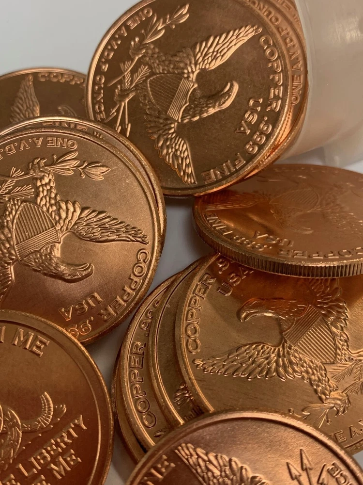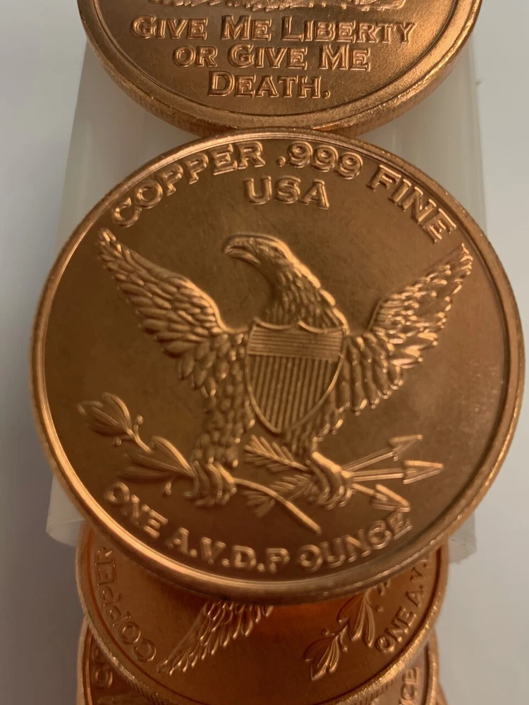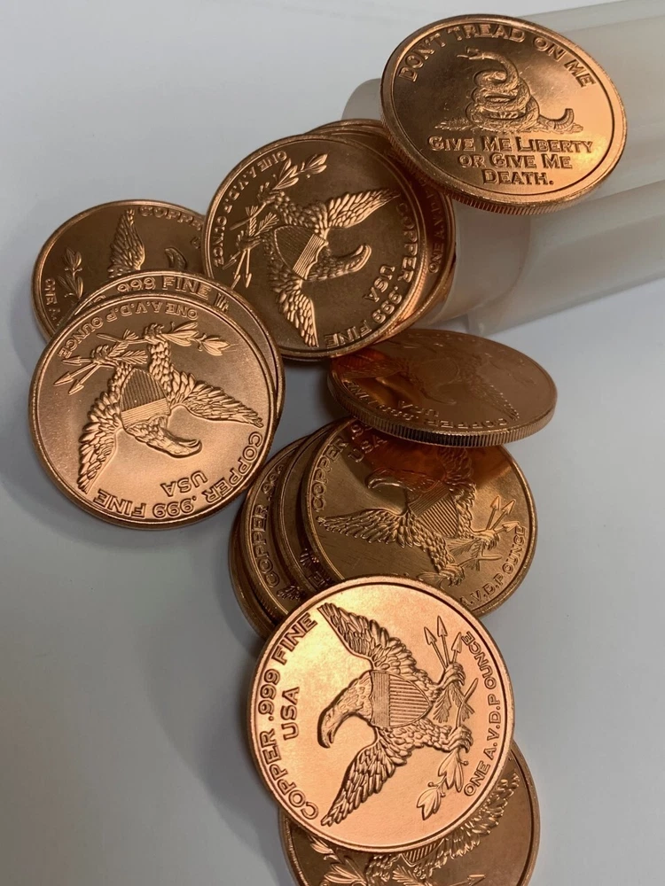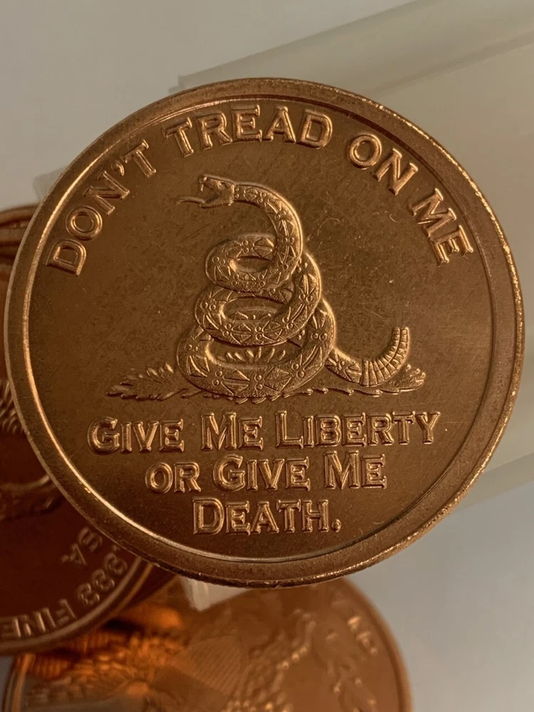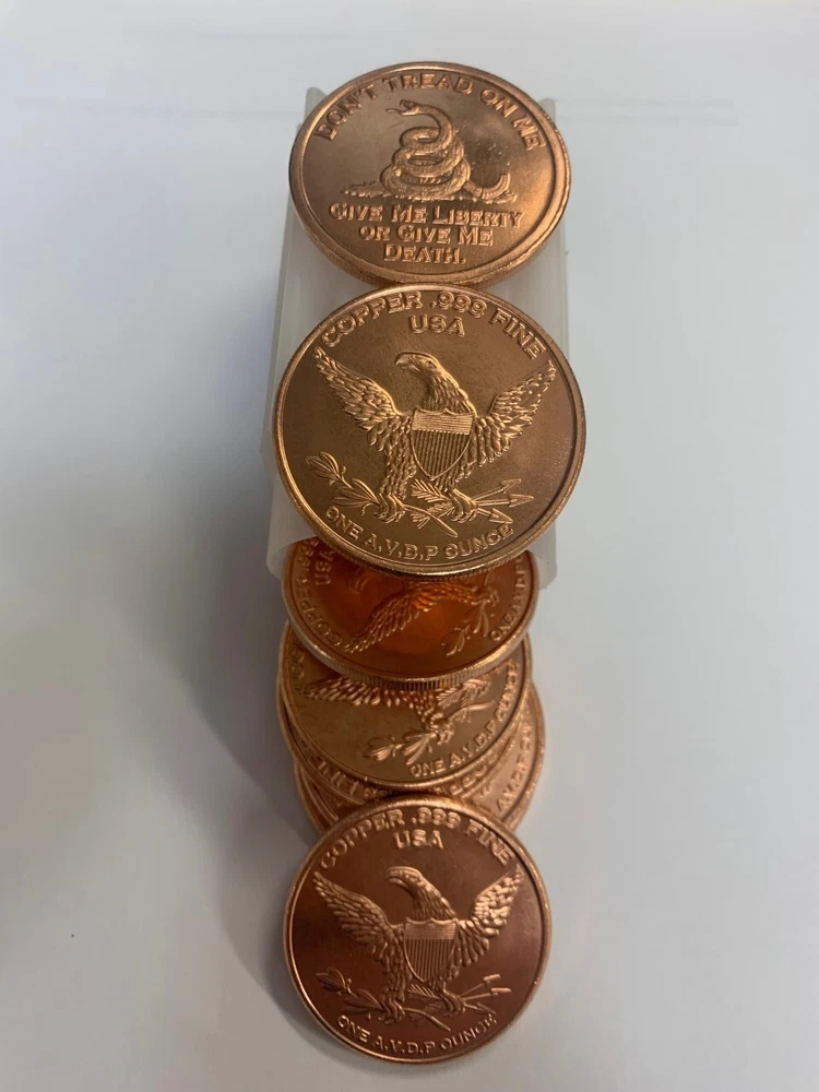You receive: 20 Don't Tread on Me, Give me Liberty or Give me Death. one ounce copper coins. These coins are made in the U.S.A. and are 99.9% pure, solid, copper. The coins come in a plastic tube with 20 coins. This is a full roll. Shipping is fast by REEDERSONG! Free Shipping! Free Returns! Wow!
