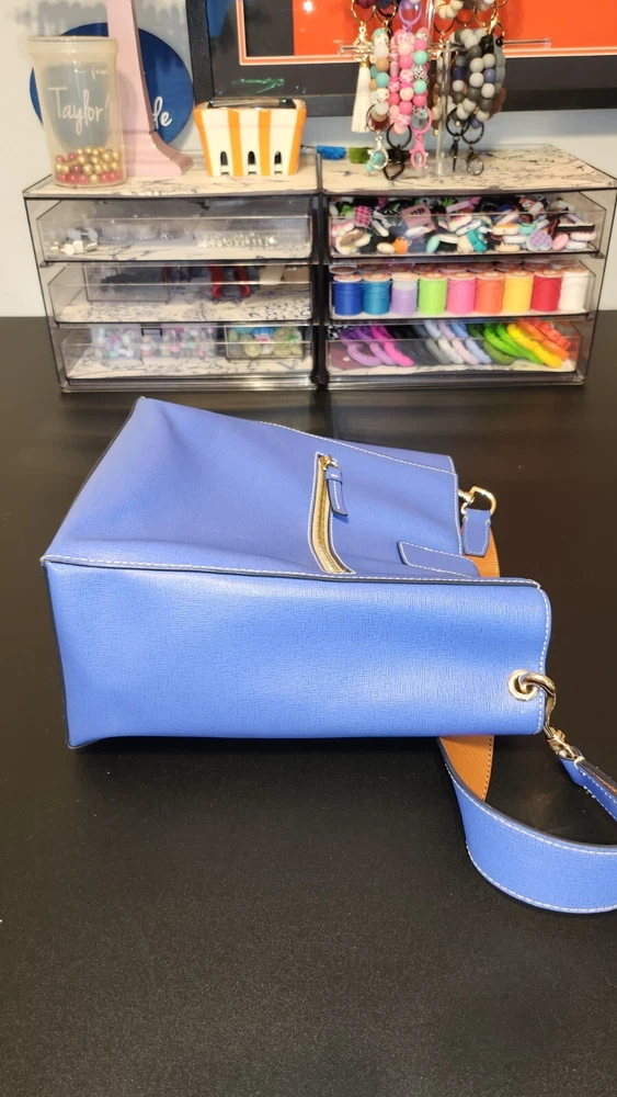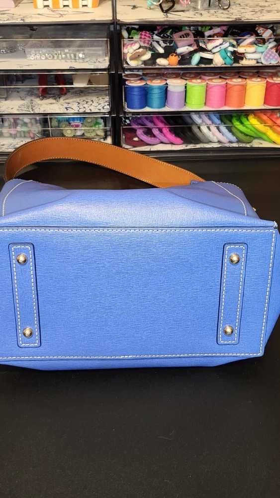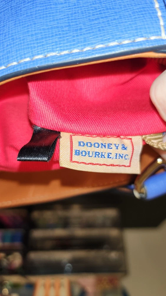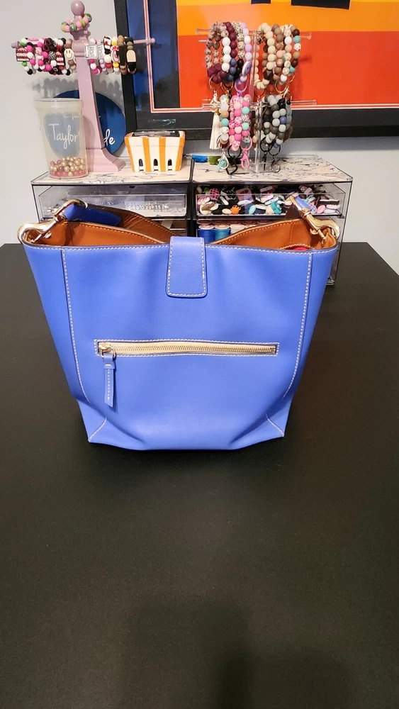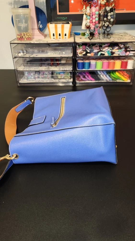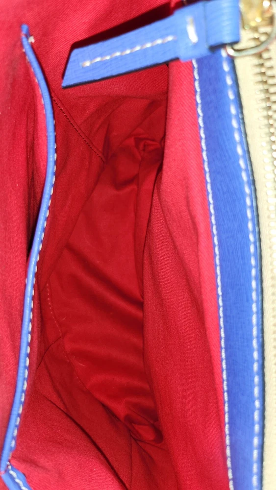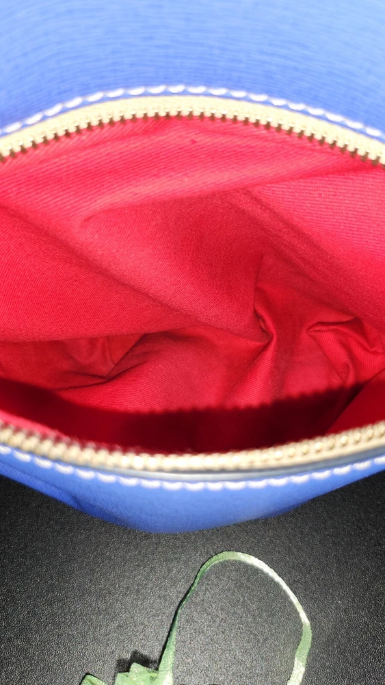 Beautiful, bold lapis blue saffiano leather bucket back with key fob. Red textile lining ~ Hook closure ~ Zippered back pocket ~ slip compartments and pockets inside. PLEASE SEE PHOTOS The inside middle pocket has small black marks from the buckle running back & forth on it. If you have that part zipped up, you don't know it there. Other than that, it's still in beautiful condition. ~ Please refer to the pictures to view item condition ~ ~ If you have any questions regarding this item, please feel free to message me ~ ~ If you prefer a different shipping option, please select before purchasing ~