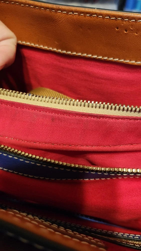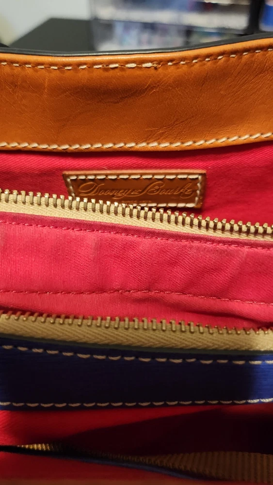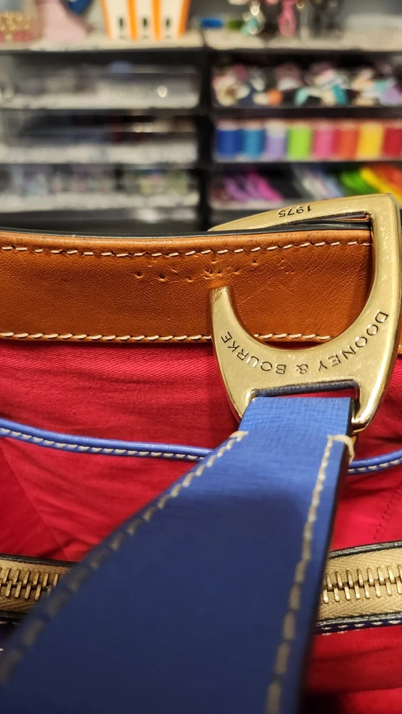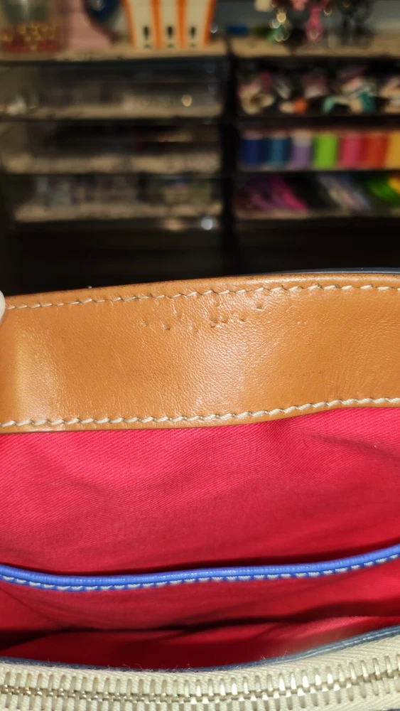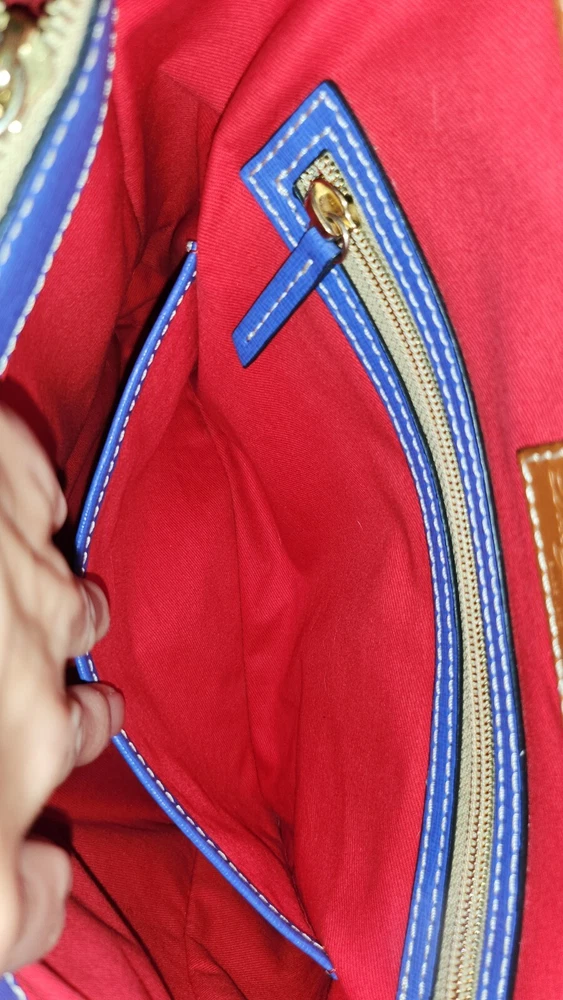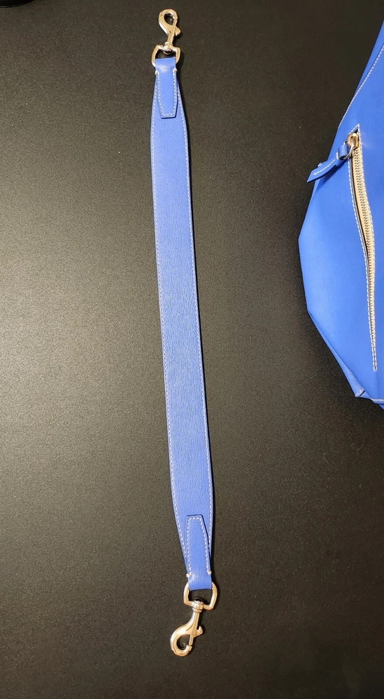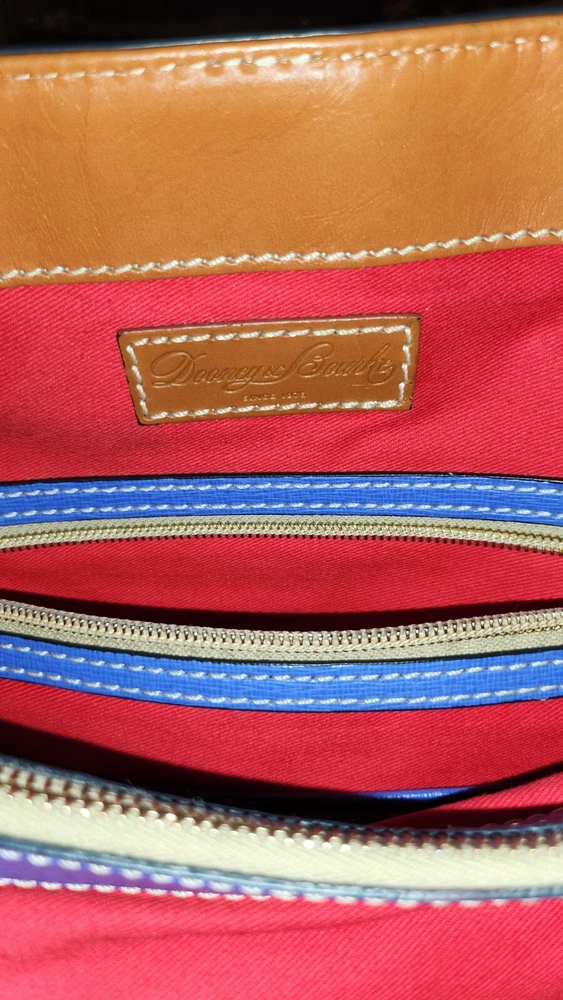 Beautiful, bold lapis blue saffiano leather bucket back with key fob. Red textile lining ~ Hook closure ~ Zippered back pocket ~ slip compartments and pockets inside. PLEASE SEE PHOTOS The inside middle pocket has small black marks from the buckle running back & forth on it. If you have that part zipped up, you don't know it there. Other than that, it's still in beautiful condition. ~ Please refer to the pictures to view item condition ~ ~ If you have any questions regarding this item, please feel free to message me ~ ~ If you prefer a different shipping option, please select before purchasing ~