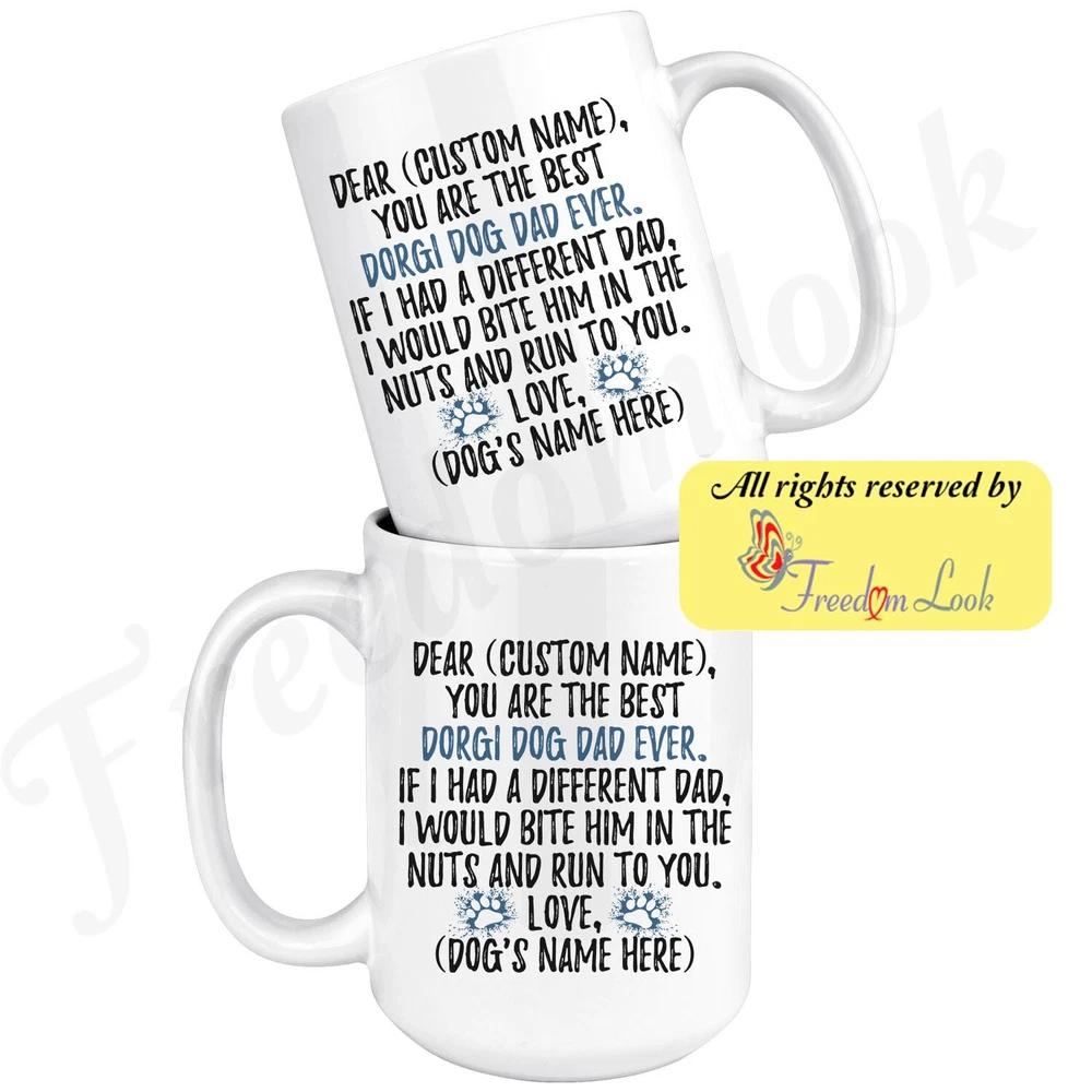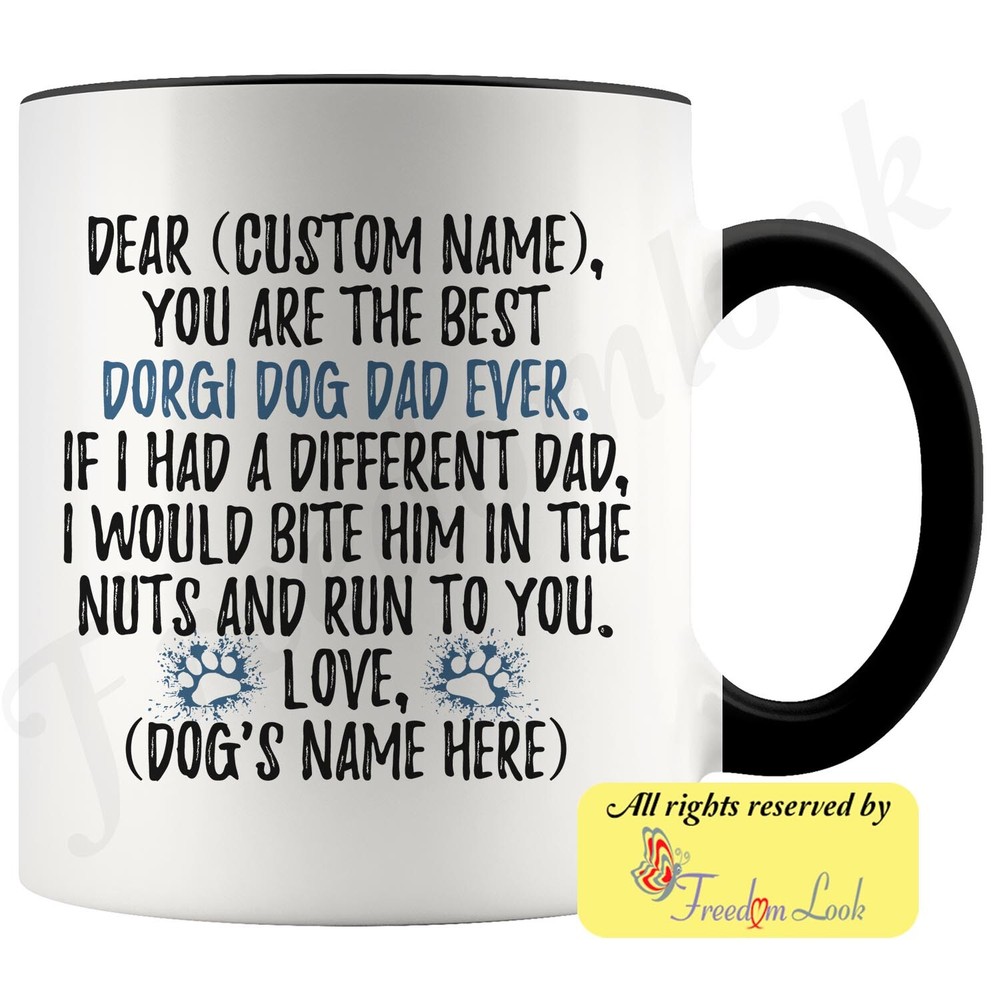 personalized dorgi dog mug, dorgi coffee mug, dorgie gifts, dorgi dad present gift, dorgi daddy mug, cross-breed dachshund & corgi dog mug, dachshund & corgi mix, dorgi dog owner, i love dorgi, custom dorgi gift, dog coffee cup, fathers day gift Are you looking for a great, unique and personalized gift for a dog owner? Search no more and get this mug TODAY. They will be thankful forever. Don't miss it because you'll regret it later by not getting it. This is the perfect coffee mug with content "DEAR 'CUSTOM NAME', YOU ARE THE BEST DORGI DOG DAD EVER. IF I HAD A DIFFERENT DAD, I WOULD BITE HIM IN THE NUTS AND RUN TO YOU. LOVE, 'DOG'S NAME HERE' ". CUSTOM DAD'S NAME AND DOG'S NAME Please put the dad's and dog's name in the notes at the checkout or just send us a message. By not doing this, it will delay your order. Example: Dad's name: Bill; Dog's name: Charlie A PERFECT FUNNY GIFT FOR A DORGI DOG DAD! This special coffee cup can be a great gift for every Dorgi dad. Sizes: Colored coffee mug size: 11 oz White coffee mug size: 11 oz or 15 oz DISHWASHER AND MICROWAVE SAFE! This version of ceramic mug shows it's true colors with quality assurance to withstand heat in the microwave and put it in the dishwasher as many times as you like, the quality will not be Altered. THE MUG DESIGN IS PRINTED ON BOTH SIDES! No matter if you hold your teacup in your right or left hand, you and everyone else will be able to see this unique design. Looking at this cute coffee mug will put a smile on everyone's face! We want you to be 100% satisfied, so please let us know if there is anything wrong with your order so we can fix it right away. We truly offer the most stunning, unique and trendy highest-quality products in the world. All of our products are custom-made-to-order and handcrafted to the highest quality standards. We stand by our products the quality is outstanding rest assured. Triple check your address , we copy addresses exactly as written, any undeliverable orders due to customer error are not our responsibility. Mug for every day. Christmas birthday brother sister mom mother father dad aunt grandma grandpa girlfriend gift
