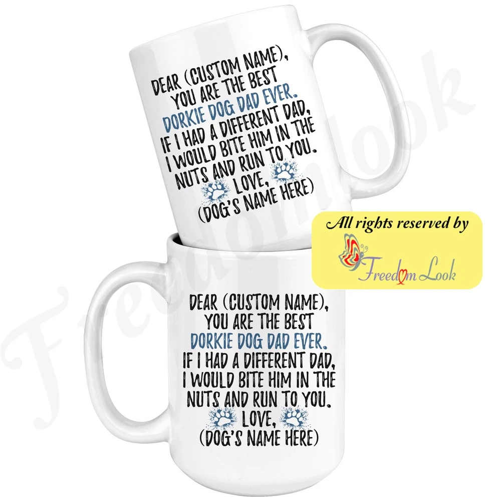 personalized dorkie dog mug, dorkie terrier coffee mug, dorkie gifts, dorkie dad present gift, dorkie dog daddy mug, dorkie dog owner, i love dorkie, custom dorkie gift, dog coffee cup, fathers day gift, cross-breed dachshund yorkie, dachshund yorkie mix Are you looking for a great, unique and personalized gift for a dog owner? Search no more and get this mug TODAY. They will be thankful forever. Don't miss it because you'll regret it later by not getting it. This is the perfect coffee mug with content "DEAR 'CUSTOM NAME', YOU ARE THE BEST DORKIE DOG DAD EVER. IF I HAD A DIFFERENT DAD, I WOULD BITE HIM IN THE NUTS AND RUN TO YOU. LOVE, 'DOG'S NAME HERE' ". CUSTOM DAD'S NAME AND DOG'S NAME Please put the dad's and dog's name in the notes at the checkout or just send us a message. By not doing this, it will delay your order. Example: Dad's name: Bill; Dog's name: Charlie A PERFECT FUNNY GIFT FOR A DORKIE DOG DAD! This special coffee cup can be a great gift for every Dorkie dog dad. Sizes: Colored coffee mug size: 11 oz White coffee mug size: 11 oz or 15 oz DISHWASHER AND MICROWAVE SAFE! This version of ceramic mug shows it's true colors with quality assurance to withstand heat in the microwave and put it in the dishwasher as many times as you like, the quality will not be Altered. THE MUG DESIGN IS PRINTED ON BOTH SIDES! No matter if you hold your teacup in your right or left hand, you and everyone else will be able to see this unique design. Looking at this cute coffee mug will put a smile on everyone's face! We want you to be 100% satisfied, so please let us know if there is anything wrong with your order so we can fix it right away. We truly offer the most stunning, unique and trendy highest-quality products in the world. All of our products are custom-made-to-order and handcrafted to the highest quality standards. We stand by our products the quality is outstanding rest assured. Triple check your address , we copy addresses exactly as written, any undeliverable orders due to customer error are not our responsibility. Mug for every day. Christmas birthday brother sister mom mother father dad aunt grandma grandpa girlfriend gift