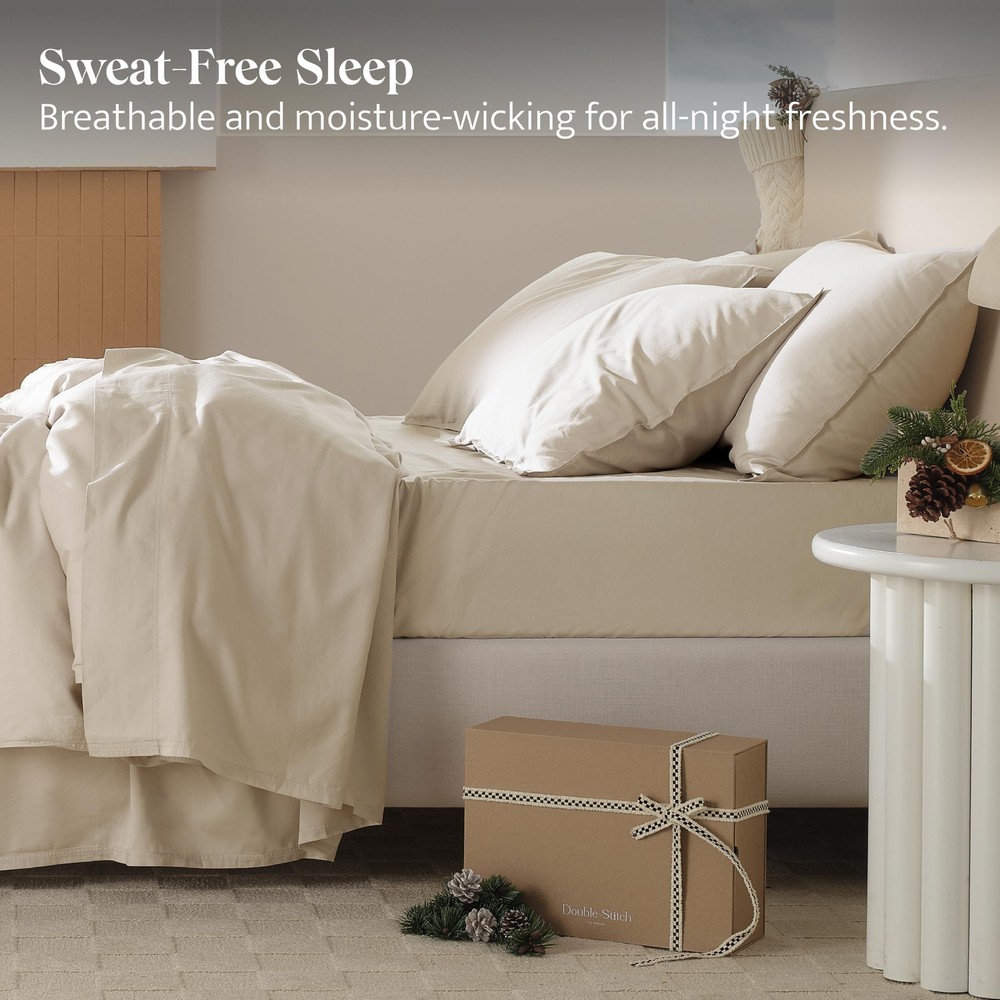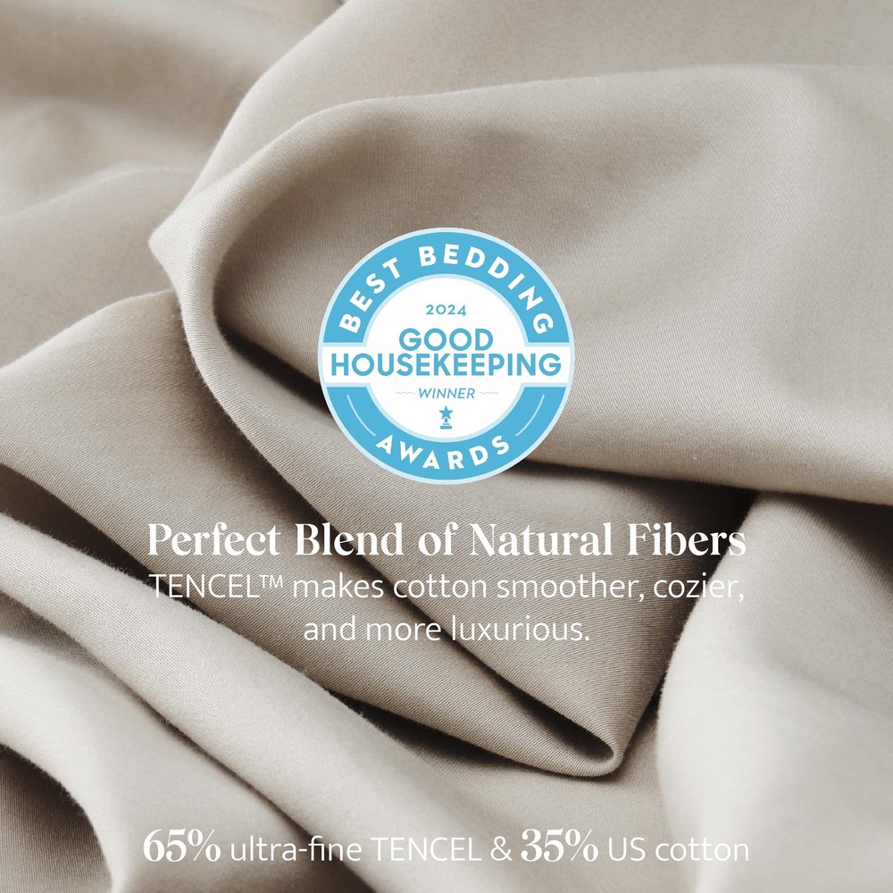 【Good Housekeeping Award 2024 Winner】: Our Cotton Tencel Series won the Good Housekeeping’s Best Bedding Award 2024 with cotton TENCEL lyocell blended cooling fabric. "It earned perfect scores for softness, comfort and overall satisfaction, my dog’s hair doesn't seem to stick in the fabric at all." — Good Housekeeping 【Exquisite Softness】: Crafted from premium US-grown OEKO-TEX certified cotton and TENCEL fibers known for their unparalleled softness. This sheet set goes through Double Stitch's proprietary garment washing process to create a superior hand feel. Ideal for sleepers looking to experience serenely smooth and cozy sheets. 【Natural Benefits】: Our carefully chosen blend of 65% TENCEL and 35% US-grown cotton provides the perfect balance of performance and luxury. With natural anti-wrinkle properties, these sheets also offer excellent resistance to pilling. Cooler than linen and more absorbent than 100% cotton, our Cotton TENCEL Sheet's moisture-wicking properties, temperature regulation, and long-lasting lifespan ensure a restful and comfortable sleep. 【Responsibly Sourced】: Designed for unparalleled comfort and to ensure we make informed choices for the planet. Crafted with US-grown OEKO-TEX certified cotton, recognized globally for its quality control practices, and TENCEL Lyocell True Carbon Zero fabric sourced from eucalyptus trees grown in sustainably managed forests. The production process recycles nearly all solvents, curbing undue ecological impact and ensuring that your comfort doesn't come at the cost of the environment. 【Thoughtful Details】: Our Cotton TENCEL Sheet Set features our signature double-stitched detailing for enhanced durability and a deep pocket to fit mattresses up to 16". Comes as a complete set of a fitted sheet, top sheet, and two pillowcases. Every detail and color is designed with your comfort in mind to provide a blissful sleep experience.