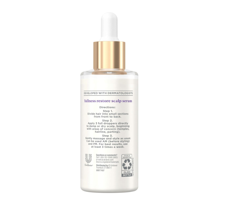 Dove Beauty Density Boost Scalp Repairing Hair Serum - 2oz Achieve thicker, fuller hair with the Dove Beauty Density Boost Scalp Repairing Hair Serum . This lightweight, non-greasy serum is specially formulated to nourish the scalp and support hair density, making it perfect for those with thin or fine hair. With its refreshing scent and fast-absorbing formula, it helps promote a healthy scalp while strengthening hair from the root. Key Features: Supports Thicker, Fuller Hair – Boosts hair density and enhances volume. Strengthens Hair from the Root – Nourishes and fortifies hair strands. Lightweight & Non-Greasy – Fast-absorbing without leaving residue. Smooth & Soft Texture – Leaves hair feeling soft and manageable. Frizz Control – Reduces flyaways for a sleek and polished finish. Suitable for Thin & Fine Hair – Ideal for those looking to enhance hair thickness. Infused with Nutrients – Helps to maintain scalp health for healthier-looking hair. Size: 2oz (59 mL) Formulation: Lightweight serum designed to repair and nourish the scalp, improving hair density. Scent: Light and refreshing fragrance, providing a clean and pleasant scent without being overpowering. Country/Region of Manufacture: USA MPN (Manufacturer Part Number): 10011111396405 Expiration Date: Best used within 2-3 years from the manufacturing date. Period After Opening (PAO): 12 months for optimal use after opening. California Proposition 65 Warning: This product may contain chemicals known to the State of California to cause cancer, birth defects, or other reproductive harm. For more information, visit www.P65Warnings.ca.gov . Ingredients: Aqua (Water) Glycerin Dimethicone Polyquaternium-11 Panthenol (Pro-Vitamin B5) Tocopheryl Acetate (Vitamin E) Caffeine Menthol Fragrance (Parfum) Sodium Chloride Citric Acid Phenoxyethanol Ethylhexylglycerin Active Ingredients: Caffeine – Helps stimulate the scalp and promote hair growth. Panthenol (Pro-Vitamin B5) – Known for strengthening and moisturizing hair. Tocopheryl Acetate (Vitamin E) – Supports healthy scalp and hair, acting as an antioxidant. Shop with confidence! To ensure your order arrives as quickly as possible, all orders placed on business days and before the postal office's closing time will be shipped the same day . We are committed to packaging each item with the utmost care to ensure it arrives safely and in perfect condition. If you have any questions or concerns, feel free to contact us. Thank you for your purchase!