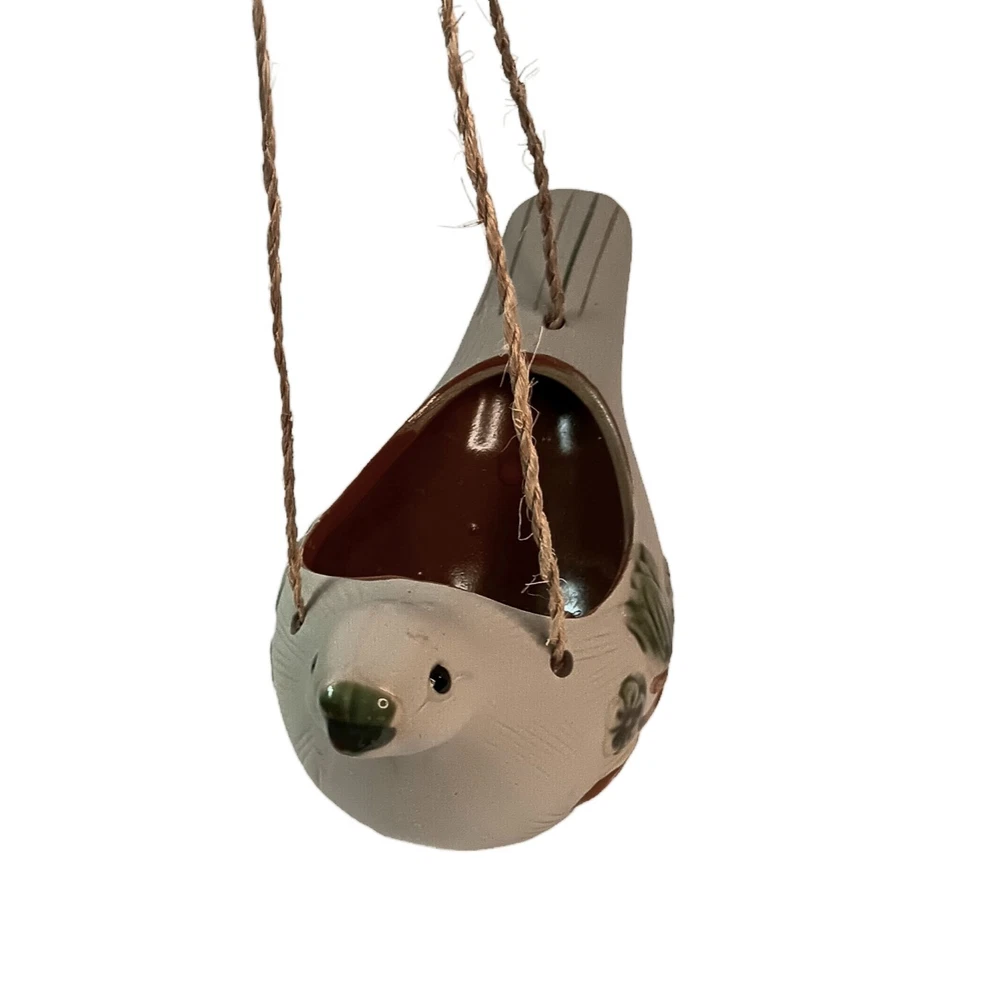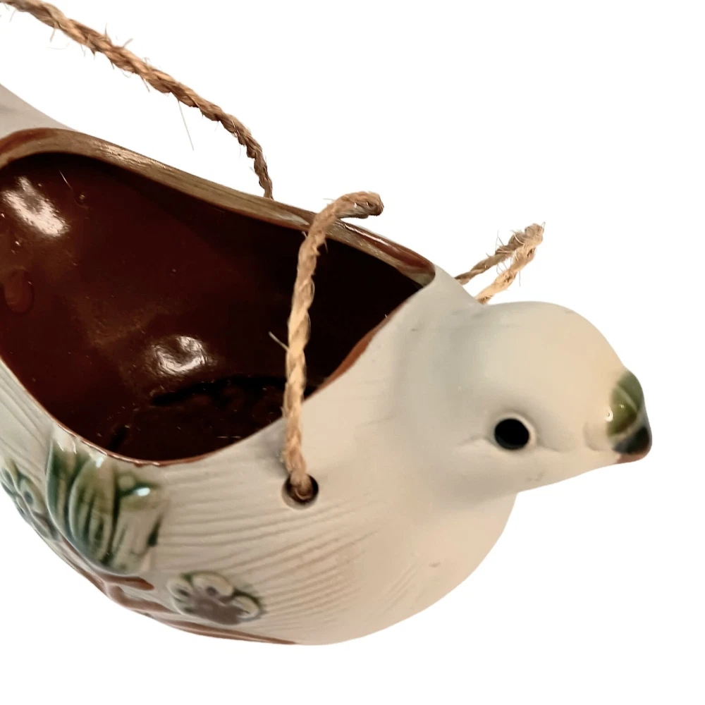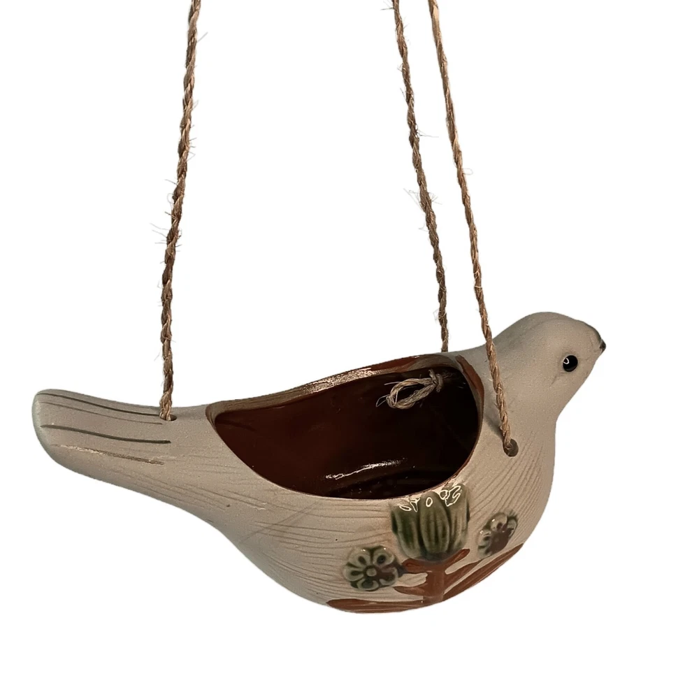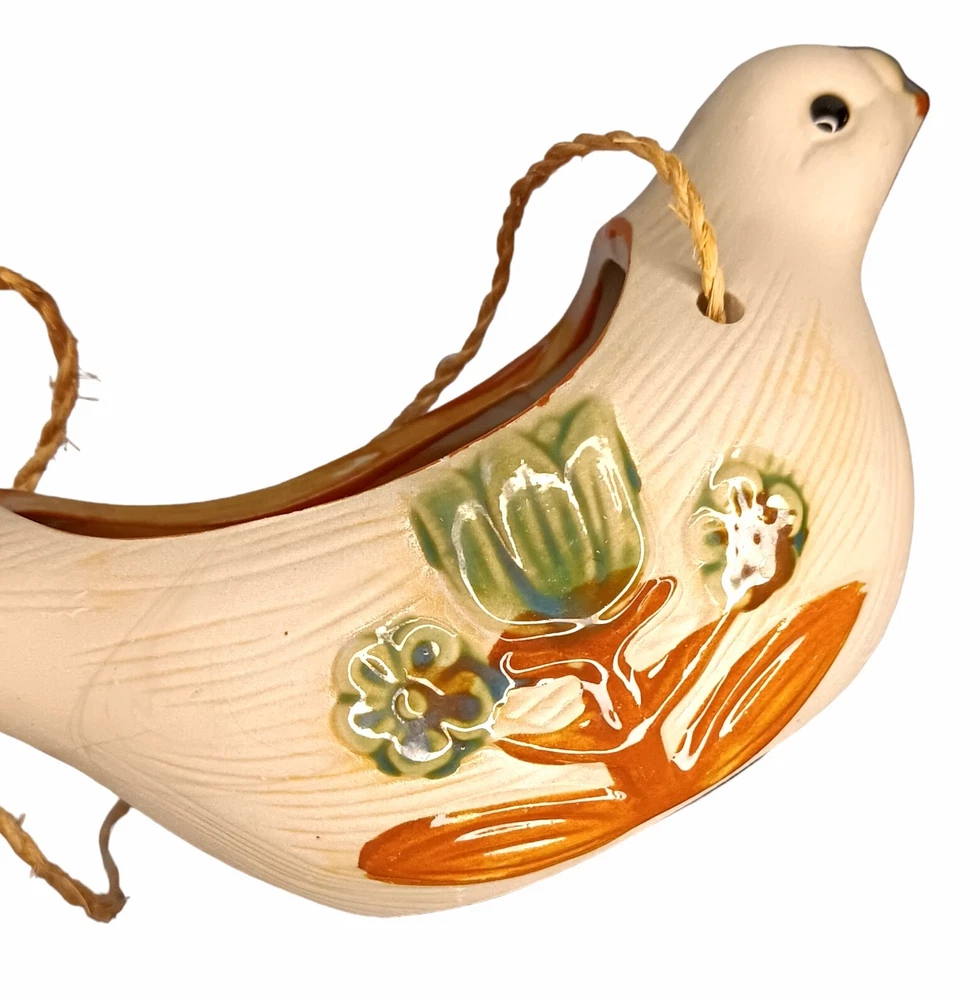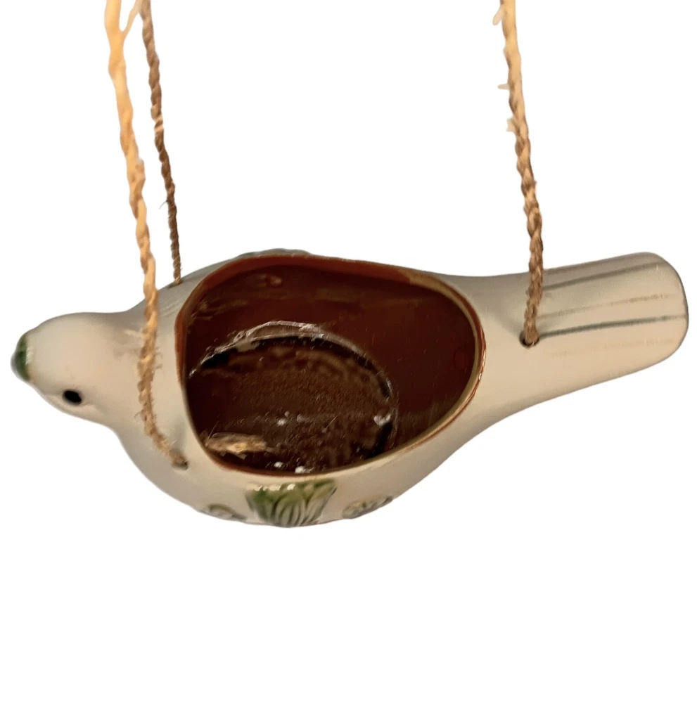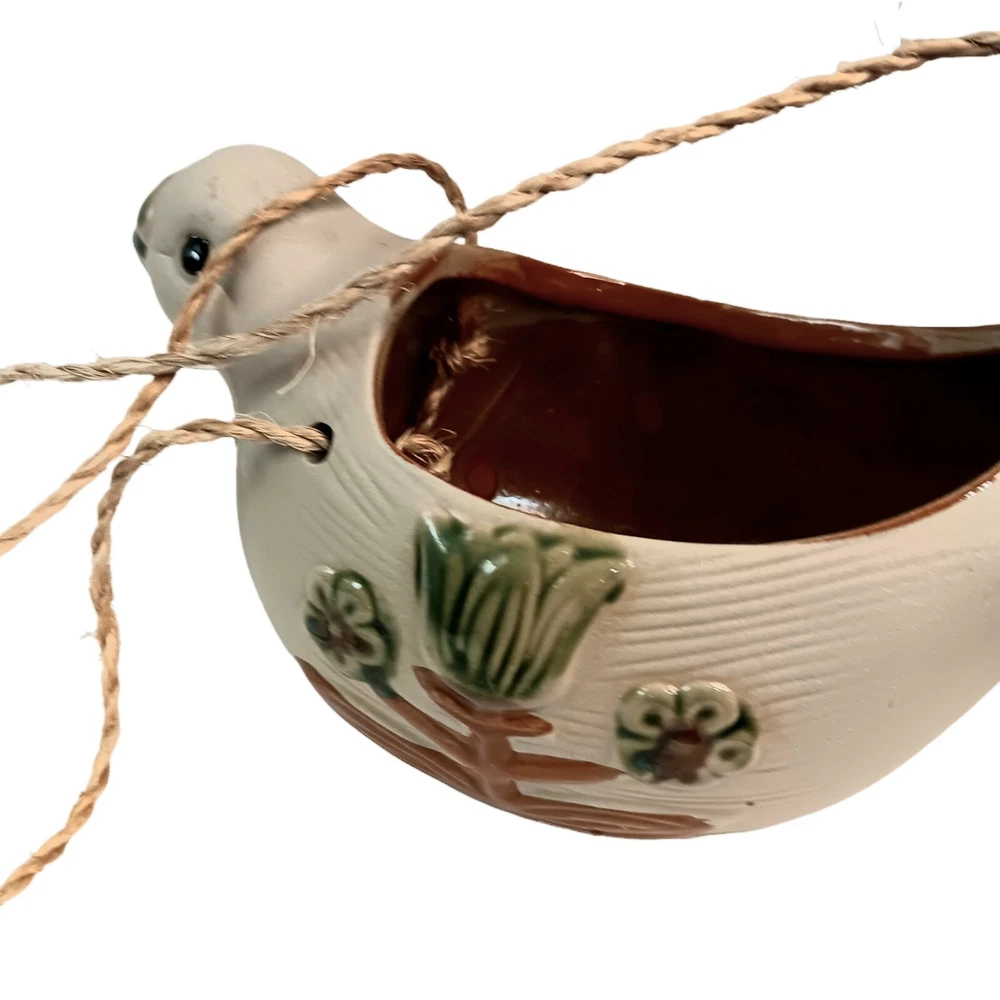 Vintage Dove Bird Ceramic Hanging Planter Pot Pottery Figural Folk Art Earthenware Three holes in the planter with twine for hanging Planter does not have drainage holes Approximately 8" x 4" Excellent condition with wear that is consistent with age. No chips or cracks.