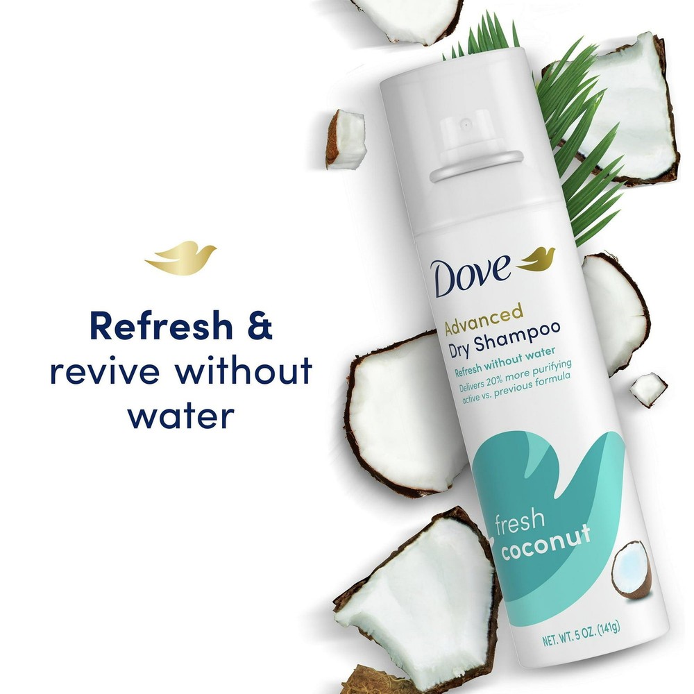 Dove Advanced Dry Shampoo Spray, Fresh Coconut, Absorbs Excess Oil, Refresh Without Water, 5 Ounce (Pack Of 3) Dove Advanced Repairing Dry Shampoo, Fresh Coconut, Need to get ready in a hurry? Pressed for time after a gym session? Whatever the reason, now you can have hair that looks and feels clean without having to wash it using this waterless shampoo spray. Dove Volume Fullness Dry Shampoo Hair Volumizer Spray works with just a few quick sprays and leaves you with hair that is volumized and looks and feels beautiful, healthy and full of body. About this item Dove Advanced Fresh Coconut Dry Shampoo absorbs excess oil to refresh and revive hair between washes, leaving it looking beautiful and soft This dry shampoo features a weightless formula that instantly absorbs oil to rejuvenate hair between washes Dove Advanced Fresh Coconut Dry Shampoo features the light scent of coconut and sweet lime to leave hair smelling fresh and clean Our weightless formula delivers 20% more natural tapioca and actually cleanses greasy hair by removing oil and odor between washes Spritz this waterless dry shampoo at the roots in sections. Massage into roots and brush through hair. For best results, spray this dry shampoo 8-12 inches from hair This dry shampoo spray is the perfect addition to your cruelty-free hair care collection Dry shampoo spray will save you time and ensure you stay confident with the way your hair looks and feels. When you don't have time for a full hair wash with water, Dove volumizing dry shampoo quickly helps to reduce the oily, greasy feel of unwashed hair, leaving it easy to style and manage. Ingredients Isobutane, Propane, SD Alcohol 40-B (Alcohol Denat.), Aluminum Starch Octenylsuccinate, Butane, Fragrance (Parfum), Isopropyl Myristate, Silica, Cocos Nucifera (Coconut) Fruit Extract|Ingredients correct at time of publishing. Always check product packaging.