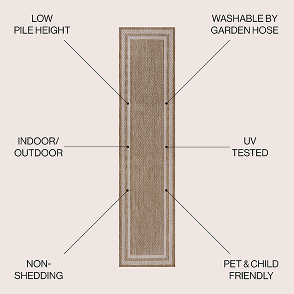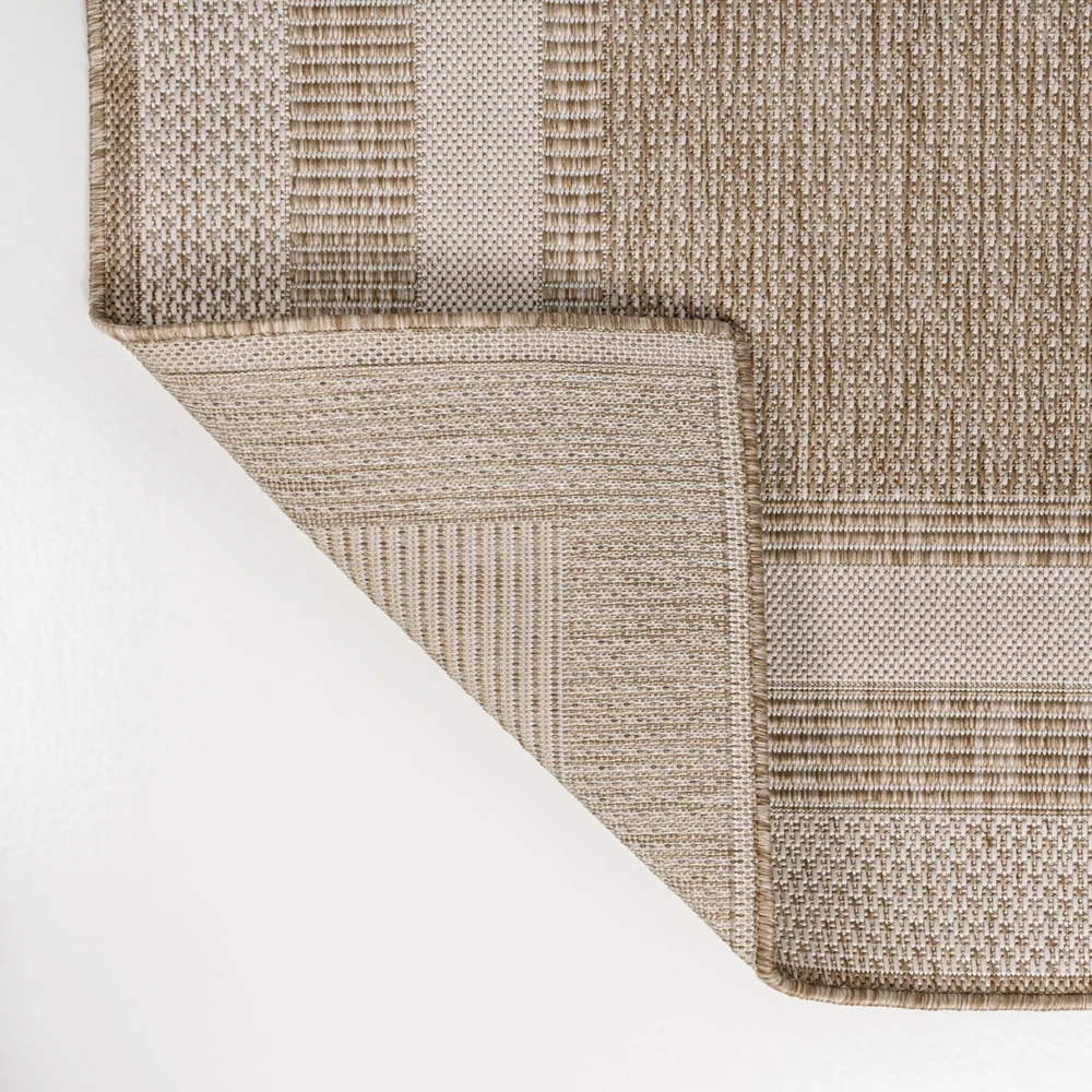 Our classic border rug has three wide stripes with a plain center field. It's woven from durable synthetic fibers in a -tone design. Use this easy-care, family-friendly rug on the porch or deck, or in high traffic spaces like a living room, room or entry. Power loomed design with a short 0.23" pile Mingled threads form a -tone design in beige and cream Durable power loomed construction is made from easy-care polypropylene 100% Polypropylene No backing, use of rug pad is recommended (sold separately)