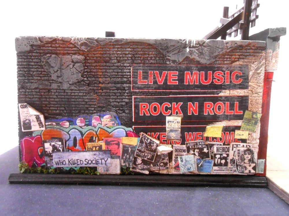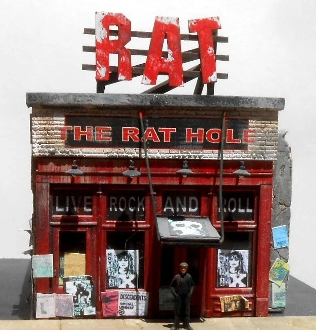 Brand New release from Downtown Deco! It includes hydrocal castings featuring amazing detail, full color custom decals, punk flyers, laser cut "RAT" sign, and complete, full color, easy to understand assembly, painting and aging instructions. I think that this is my best release to date! 2" x 2 3/4th". (Note; HO pilot model shown, slight details may vary). Cheers! Randy/Downtown Deco The best kits you can buy for 3 reasons!! One. Attention to detail & realism. All of the original pattern work is hand carved by an artisan for maximum realism. This allows Downtown Deco kits to include details you'll never find in other kits. Missing and chipped bricks, "ghost' staircases and walls, crumbling stucco and cracked and weathered concrete. If you can find it in real life you'll see it in a Downtown Deco kit! Two. Ease of construction. We try & keep the kits simple so you can get to the fun part (painting & weathering the buildings) in about 30 minutes. Our instructions are second to none, with complete, easy to understand instructions that walk you through each and every step along the way, from basic assembly to painting & weathering the model. Three. Customer service. Got a question about weathering your model? Give us a call. End up with a broken part somehow? We'll replace the parts for free. Paint your first hydrocal kit & you're unhappy with the way it came out? Drop us an email & we'll send you a second set of castings so that you can try again. Why do we do this? Because we want you to have fun with our kits and to be happy with your finished results. If you need anything at all touch base with us & we'll help you out. Our customer service is second to none. 100% positive feedback! If you want your layout to stand out & are sick of seeing the same handful of buildings on every N Scale layout you see these kits are the ones for you!! Take a good look at the detail & be honest with yourself, wouldn't these look better on your layout than the run of the mill plastic kits everyone else has?
