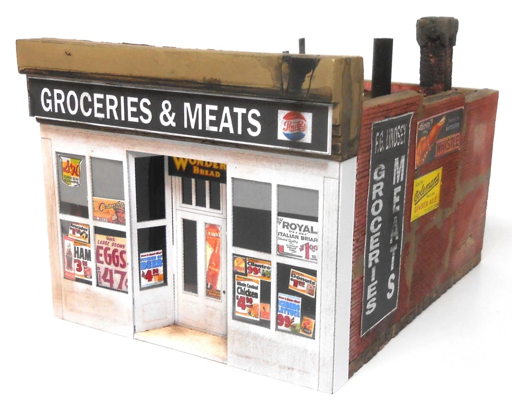 Look at this new kit kit! Classic small town grocery store, perfect for any layout! This kit features hydrocal castings chock full of the funky detail we're known for, full color signs , plastic doors/windows, roof details & complete, easy to understand assembly, painting & aging instructions. Figures not included but will throw in a $25 set of our details castings (60+ pieces!) at no extra charge! The best kits you can buy for 3 reasons!! One. Attention to detail & realism. All of the original pattern work is hand carved by an artisan for maximum realism. This allows Downtown Deco kits to include details you'll never find in other kits. Missing and chipped bricks, "ghost' staircases and walls, crumbling stucco and cracked and weathered concrete. If you can find it in real life you'll see it in a Downtown Deco kit! Two. Ease of construction. We try & keep the kits simple so you can get to the fun part (painting & weathering the buildings) in about 30 minutes. Our instructions are second to none, with complete, easy to understand instructions that walk you through each and every step along the way, from basic assembly to painting & weathering the model. Three. Customer service. Got a question about weathering your model? Give us a call. End up with a broken part somehow? We'll replace the parts for free. Paint your first hydrocal kit & you're unhappy with the way it came out? Drop us an email & we'll send you a second set of castings so that you can try again. Why do we do this? Because we want you to have fun with our kits and to be happy with your finished results. If you need anything at all touch base with us & we'll help you out. Our customer service is second to none. 100% positive feedback!