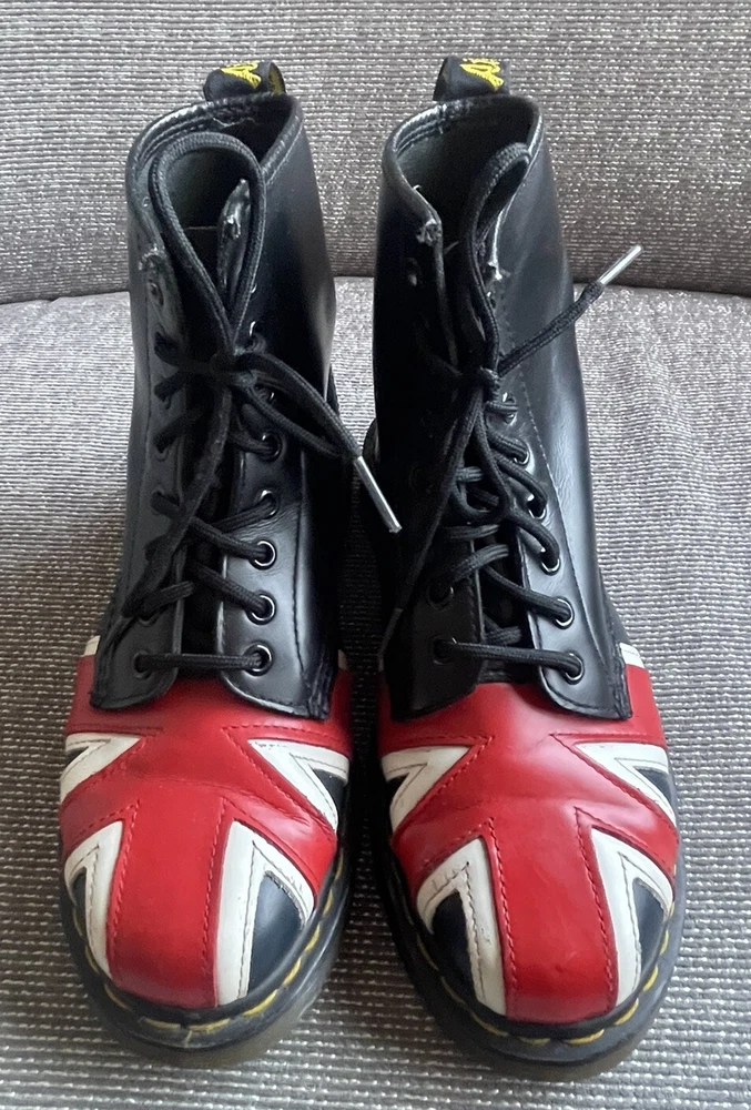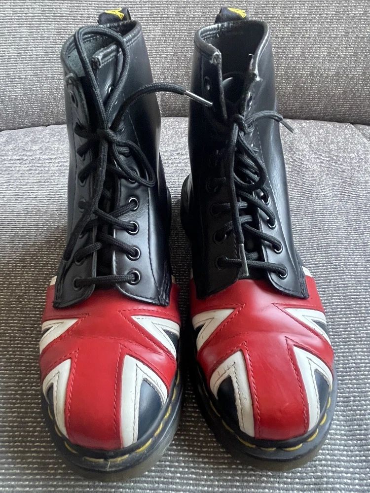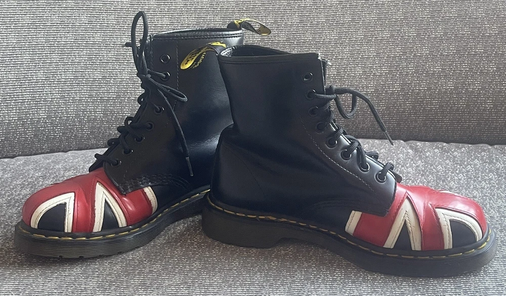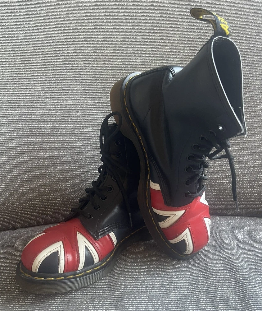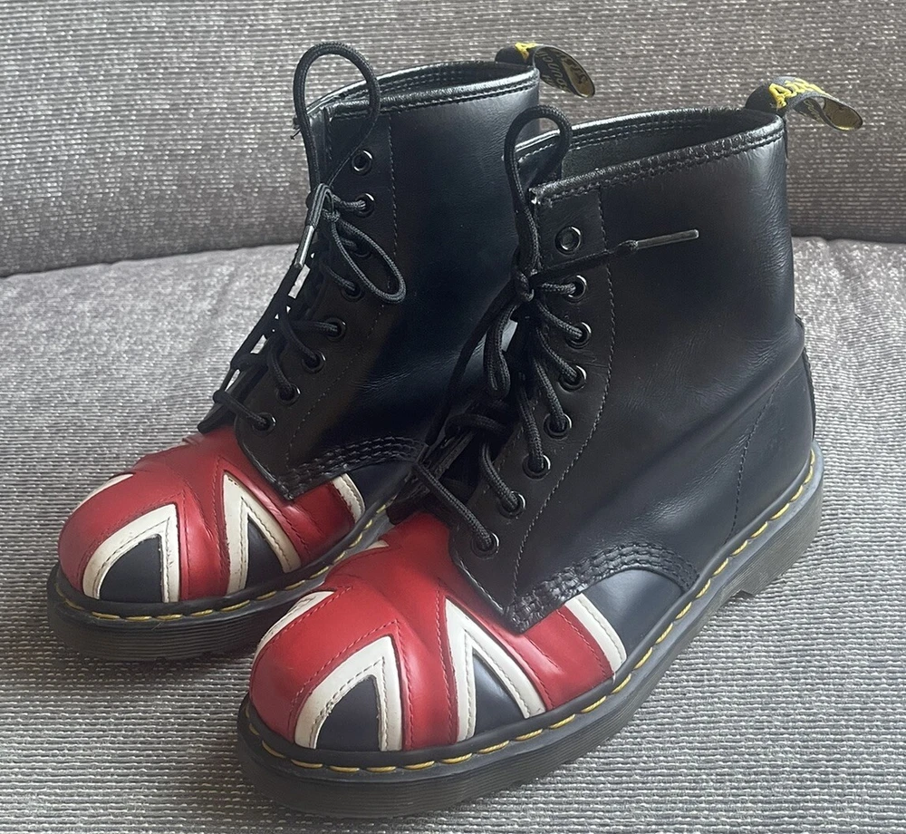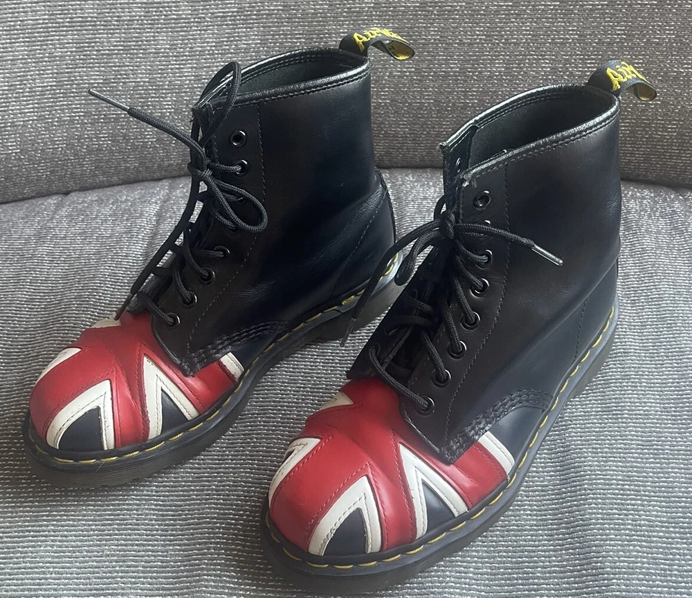 Elevate your shoe game with these stylish Dr. Martens boots featuring the iconic Union Jack British flag design. Made with high-quality leather and bouncing soles, these boots offer both comfort and non-slip protection. Perfect for any occasion, whether it be casual wear or travel, these boots are a versatile addition to any wardrobe. With a round toe and tie closure, these unisex boots fit US shoe size 7 for men and 8 for women. The black, red, and white color scheme complement the British flag pattern, making these boots stand out from the crowd. Add a touch of biker, motorcyclist, or grunge style to your look with these Doc Martens.