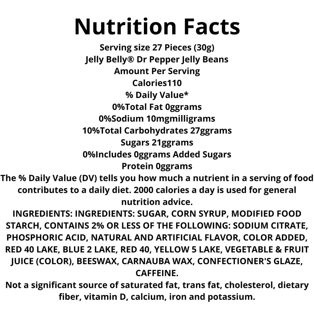JELLY BELLY Dr. Pepper flavored jelly beans really taste like Dr. Pepper! In this pack, you will receive 3 - 3.5 ounce bags of Dr. Pepper jelly beans. ENJOY the taste Dr Pepper, but in the form of a jelly bean! These unique snacks are great for movie nights or just to keep around the house for snacking. Share with a loved one, or keep it all for yourself, we won't judge. TRUE to life flavoring! These jelly beans are high quality and taste great. All Jelly Belly beans are OU Kosher, gluten free, peanut free, dairy free, fat free, and vegetarian friendly. A snack that everyone can enjoy without the worry! GREAT party favor for jelly bean lovers! Perfect for those who are brave enough to taste unique candies like these. JELLY BELLY Dr. Pepper flavored jelly beans really taste like Dr. Pepper! In this pack, you will receive 3 - 3.5 ounce bags of Dr. Pepper jelly beans. ENJOY the taste Dr Pepper, but in the form of a jelly bean! These unique snacks are great for movie nights or just to keep around the house for snacking. Share with a loved one, or keep it all for yourself, we won't judge. TRUE to life flavoring! These jelly beans are high quality and taste great. All Jelly Belly beans are OU Kosher, gluten free, peanut free, dairy free, fat free, and vegetarian friendly. A snack that everyone can enjoy without the worry! GREAT party favor for jelly bean lovers! Perfect for those who are brave enough to taste unique candies like these.
