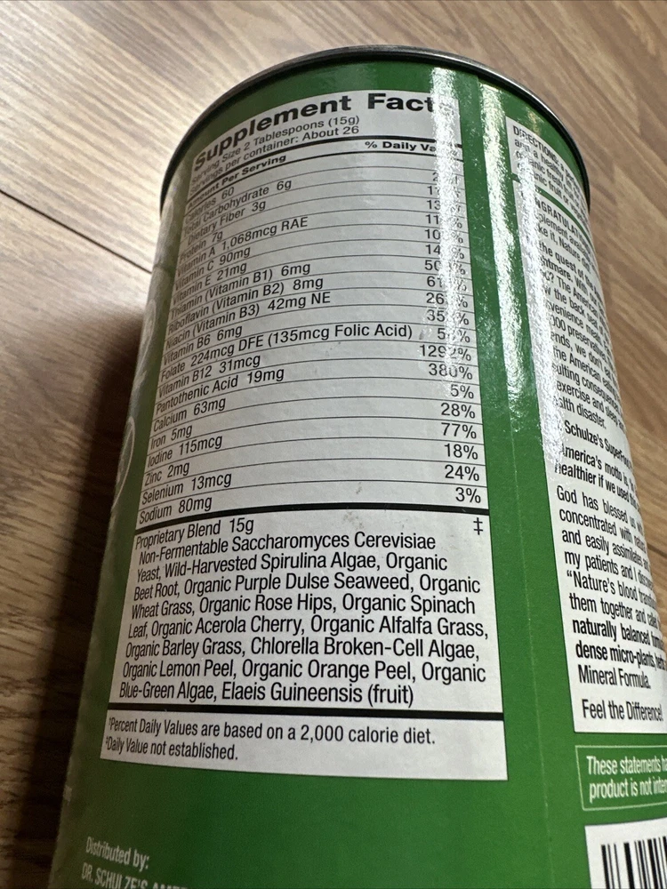 Dr. Schulze’s SuperFood Plus | Vitamin and Mineral Herbal Concentrate | Daily Nutrition | Gluten-Free and Non-GMO | Vegan | 14 Ounce Powder | Packaging May Vary SUPERFOOD POWERHOUSE: Contains 15 of the world's most powerful superfoods. One serving of SuperFood Plus delivers an unrivaled dose of rapidly assimilating vitamins and minerals while offering the body an extraordinary powerful supply of enzymes and nutrients packed into one source. INCREASED ENERGY: Blast every cell in your body with nutrient-rich organic vitamins and minerals that give your body more energy than ever with over 1200% vitamin B12. SuperFood Plus is a naturally balanced formulation of the most nutrient dense micro-plants, herbs and foods on the planet. ADDED BENEFITS: SuperFood Plus provides many benefits which promote better overall health to the human body. Powerful nutrition creates powerful health! PURE, POTENT & PROVEN: Our selection of pure organic or wild-harvested ingredients is unrivaled with 15 of the world’s most powerful superfoods which include wild harvested spirulina algae, organic blue green algae, chlorella broken cell algae, organic barley grass, organic alfalfa grass, organic wheat grass, organic purple dulse seaweed and many more. NATURAL REVOLUTIONARY PRODUCTS: Dr Schulze is one of the foremost authorities on natural healing and herbal medicine. Dr Schulze’s herbal formulas and programs have been used by hundreds of thousands in clinics around the world with life changing results. These formulas contain no soy, sugar, whey and are non-GMO, vegan, gluten-free and dairy-free. Dr. Schulze's SuperFood Plus blasts your body with a rich supply of nutrients that are formulated to increase energy and overall vitality. SuperFood Plus is also protein rich for your daily workout needs with over 40% protein by volume! Herbal Ingredients: *Wild Harvested Spirulina Algae - protein, antioxidants, B-vitamins and iron *Organic Blue-Green Algae - dietary protein, B-vitamins, and iron *Chlorella Broken-Cell Algae - used to improve digestion and to colon-related diseases *Organic Barley Grass - vitamins, minerals, fiber, protein, enzymes and amino acids *Organic Alfalfa Grass - vitamins, minerals and protein and chlorophyll used by body builders *Organic Wheat Grass - thought to be an effective healer, especially for muscular and cellular repair, provides minerals and vitamins, protein and chlorophyll *Organic Purple Dulse Seaweed - contains lots of minerals thought to lower blood pressure and contribute to bone mineral density *Organic Acerola Cherry - high in vitamins, especially vitamin C *Organic Rose Hips - also high in vitamin C *Palm Fruit - for antioxidants, vitamins and minerals *Organic Lemon Peel - vitamins, minerals and fiber *Organic Orange Peel - vitamins, minerals and fiber, thought to benefit the immune system *Organic Beet Root - vitamins, minerals and fiber *Organic Spinach Leaf - rich in antioxidants and vitamins A, B2, C and K; also contains magnesium, manganese, folate, iron, calcium and potassium *Non-Fermentable Saccharomyces - protein and B vitamins; contains all nine essential amino acids *Cerevisiae - good source of chromium for blood sugar levels and B vitamins; considered a probiotic which may aid digestion Shipping We offer FREE shipping on all orders! We ship within Three business days of payment, usually sooner. We use a selection of shipping services such as UPS, FedEx, USPS etc. We only ship to the lower 48 states, no APO/FPO addresses or PO Boxes allowed. Local pickups and combined shipping options are not provided at this time. Return You can return a product for up to 30 days from the date you purchased it. Any product you return must be in the same condition you received it and in the original packaging. Please keep the receipt. Payment We accept payment by any of the following methods: PayPal Please pay as soon as possible after winning an auction, as that will allow us to post your item to you sooner! Feedback Customer satisfaction is very important to us. If you have any problem with your order, please contact us and we will do our best to make you satisfied. Contact Us If you have any queries, please contact us via ebay. We usually respond within 24 hours on weekdays. Please visit our eBay store to check out other items for sale! Thank you for shopping at our store.