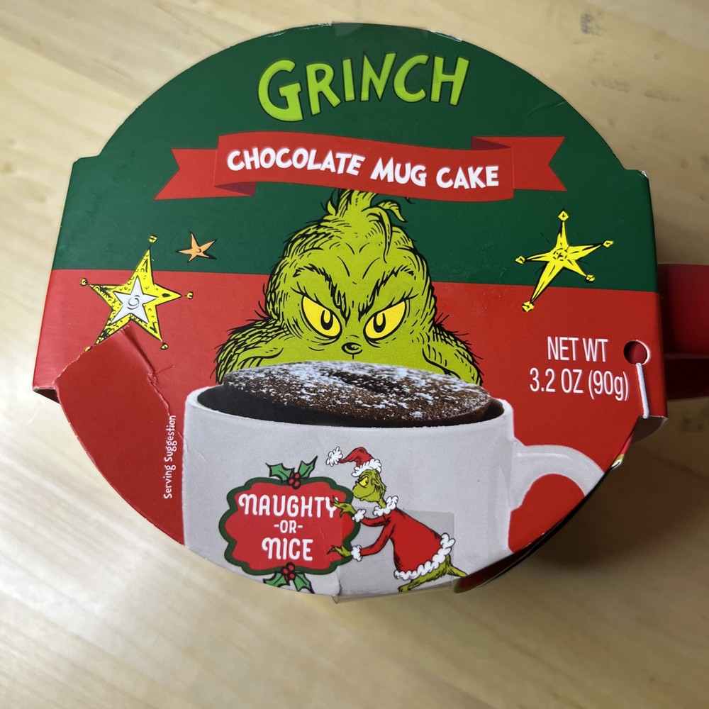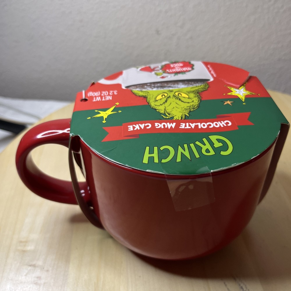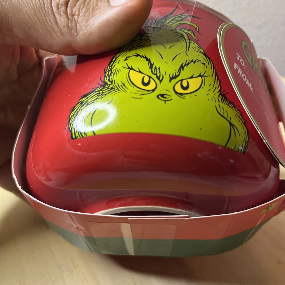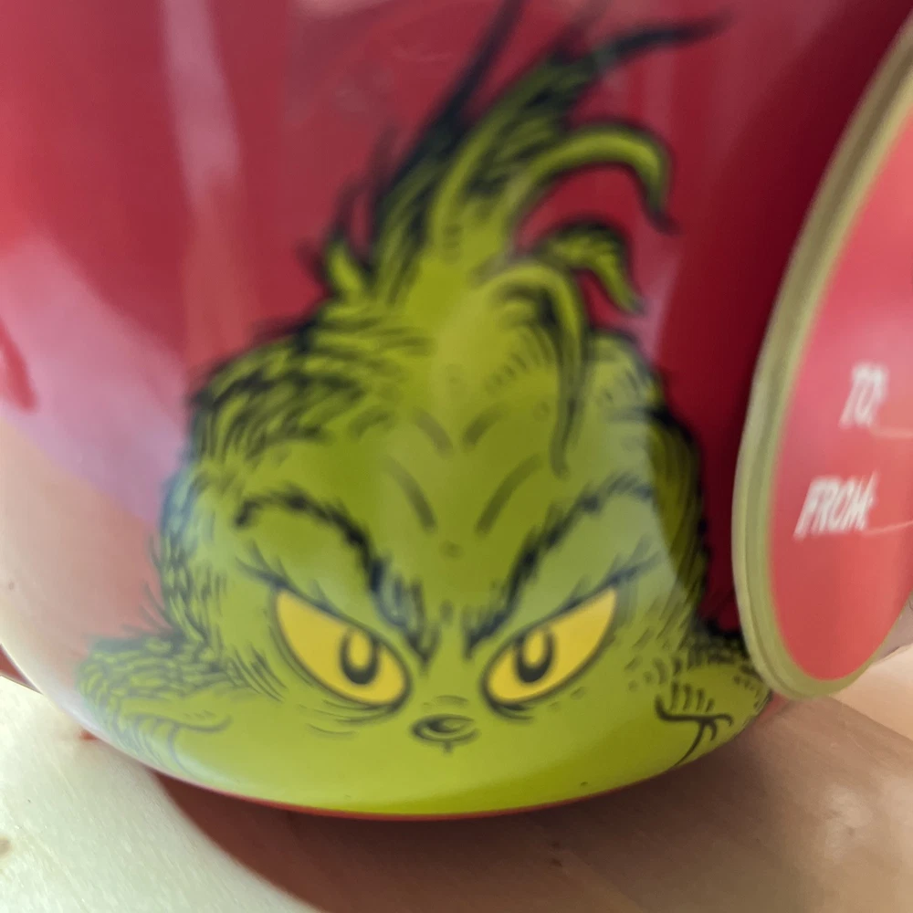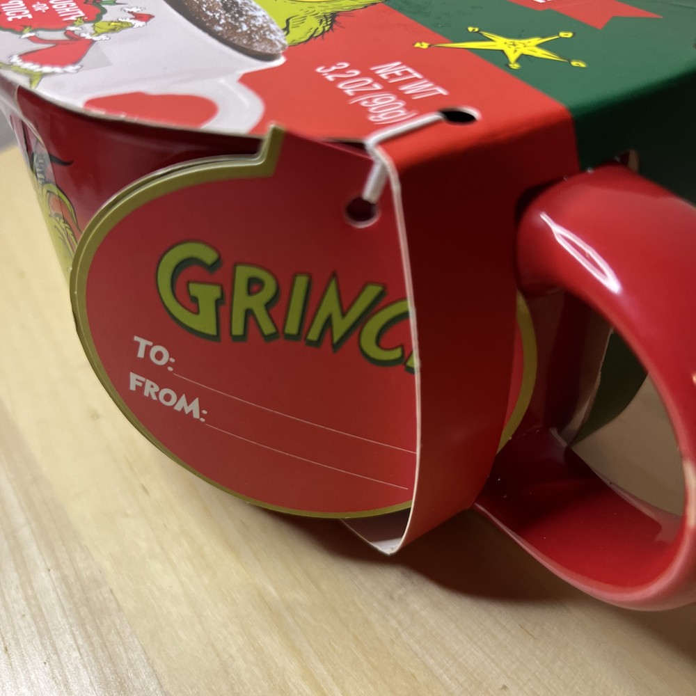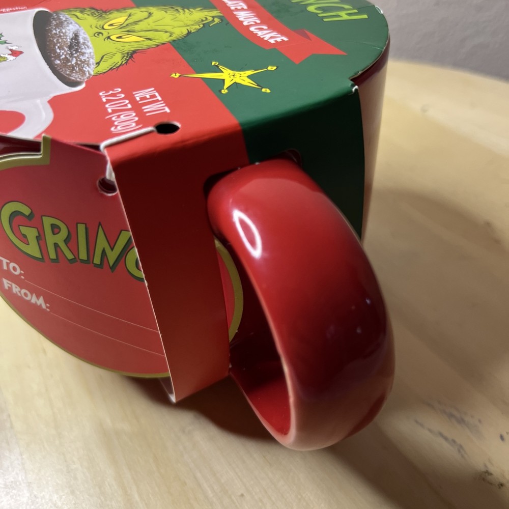 The product is a ceramic and porcelain coffee mug featuring the characters Grinch and Max from Dr. Seuss's "How the Grinch Stole Christmas." It comes with a cake mix, suitable for hot or cold beverages, and has a multicolor design with a Grinch theme. The mug has a diameter of 4.5 inches and a height of 3.5 inches, serving one person. This licensed reproduction item is part of the Dr. Seuss franchise, manufactured in 2023 for fans of the iconic Christmas story.