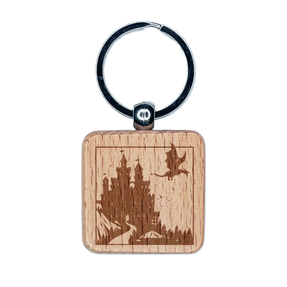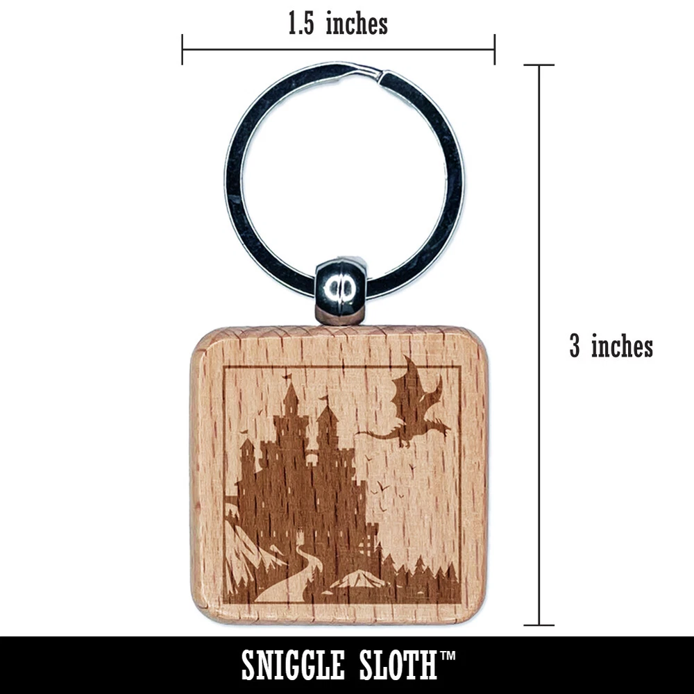 Dragon Flying Over Medieval Castle Engraved Wood Square Keychain Tag Charm