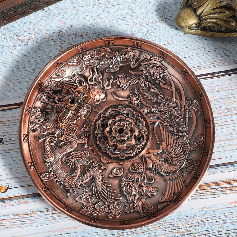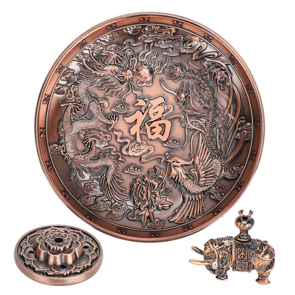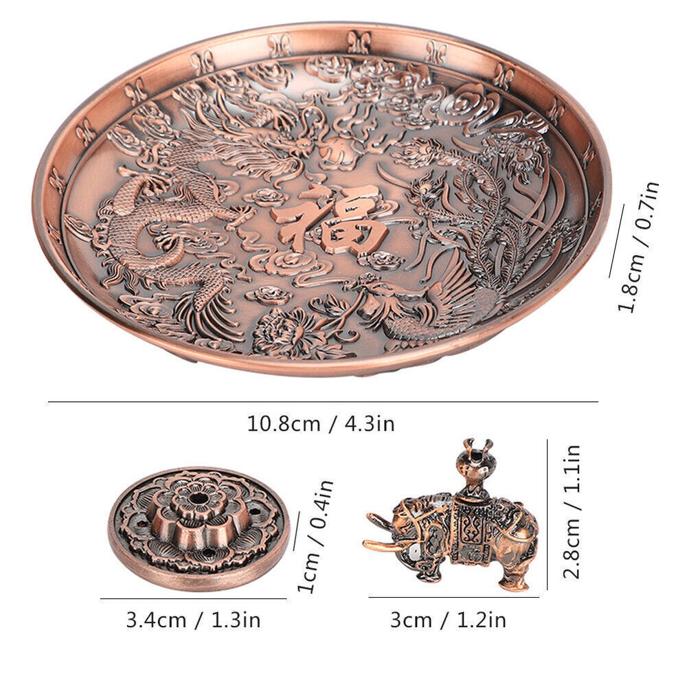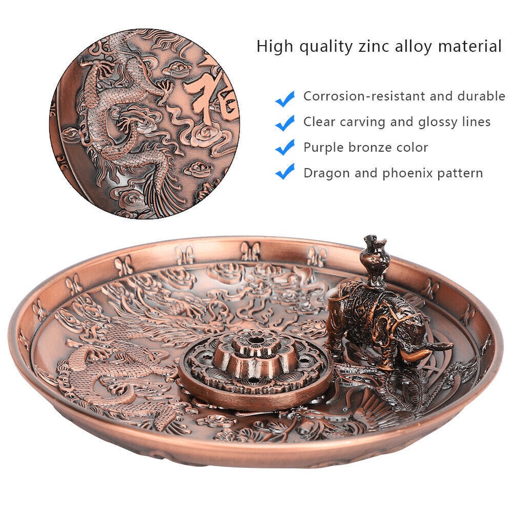 Feature: 1. Made of high quality zinc alloy material, which is corrosion‑resistant and durable 2. Possess clear carving and glossy lines, the appearance is designed in purple bronze color with dragon and phoenix pattern 3. Equipped with two removable incense holders with holes of different diameters, can accommodate a variety of incense types 4. Can be used as decorations, suitable for various places such as living rooms, temples, offices, hotels, teahouses, yoga gym, etc. 5. This unique antique style incense holder will add elegant atmosphere for your home Specification: Item Type: Incense Holder Category: Incense burner Pendulum Form: Pendulum Process: Pressure casting Size of Dragon Phoenix Plate: (manual measurement for reference) Diameter: Approx. 10.8cm / 4.3in, height: Approx. 1.8cm / 0.7in Size of Incense Holder: Diameter: Approx. 3.4cm / 1.3in, height: Approx. 1cm / 0.4in Size of Elephant Incense Holder: Length: Approx. 3cm / 1.2in, height: Approx. 2.8cm / 1.1in Package List: 1 x Dragon Phoenix Plate 1 x Incense Holder 1 x Elephant Incense Holder