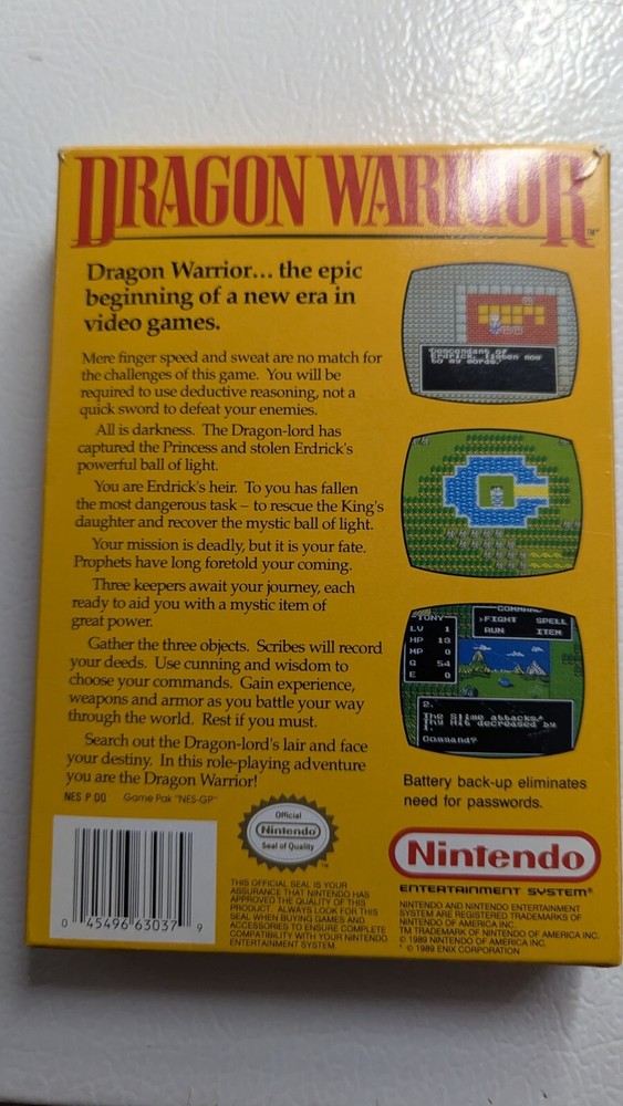 This is a complete copy of the classic Nintendo NES game, Dragon Warrior. It features an E-Everyone rating and is part of the RPG sub-genre. The game was released in 1989 and is compatible with NTSC-U/C (US/Canada) region codes. The publisher is Nintendo and the game is set in Japan. The game comes in its original box and includes all the necessary parts. It is a great addition to any video game collection and is sure to provide hours of entertainment. Don't miss out on the chance to own this piece of gaming history.