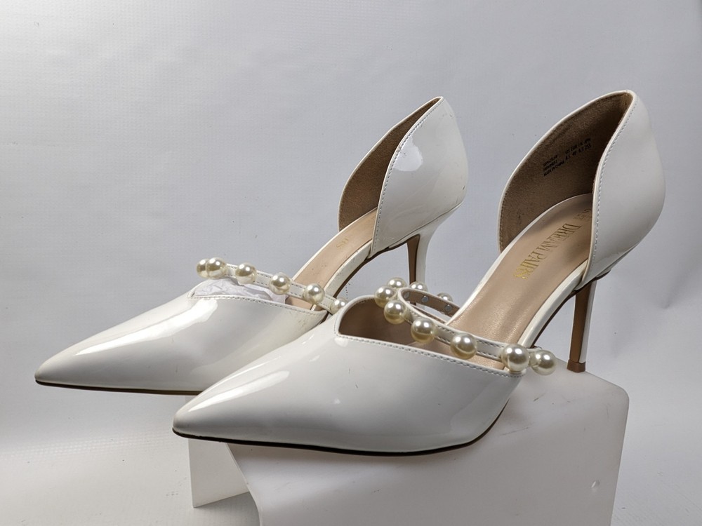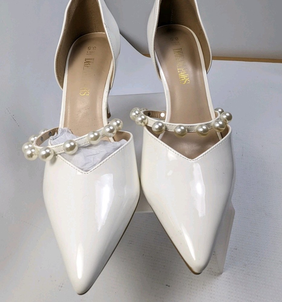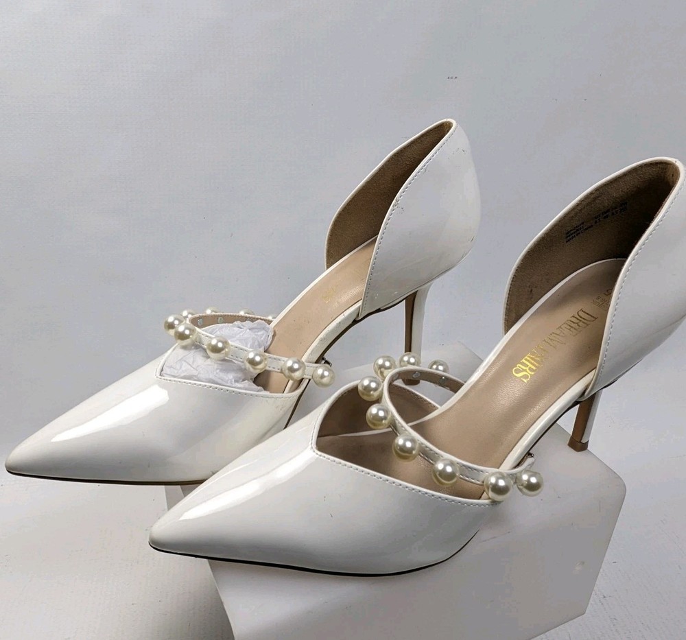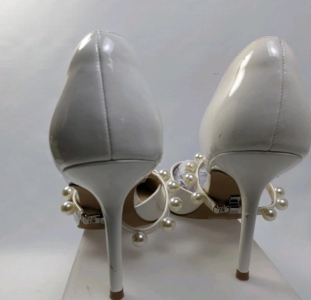 Designed with a sleek d’Orsay silhouette, glossy upper, and decorated with a lustrous pearl strap, these stiletto pearl strap pumps will give your ensembles instant glamour. Size: Women's 8.5 These shoes are in great pre-owned condition and appear to have only been worn once or twice. There are minor marks on the outer heel side of each shoe; please see pictures.