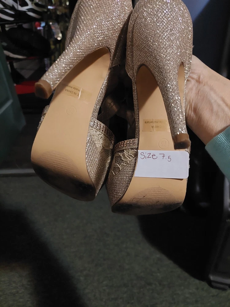 These are Dream Pairs women's gold glitter stiletto heels in size 7.5. The peep toe design features a buckle closure and adjustable ankle strap. The ultra-high heel measures over 4 inches, with a platform style for added height. The shoes are accented with glitter and have a cushioned insole for comfort. The upper material is synthetic, and the brand is Dream Pairs.