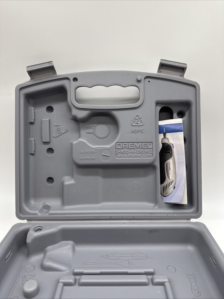 Please examine photos early to ensure this is the purchase for you. The product is a SOLID Dremel rotary tool empty case in a gray color. It comes with two manuals for the 400XPR and 300 series. The tool box features a handle for easy portability and is made of plastic material. This case is designed to store and protect Dremel rotary tools and accessories, keeping them organized and easily accessible. Perfect for those who own Dremel tools and want a sturdy and convenient storage solution.