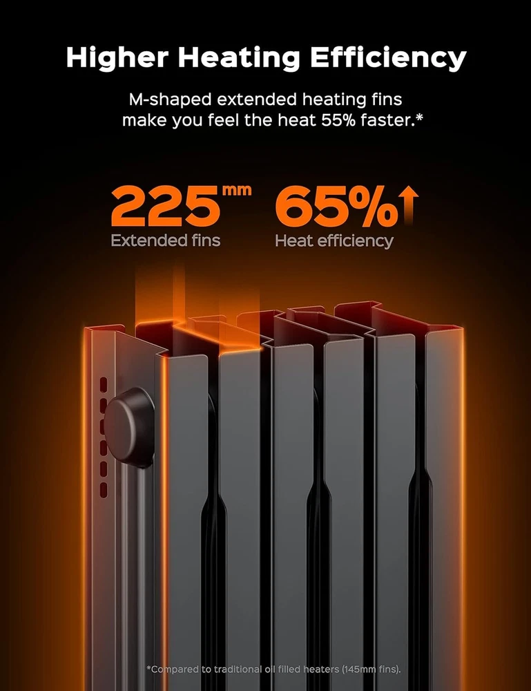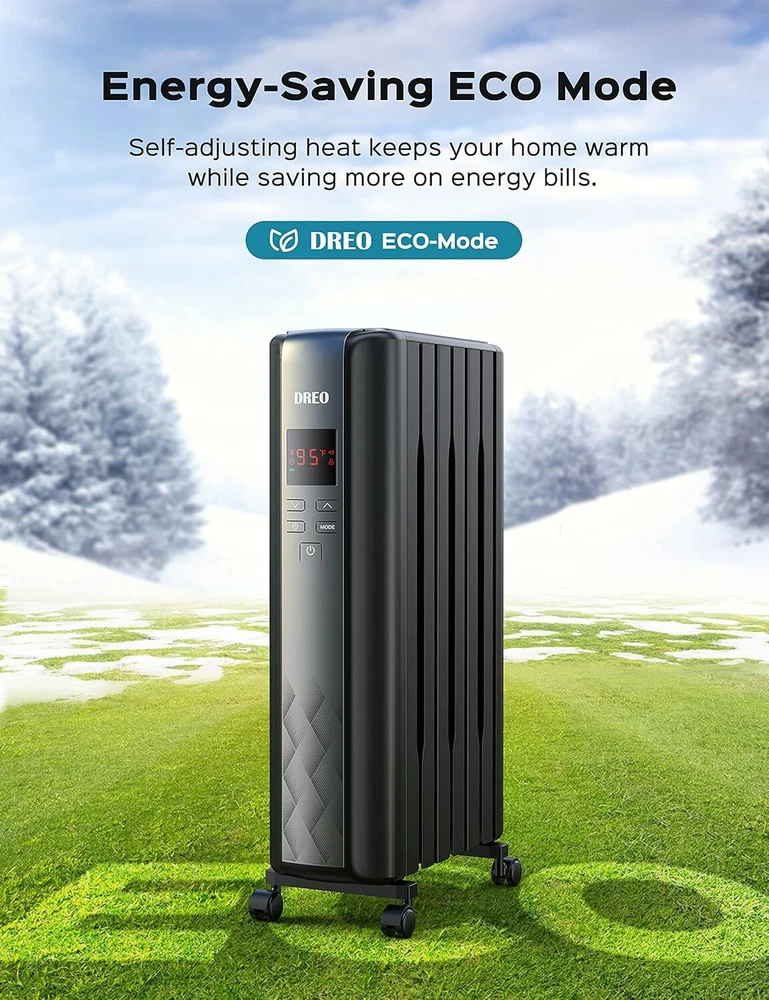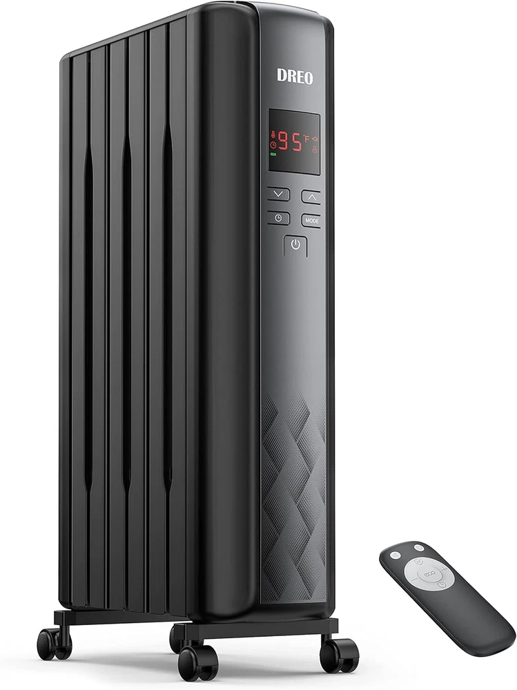 Dreo Oil Filled Radiator Heater, Electric Radiant 26" X 19" X 7.5", Black Product Details Brand: Dreo Special Feature: Large heating area, remote control, high heating efficiency, save energy, quiet Color: Black Form Factor: Pedestal Indoor/Outdoor Usage: Indoor Power SourceHeating Method: ACRadiant, Convection Item WeightHeat Output: 22.22 Pounds1500 Watts : 1500W high power, spindle-shaped openings and M-shaped heating fins create stack effect to provide 360° efficient circulation of hot air in your rooms, keeping your home cozy and warm without drying out the air. Dreo oil radiator heater is your best go-to in winter. : The spindle-shaped openings, 225 mm larger than others enlarged fins and Dual U-shaped heating tubes make the Dreo oil radiator heater so effective in distributing heat that the heat can be doubled and released quickly, evenly and efficiently to a large area or the entire room. : With the wraparound heating fins design, the heating element and fins are not directly exposed, preventing burn risks. The exteriors are also specially treated to be only at 80℃ at most during use, 30% less hot to the touch than most oil heaters. : Dreo Oil Filled Radiator Heater made of V0 flame retardant materials was certified by UL. Built-in tip-over switch, Dreo Oil-filled heater will automatically shut off while tip-over by accident to ensure you and your family are safe and worry-free : Equipped with 600W/900W/1500W heating modes, this space heater also features a smart ECO mode that adjusts the working mode based on the room temperature with built-in precise temperature sensor, continuously keeping your home in constant warmth while saving more on your energy bills in winter : A remote is included to allow you to mute, set a timer, and access other functions of this oil-filled radiator heater from 19 feet away. Universal wheels make moving this big guy a breeze. Assembly is super easy — Just open the bottom brackets and insert the wheels directly. No tools needed : Dreo oil radiator heater comes with a 24-hour timer, you can set the timer in 1 hour increments. Not only can you set the auto off time, you can also set the auto on time while on standby. Always stay warm when at home
