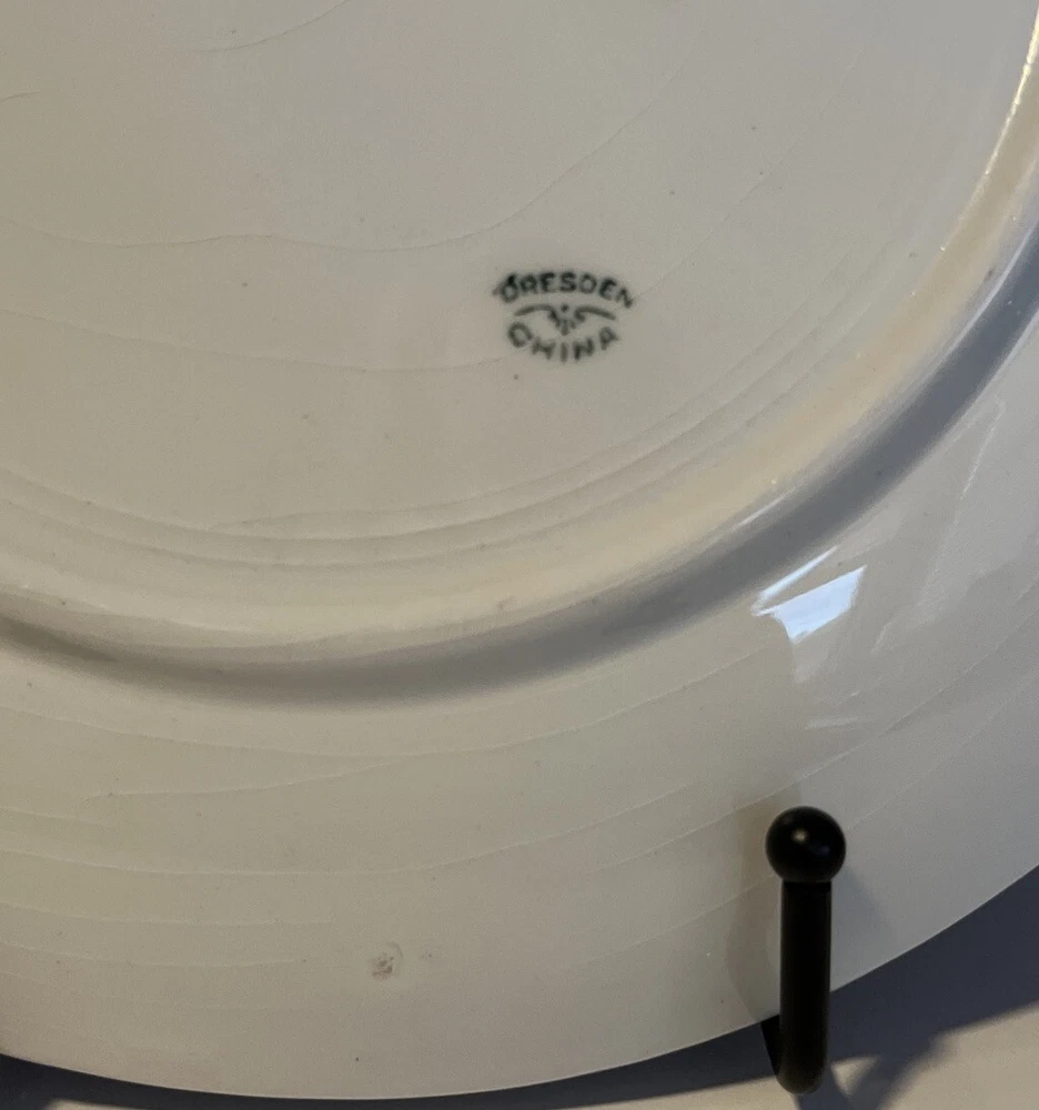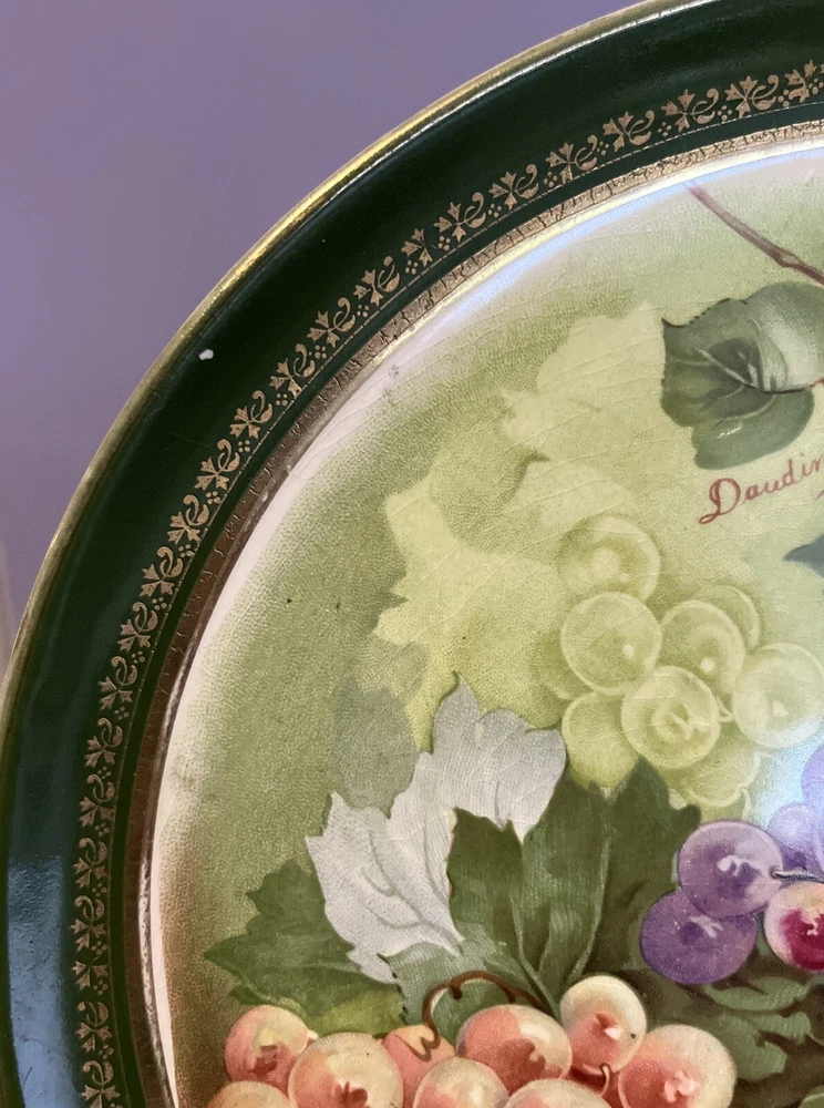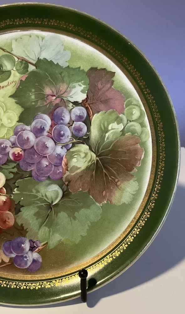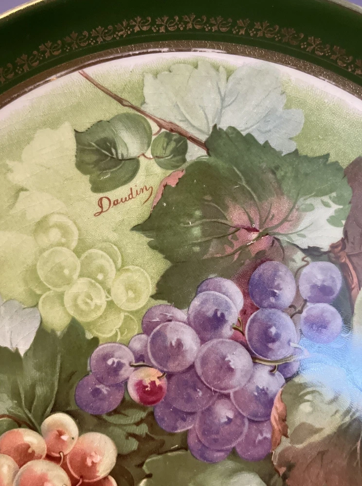 Dresden China Large Green w/ Gold Fruit or Serving Plate with Green and Purple Grapes Signed Daudin on front printed Dresden on back - Dimensions: 10.5” diameter This was in my mother’s collection purchased in 1994 from antique store. Only on display shelf or stores since purchase. Slight crazing due to age on back. Please review all pictures carefully as they are part of the description. Questions are welcome.