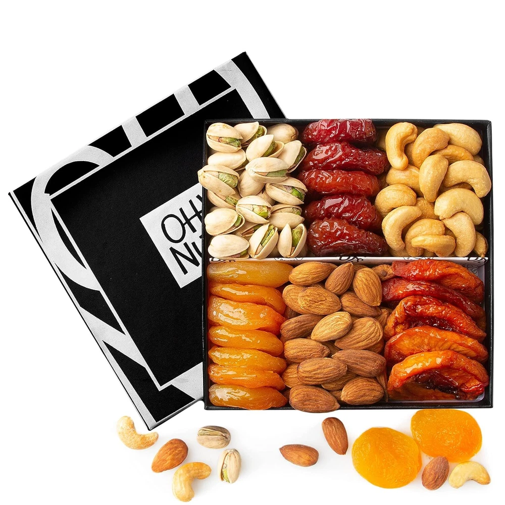 Dried Fruit and Nuts Gift Basket Assorted - Holiday Snack Box for Birthdays, Anniversaries, Care Packages by Oh Nuts Product Details Package Dimensions : 6.06 x 5.98 x 1.49 inches; 13.44 ounces Manufacturer : Oh! Nuts Brand: Oh! Nuts Package Information: Basket,Packaging Number of Items: 1 Item Form: Dried,Roasted Unit Count: 1.0 Ounce GIFT BASKET: Mixed Nuts & Dried Fruits - A perfectly balanced blend of crunchy nuts and naturally sweet dried fruits, offering a delicious and nutritious treat for everyone to enjoy this New Year’s holiday. 6 VARIETIES OF DRIED FRUIT AND NUTS: Our food gift baskets have an assortment of cashews, pistachios, almonds, dried peaches, dried plums, and dried apricots. Munch a handful of nuts and dried fruit at once and they are going to taste delicious. STYLISH AND STURDY PACKAGING: Our gift box is crafted with a sturdy cardboard tray, designed to hold each variety of dried fruits and no sugar added nuts perfectly. This elegant presentation makes it ideal as gifts for grandparents or edible gifts for any occasion. NUTS CANDY CHOCOLATE GIFTS: If you are looking for premium dried fruits, no sugar added nuts, crunchy roasted treats, yummy chocolates, or holiday gifts, we have all of them and so much more. Browse our entire collection of Oh Nuts products to discover delicious gifts for elderly parents and loved ones. REMEMBER TO CHECK THIS BOX "This is a gift": It's the people, gifts, and messages that make the moment memorable. Be sure to tell your special someone that you sent this as a gift by checking this box.