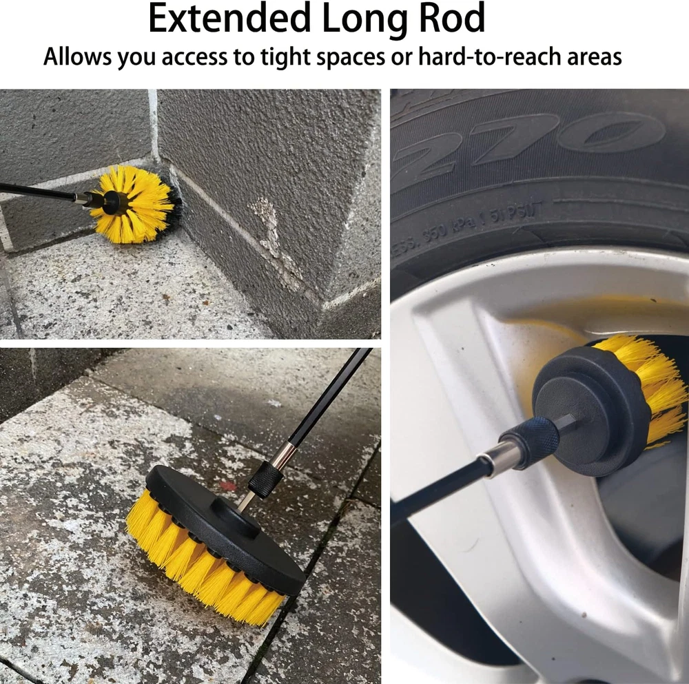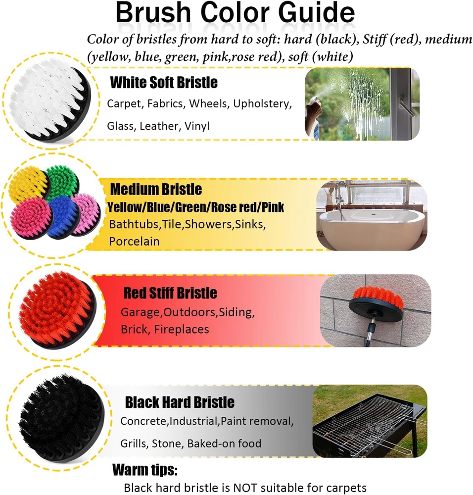 【Package Include】You will get 7 packs of drill brush (3pcs 4" round flat brushes, 1pc 5" round flat brush, 1pc 1.5" round flat brush,1pc long round brush, 1pc rim brush) and 1pc extended long attachment. Brush heads of different shapes and sizes enable you to finish almost all household cleaning tasks 【4 Packs of Round Flat Brush】The brush drill attachment set includes 4 packs of round flat power scrubber brushes as they are more often used. They are perfect to clean or sccrub large surface, like hull, floor, stove grates and boat 【Extended Long Attachment】The 1/4" diameter quick-change shaft works with most quick-change drill brushes. The 6" long shaft allows you access to tight spaces or hard-to-reach areas such as drip pans, stove grates, crevices etc. 【1/4" Quick Change Shaft】 Each drill scrub brush features a quarter-inch quick change shaft. The shafts are corrosion-resistant zinc/nickel coated, making them long-lasting and not easy to break. They can work with most power drills or drivers 【Premium Material】Drill brush heads are made of premium nylon bristles to achieve scratch-free cleaning, and the covers are made of polypropylene plastic. Each scrub brush head is suitable to be used on hard matrial like concrete, porcelain, glass, tile or metal, and safe to use with detergent Specifications: Item name: Drill Brush Attachment Set Material: High quality nylon bristles and plastic Size of quick change shaft: 1/4" Package Size: 6 x 4 x 4 inches Package weight: 1.1lbs Package list: 1 × 5" round flat brushe 3 × 4" round flat brushe 1 × 1.5" round flat brushe 1 × Long round brush 1 × Rim brush 1 × Extend long attachment