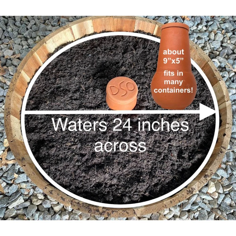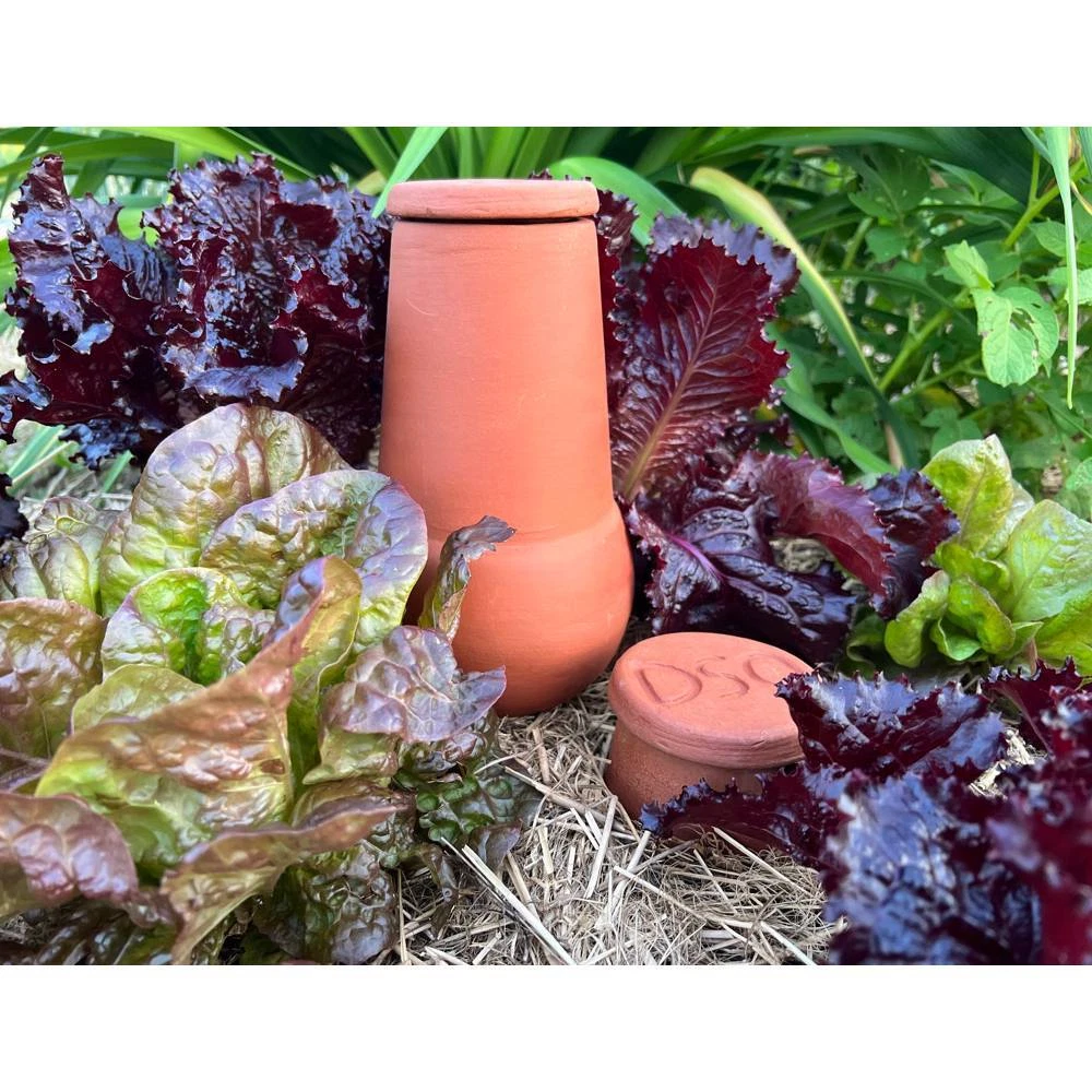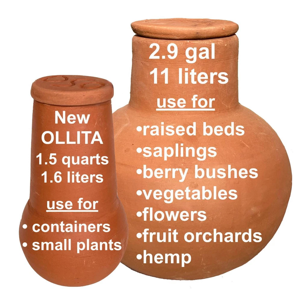 OLLA Watering Pot: Save Water! Conserve your water and keep garden plants growing happily. This ancient irrigation watering system uses an unglazed and lead-free terra cotta pot, buried neck deep and filled with water. As the soil dries out, water is pulled through the wall of the olla at root level. There is virtually no evaporation and no runoff. This saves up to 70% in water use and grows healthier plants. Features: Ideal for small areas like container gardens, flower beds or large planters. Less watering - Fill 1-2 times weekly (see Note below). Wide neck makes refilling easy, especially as your plants grow. Lid virtually prevents evaporation, plus keeps out mosquitoes and critters. Can be used with trees, bushes, herbs, well, anything that needs water to grow Visit Our Store Contact Us OLLA Garden Watering Pot - Medium OLLITA (1.5 qt) OLLA Watering Pot: Save Water! Conserve your water and keep garden plants growing happily. This ancient irrigation watering system uses an unglazed and lead-free terra cotta pot, buried neck deep and filled with water. As the soil dries out, water is pulled through the wall of the olla at root level. There is virtually no evaporation and no runoff. This saves up to 70% in water use and grows healthier plants. Features: Ideal for small areas like container gardens, flower beds or large planters Less watering - Fill 1-2 times weekly (see Note below) Wide neck makes refilling easy, especially as your plants grow Lid virtually prevents evaporation, plus keeps out mosquitoes and critters Can be used with trees, bushes, herbs, well, anything that needs water to grow Cold tolerant (see more below) Time-tested! These ollas have been watering gardens for over 10 years Made in Mexico by fifth generation potters, using native clay from the Baja Peninsula Note: How often you need to refill depends on the soil type and climate. Drier climates may require more filling, while areas with frequent rainfall will require less. Medium OLLITA Pot This medium-sized pot is ideal for watering container plants or shallow rooted plants in the garden, like radishes and lettuce Will water a diameter of 20"-24" Capacity: 1.5 qt (6 cups) Dimensions: 9.5" x 5.5"W Weight: 2 lb Origin: Mexico