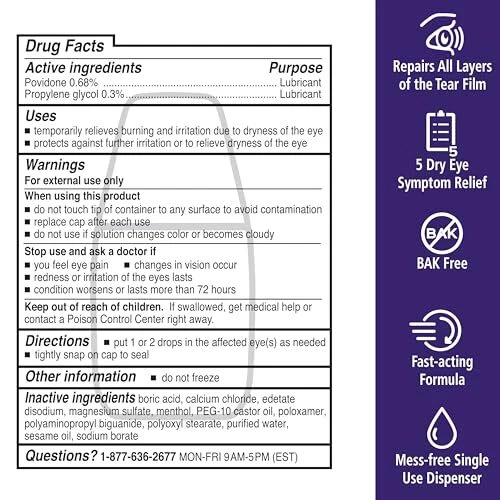 Dry-Aid Eye Relief Lubricant Eye Drops, 0.34 Ounce, 2 Count COOLING, HYDRATING EYE DROPS: Dry Aid Lubricating Eye Drops with dual lubricants are designed to relieve 5 dry eye symptoms, including burning, stinging, grittiness, dryness, and irritation FAST-ACTING DRY EYE RELIEF: Dry Aid eye drops provide quick, non-blurring relief from dry, irritated eyes; safe for contact lens wearers (when used as directed) ADVANCED LUBRICATION: Our proprietary Liquid Shield Technology works like real tears to restore and lock in moisture while repairing all layers of the natural tear film for superior comfort 12-HOUR RELIEF: Dry Aid Lubricant Eye Drops are BAK-free and offer long-lasting hydration that soothes eyes for up to 12 hours for extended comfort and relief from dry eye symptoms; Also available in preservative-free single use vials TRUSTED BRAND: Trust - A global leading eye care brand to bring you innovative solutions for your eye health