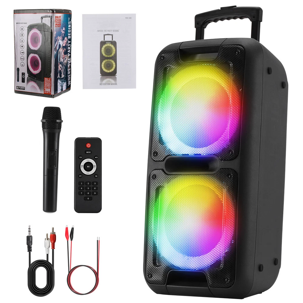 Dual 10'' Portable Bluetooth Speaker System TWS Karaoke Machine Rechargeable FM Feature: 1. Powerful Bass Sound: Bluetooth Speaker is equipped with dual 10-inch woofers and bass knob, which can provide clear, powerful sound and deep, resonant bass. Whether indoors or outdoors, you can experience rich music. 2. Portable speaker sound system, designed with multiple connection methods: The device provides you with multiple ways to listen to music, including connection via Bluetooth, SD card, TF card, USB and AUX cable. It can also play FM radio. Connect microphone and guitar. 3. Multi-function Bluetooth Speaker: Turn on the LED RGB light switch to create a party atmosphere, True Wireless Stereo (TWS) technology connects two speakers for stereo sound, and supports one-piece recording function. 5-band graphic equalizer can fine-tune your sound. 4. Easy to move: Built-in wheels and handles make it an ideal portable speaker for beach parties, barbecues and other activities. 5. Extended play time: Built-in 12V 7A rechargeable long-life battery ensures continuous playback for hours at events and parties. Perfect for outdoor parties, beach outings and all-day events. Specification: Size:13.4’’ x 12.6’’ x 28.3’’ Material: ABS Color: Black Number of speakers: 10 inches * 2 Input voltage: AC110-240V 50/60HZ Full charge: about 5 hours or more Play at maximum volume: 1.5 hours Functions: ✅Bluetooth connection, TF card, TWS, USB, AUX, SD card, FM Radio, ✅ LED Light switch, Bass, Mic Input, Guitar input, Recording, ✅ 5-Band Graphic Equalizer, Microphone echo/bass/treble/volume adjustment Package: Dual 10-inch Bluetooth speaker with trolley*1 AC charging cable*1 Remote control*1 English manual*1 3.5mm to RCA cable*1 Positive and negative cable*1 Delivery details Payment Terms of sales Feedback Contact us Delivery details 1. BUSINESS DAY MONDAY- FRIDAY FAST SHIPPING FROM USA. 2. All orders and payments received before 4PM EST (1PM PST) will be shipped the same business day. 3. No shipping on Saturday,Sunday or USA Public Holidays 4. No responsibility for any custom duty Payment We accept payment by PayPal only. Terms of sales 1. We offer a 60 day money back guarantee or exchange. 2. Buyer pays return shipping and we pay replacement shipping. 3. If you want to initiate a return,please contact us to get a returning address before sending the item back. Feedback 1. We strive to provide the best products and services. 2. Your positive feedback 5 stars DSR help us do better. 3. If anything about your transaction did not meet expectations, please CONTACT US and give us the opportunity to make things right. We are always here to help. Contact us Please do not hesitate to CONTACT US . You can message 24/7 on eBay for all questions and inquiries. We will get back to you within one business days at the latest from Monday- Friday.