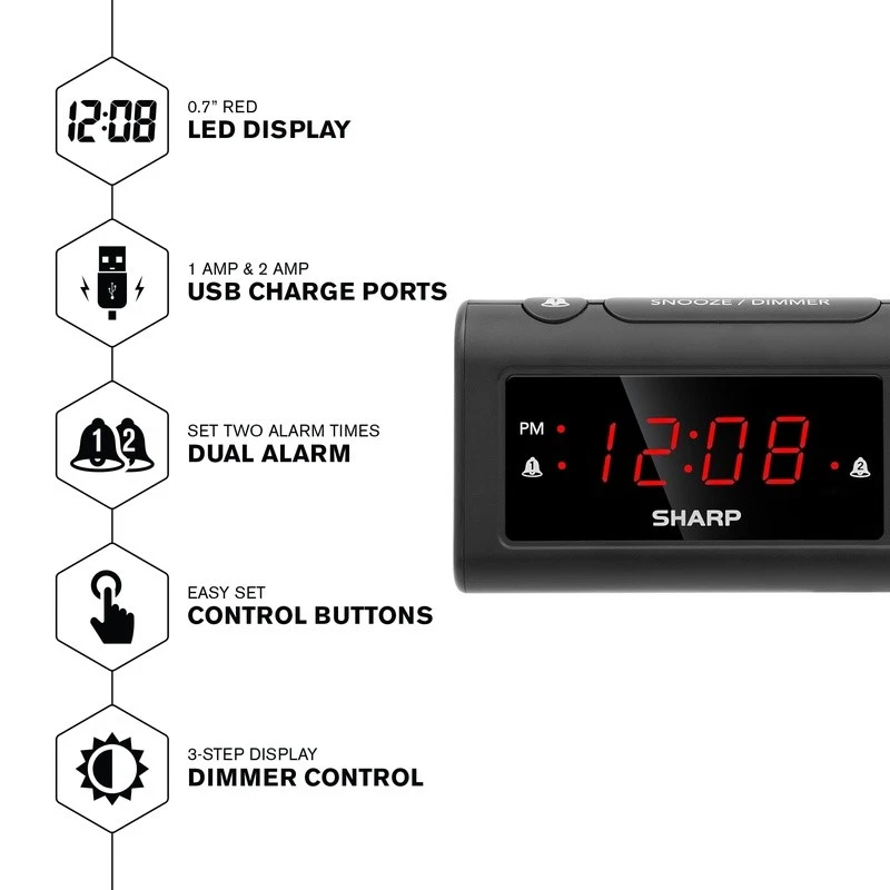 You may also like SmartSet Dual Alarm Clock Radio Bluetooth Speaker USB Port LED Pulse Music 37.87 USD 39.86 USD Free shipping 5% off Insta-Set LCD Alarm Clock W/ Snooze Backup Battery Day of Week Indicator New 23.86 USD 25.12 USD Free shipping 5% off Wooden Digital Alarm Clock W/ Wireless Charger Voice Control 3 Alarms Display US 35.32 USD 37.18 USD Free shipping 5% off Digital Alarm Clock Green LED Backup Snooze Easy Set Bedside 8 Min Beep New 27.3 USD 28.74 USD Free shipping 5% off Electric Night Table Clock Easy Read LED Display Snooze Battery Backup New 23.39 USD 24.62 USD Free shipping 5% off Wireless Charging Dual Alarm Clock Radio LED Display Temperature Sensor FM Radio 29.65 USD 31.21 USD Free shipping 5% off 4 in 1 Digital Alarm Clock W/ Temperature Humidity Display & Beep Alarm New 31.81 USD 33.48 USD Free shipping 5% off Digital Alarm Clock Adjustable Volume Snooze Battery Backup Bedside Desk New 16.26 USD 17.12 USD Free shipping 5% off Sunrise Simulator Alarm Clock Dimmable Night Light Snooze Function LED Display 27.06 USD 28.48 USD Free shipping 5% off Digital Alarm Clock Snooze Function Battery Powered LED Display Home Decor Gift 22.51 USD 23.7 USD Free shipping 5% off Digital Travel Alarm Clock Fold-up Snooze Timer Backlight Battery Operated New 19.12 USD 20.13 USD Free shipping 5% off LED Dinosaur Alarm Clock Color Changing Snooze Display 8 Alarm Options New 16.5 USD 17.37 USD Free shipping 5% off Reduce the clutter on your nightstand with this compact and stylish alarm clock that charges 2 phones and provides 2 alarm settings. The Dual alarm clock with 2 Charge ports charges your phone while you sleep! The digital alarm clock is always on so when you wake up in the night, you can see the time display. Use this clock to set two alarms - one for you and one for your partner or set them both for you! Use the optional battery back up and see the time restored once the power returns. 2 USB Charging Ports Two Alarm Settings 1 x 2 Amp: 1 x 1 Amp Digital Adult You may also like High Baby Chair Folding Safety Full Size Adjustable Seat Comfortable Child Home 71.15 USD 74.89 USD Free shipping 5% off 15W Wireless Ultra Fast Charging Dual Alarm Radio Bluetooth Speaker USB Display 44.23 USD 46.56 USD Free shipping 5% off Countertop Room & Cold Water Dispenser W/ LED Status Light Filter System Kitchen 79.57 USD 83.76 USD Free shipping 5% off 30-inch 3-Tier Free-Standing Bathroom Shelf Floor Cabinet 30 lbs.Capacity,Bamboo 46.45 USD 48.89 USD Free shipping 5% off Corner Tool Tower Storage Rack Organization Garden Tool Workshop Garage Black US 41.04 USD 43.2 USD Free shipping 5% off Slim Laundry Basket Cutout Handles Lid Brown Both Spacious Stylish 40 Liter 44.57 USD 46.92 USD Free shipping 5% off Large Folding Iron Board Lightweight Nonslip Adjustable Height Ironing Boards 94.9 USD 99.89 USD Free shipping 5% off 2 in 1 Soldering Iron Hot Air Rework Station °F /°C with Multiple Functions 75W 165.14 USD 173.83 USD Free shipping 5% off 3 Drawer Weave Tower Plastic Storage Containers Living Room Bedroom Set of 2 Hot 46.86 USD 49.33 USD Free shipping 5% off 8-Piece White Bed in A Bag Microfiber Bedding Set Comforter Set Bedroom Queen 69.96 USD 73.64 USD Free shipping 5% off Personal Tower Fan Small Room Adjustable Air V Flow Circulator 4 Speeds Black 40.6 USD 42.74 USD Free shipping 5% off Traditional 5 Shelf Bookcase Shelf Cabinet Cupboard with Doors Adjustable, Black 82.98 USD 87.35 USD Free shipping 5% off