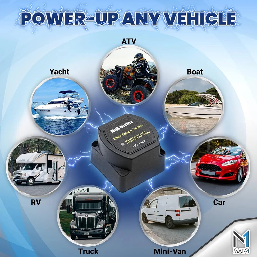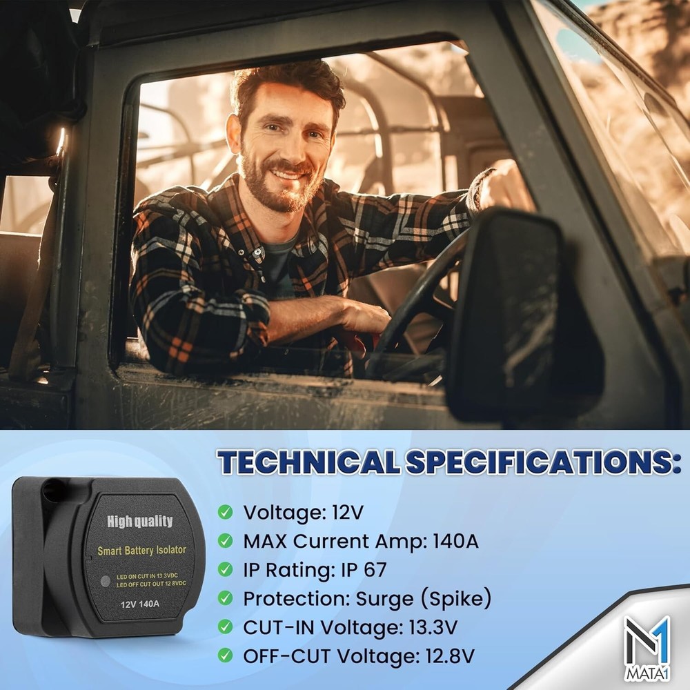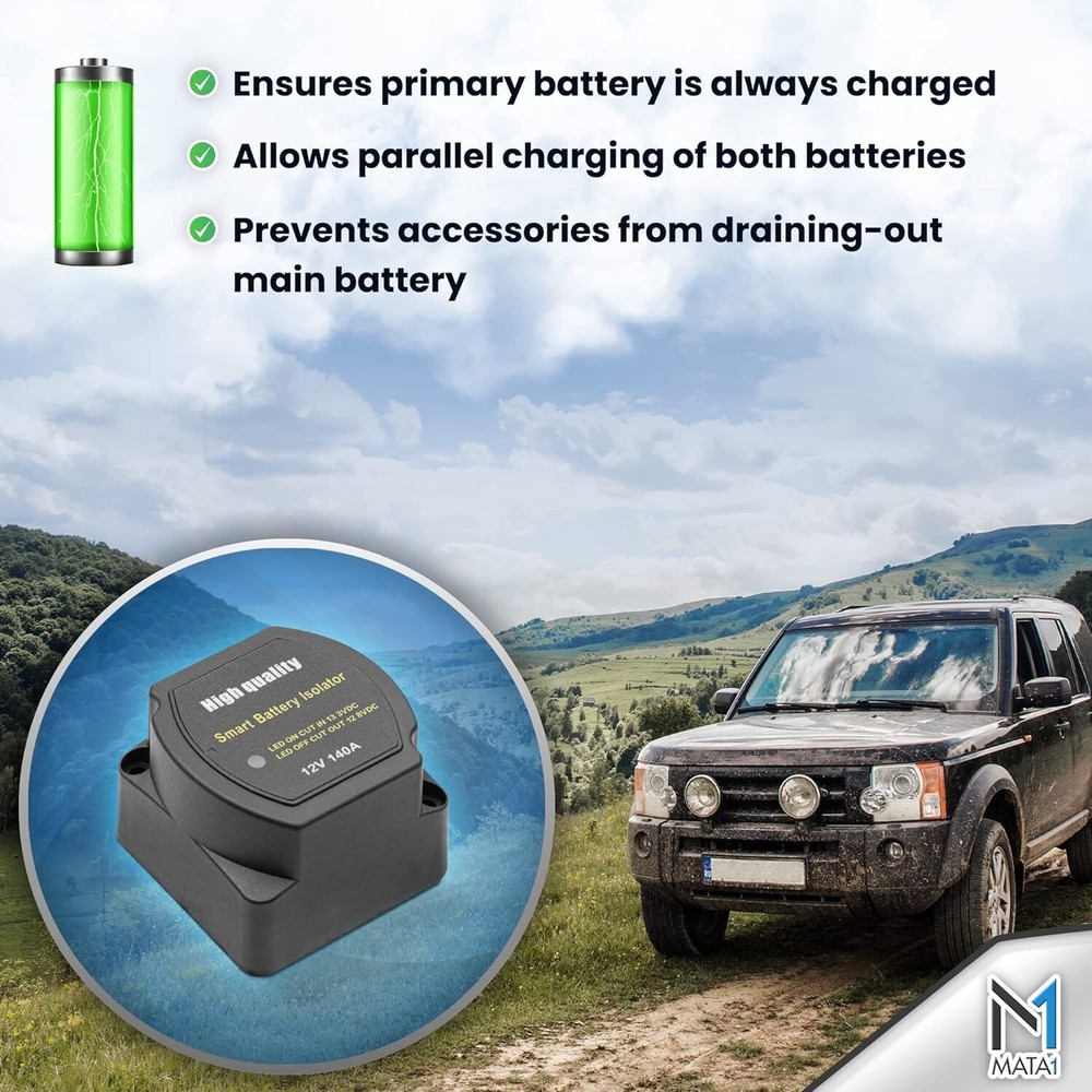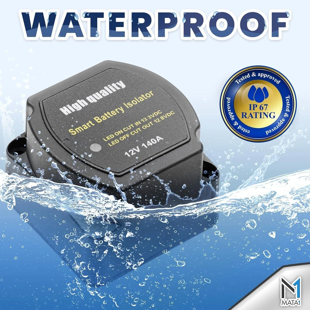 Dual Battery Isolator Kit 12V 140Amp IP-67 Waterproof Rating VSR (Voltage Sensitive Relay) Smart Car Charger for All Automotive Land or Marine Vehicles RELIABLE POWER SOURCE - Get a reliable power source for all on-road travels and off-road expeditions with a smart dual battery isolator; Keep your main battery charged and engine running to ensure your automobile never run out of power in remote areas again UNIVERSAL COMPATIBILITY - Power up any ground or marine vehicle including ATVs, boats, cars, mini-vans, trucks, RVs, and yachts; Perfect versatile solution for all automotive power needs ALL-WEATHER RESILIENT - Explore any environment with confidence with the IP-67 waterproof rating dual battery isolator; Designed to perform well and stay resilient in even the toughest weather conditions and terrains HEAVY-DUTY - Manufactured using premium-grade polyamide 66 and copper PVC; Mata1 endeavours to provide you a robust device that can withstand the test of time and provide you lasting performance EASY INSTALLATION w/ COMPLETE KIT - Compact design (2.7” x 2.7” x 2”) that fits easily in your automobiles barely taking any space; Enjoy hassle-free installation w/ a complete isolator kit including cables, lugs, terminals, and instructions