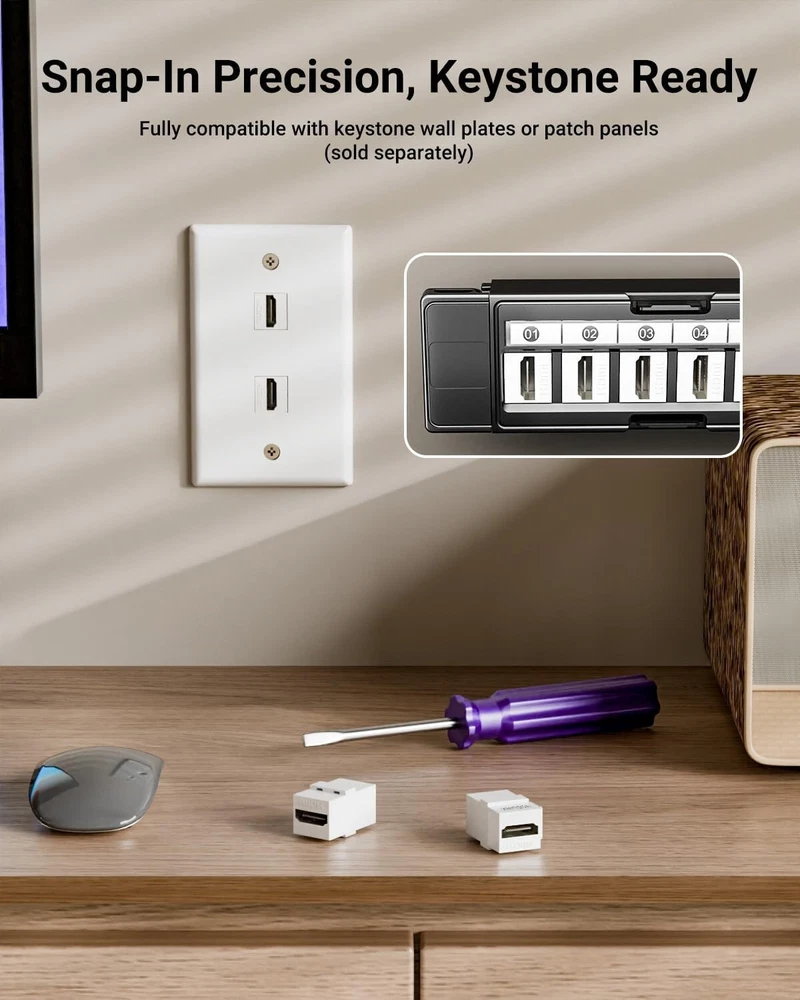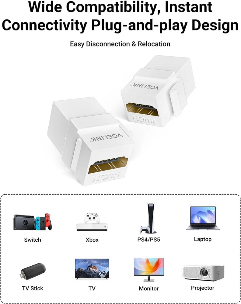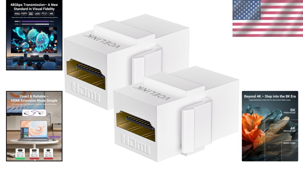 Dual HDMI 2.1 Female Adapter - Snap-in Keystone for 8K/4K Connections - 2 Pack ‹ › ‹ › ‹ › ‹ › ‹ › ‹ › ‹ › ‹ › ‹ › ‹ › ‹ › Dual HDMI 2.1 Female Adapter - Snap-in Keystone for 8K/4K Connections Elevate Your Viewing Experience Immerse yourself in stunning clarity with our Dual HDMI 2.1 Female Adapter. A game-changer for your home theater, gaming, and professional setups, this adapter ensures exceptional quality and compatibility. Key Features: 8K ULTRA HD & 48 GBPS TRANSMISSION: Support for 8K@60Hz & 4K@120Hz, delivering unmatched visuals at ultra-fast 48Gbps bandwidth. SEAMLESS EXTENSION & SECURE CONNECTION: The 180° inline design guarantees a stable hold for reliable, lossless signal extension. LONG-LASTING & COMPACT: Featuring gold-plated connectors and a resilient ABS shell, this compact design is perfect for tight spaces. PACKAWIDE COMPATIBILITY: Compatible with TVs, projectors, gaming consoles, laptops, Blu-ray players, and streaming devices. PACKAGING: Includes 2 x 8K HDMI 2.1 Female to Female Jack Coupler Adapters, along with an 18- friendly after-sale service. Why Choose Our Dual HDMI Adapter? Why settle for less when you can experience ultra-high-definition visuals and a secure, seamless connection? Our Dual HDMI 2.1 Female Adapter offers top-of-the-line performance with features such as Dynamic HDR, eARC, Dolby Vision, ALLM, and VRR compatibility, enhancing every moment of your viewing experience. Don’t let compatibility issues hold you back. With easy plug-and-play installation, backward compatibility with HDMI 2.0/1.4, and no more cumbersome setup processes, you can set up your system with ease. Step into the future of entertainment — order your Dual HDMI 2.1 Female Adapter today and elevate your viewing pleasure to a new level! Shipping Free & Fast Shipping - We offer free shipping to most of the USA with a normal delivery time of 3-7 days. However, due to the current situation, additional delivery time (up to 3 weeks) may be required for some items. Alternative Carriers - We may use alternative carriers (e.g. USPS, FedEx, UPS, etc.) to ensure your package arrives safely and on time. Due to the use of multiple carriers, we are unable to provide a tracking number automatically. Handling Time - Orders are processed and shipped within 1-2 business days of receiving cleared payment. Shipping Restrictions - Shipping to Alaska, Hawaii, Puerto Rico, Guam, and other US territories may incur shipping charges or delivery restrictions. Please contact us before ordering, or your order can be refunded/cancelled. State Restrictions - There may be restrictions based on your state of purchase. For example, certain items may not be shipped to California due to state regulations. Contact for Tracking Updates - If you require tracking updates or have any concerns about the delivery of your order, please feel free to contact us, and we will be happy to assist you. Return 30-Day Hassle-Free Returns - We want you to be completely satisfied with your purchase. If you are not, you can return the item within 30 days of receiving it for a full refund or exchange. Easy Return Process - To start a return, simply contact us and we will provide you with a prepaid return shipping label and detailed instructions. Restocking Fee - There are no restocking fees for returns. However, the buyer is responsible for return shipping costs if the return is not due to a seller's error. Refund Processing Time - Refunds will be processed within 5 business days of receiving the returned item in its condition. Payment We accept all major credit cards, PayPal, and Apple Pay for your convenience. Your payment information is secure and encrypted to ensure a safe and seamless transaction. Please complete your payment within 3 days of purchase to avoid any delays in shipping. Feedback Your feedback is extremely important to us. We strive to provide the best products and customer service possible. If you are satisfied with your purchase, please take a moment to leave us a positive review. If you have any concerns or issues with your order, please contact us before leaving negative feedback. We are committed to resolving any problems and ensuring your satisfaction. Contact Us If you have any questions or concerns, please feel free to out to our customer support team. You can contact us through the eBay messaging system. We are available Monday to Friday, 9:00 am to 5:00 pm EST, and we will do our best to respond to your inquiry within 24 hours. Buy it now and enjoy a pleasant shopping experience! Unit Quantity: 2 Item Height: HDMI Keystone Jack Item Length: HDMI Keystone Jack Item Width: HDMI Keystone Jack Connector A: HDMI Connector B: HDMI Standard Female Features: Gold Plated,8K ULTRA HD,48 GBPS TRANSMISSION,Dynamic HDR,eARC,Dolby Vision,ALLM,VRR,Snap-in,180 Degree Angle Connector,Compact,Multi-scenario use Compatible Model: Universal,standard hdmi male devices,patch panel,wall plate Type: Adapter Connection Split/Duplication: 1:1 Color: White Gauge: NA Fiber Type: NA