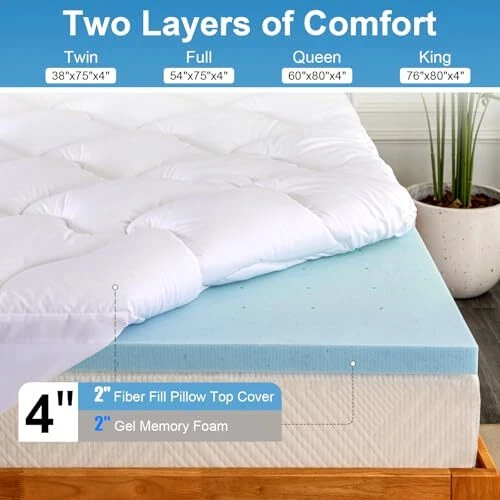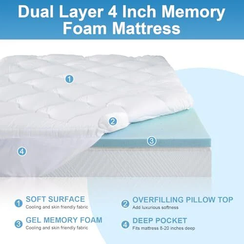 Return Policy Fast Delivery Trusted seller Dual Layer 4 Inch Memory Foam Mattress Topper King Size,2 Inch Gel Memory Foam Plus 2 Inch Cooling Pillow Top Cover with 8-21 Inch Deep Pocket, Mattress Pad for Back Pain,White Product Description ?️【2-in-1 Dual Layer Design】This dual layer mattress topper,integrating a 2-inch layer of cooling gel memory foam with an additional 2-inch breathable pillow-top layer generously filled with a snow-like down alternative. This mattress topper can be utilized either independently or in conjunction, catering to your varying preferences for softness and comfort. ?️【Improve Sleep Experience】This gel foam mattress topper provides luxurious support tailored to all sleeping positions, contouring to your body's curves to ensure optimal relaxation of your shoulders, neck, back, and spine, tby alleviating discomfort. The moderately firm memory foam combined with the soft pillow-top cover creates the ultimate sleep experience. ?️【Deep pocket Mattress Pad】Equipped with a versatile 8" to 21" elastic deep pocket encircled by a 360° all-around elastic skirt, this bed topper ads firmly to your mattress, ing a snug and secure fit throughout the night, regardless of your movements. Furthermore, the pillow-top layer is machine-washable, allowing for effortless maintenance through a gentle cycle with cold water and low tumble drying. ?️【High Quality Mattress Topper】Embracing a unique 3D & 7D fiber construction, thismemory foam mattress topper boasts a three-dimensional structure that facilitates air circulation, offering unparalleled comfort and cooling without the excess heat and perspiration associated with memory foam or conventional mattresses. Crafted from premium polyester fabric, it cocoons you in a cloud-like embrace of softness. ?️【Pre-Use Instructions】Due to vacuum packaging, upon opening, the product may appear thinner than expected. To eliminate any slight odor from the memory foam and restore the mattress pad's fluffiness, please remove both the memory foam and pillow top mattress topper, lay them flat in a well-ventilated area for a while. Shipping Returns Payment Shipping Shipping is FREE to all addresses other than APO/PO boxes in the lower 48 states. All our stock ships from US-based warehouses. Shipped via USPS or UPS (depending on location and package weight) Unless stated otherwise, all orders will ship within 24-72 hours of your payment being processed. Check our feedback to see the great reviews of FAST shipping we offer. Returns Seller does not accept returns Payment We currently accept payment via eBay managed payments only. Once payment is cleared, we will dispatch your shipment within 1-3 business days. Please refer to the "Shipping" tab for more information regarding shipping speed to your destination.