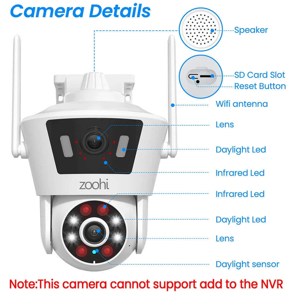 Dual Lens 6MP 2K Security Camera Icsee 2.4G Wireless Wifi Camera PTZ Cameras Color Night Vision Two Way Audio 4X Digital Zoom SPECIFICATIONSBrand Name: ZoohiOrigin: Mainland ChinaHigh Definition: 6.0 MegapixelsHign-concerned Chemical: noneSupported Operating Systems: Windows 7Supported Operating Systems: Windows 10Lens (mm): 3.6mmLens (mm): 6mmStyle: Dome CameraConnectivity: WIFIInstallation: NormalMinimum Illumination(Lux): 0Scene: Indoor and outdoorColor Night Vision: YESMegapixels: 6mpVideo Compression Format: H.264Video Compression Format: H.265IR Distance(m): 10MCertification: CECertification: FCCCertification: RoHSDimensions (L x W x D)(mm): 135*155*210MMColor: WHITEPower Mode: Mains ElectricityAlarm Action: Local Alarmis_customized: NoModel Number: P7Supported Mobile Systems: AndroidSupported Mobile Systems: IOSSmart home platform: noneAI Functions: Human DetectionIP Rating: IP66Special Features: Waterproof / WeatherproofApp name: otherTF Card: NoneDigital Zoom: 4XPower Supply(V): DC 12V/1AAudio Output: Two Way AudioPower Consumption(W): 3WSensor: CMOSSensor Brand: SonyOperating Temperature: -10°-60°Shell Material: PlasticPower Supply: NormalViewing Angle : 75°Optical Zoom: noneMovement Range(Pan): 0°-360°Rechargeable Battery: noneNote This camera can only be used alone, and cannot be added to any NVR! ! ! 6MP Dual Lens WiFi Camera APP Name: icsee1. Image Resolution: 2560*1440(Single Lens)2. Lens: 3.6mm& 6mm3. 10M Day and Night Vision4. Support Motion Detection and Alarm Tone Function5. Support Wifi(2.4ghz) Connection&Bluetooth Connection6. Support Infrared Night Vision7. Support Color Night Vision8. Support 4X Digital Zoom9. Support Two-Way Audio Talk Speak Real Time10. Support Auto Tracking11. Support Pan 355°/ Tilt 90°12. Support 7*24 hours recording13. Support TF/SD Card Max 128 GB(not include in the camera)14. Support icsee APP Remote Control15. Weatherproof Level: IP6616. Image Sensor: Sony 2K 3+3MP Dual-Lens Dual-Screen With two outdoor camera lenses, blind spots are also monitored, really all around without dead ends. Simultaneous multi-angle surveillance, blind spot surveillance and split-screen surveillance on the same screen. Both security camera lenses are capable of HD surveillance recording. Two Way Audio The camera has a built-in microphone and speaker, so you can not only record sound but also talk to the person in front of the camera via your mobile app. PIR Intelligent Motion Detection & Alerts Security camera outdoor better than the usual motion detection, the home security cameras can track the movement of moving human. When a suspicious person is detected, the outdoor security camera can also emit audible and flashing alarms to deter unwanted persons. Also you can adjust the alarm area and sensitivity to achieve accurate detection. Humanoid Automatic Tracking The rotating lens of the camera can support 352° horizontal rotation + 90° vertical rotation, which enables the camera to have automatic tracking function. After the object disappears from the camera's field of view, the camera will automatically return to its original position. Full Color + Infrared Night Vision The camera has its own infrared and white light. In the dark night, using the full-color night vision mode is the same as during the day. IP66 Waterproof The IP66 waterproof rating of the camera allows the camera to be used with confidence in harsh outdoor environments. Two Storage Methods You can choose to use an SD card (not included in the camera) to save the recorded video locally, or buy a cloud storage service to save the video to the cloud for easy playback at any time. Camera Details Warranty We offer a 1-year warranty on all our products, which is activated upon receipt. If the product itself is proved to be defective within the warranty period, it can be repaired or replaced. The warranty does not cover any incidental, accidental or indirect losses arising from the use of the customer and losses caused by natural disasters.Warranty products will be carried out in accordance with the following rules:1. Free replacement within 1 month after receiving the goods.2. Pay the shipping fee for the warranty product within 2-6 months after receiving the goods.3. Pay 50% of the price of the warranty product within 7-12 months after receiving the goods. Feedback 1. Your satisfaction and positive feedback is very important to us, please leave positive feedback and 5 stars if you are satisfied with our items and services.2. If you have any problems with our items or service, just feel free to contact us firstly before you left any neutral or negative feedback, communication is much more efficiently than opening a dispute. Dual Lens 6MP 2K Security Camera Icsee 2.4G Wireless Wifi Camera PTZ Cameras Color Night Vision Two Way Audio 4X Digital Zoom SPECIFICATIONS Brand Name : Zoohi Origin : Mainland China High Definition : 6.0 Megapixels Hign-concerned Chemical : none Supported Operating Systems : Windows 7 Supported Operating Systems : Windows 10 Lens (mm) : 3.6mm Lens (mm) : 6mm Style : Dome Camera Connectivity : WIFI Installation : Normal Minimum Illumination(Lux) : 0 Scene : Indoor and outdoor Color Night Vision : YES Megapixels : 6mp Video Compression Format : H.264 Video Compression Format : H.265 IR Distance(m) : 10M Certification : CE Certification : FCC Certification : RoHS Dimensions (L x W x D)(mm) : 135*155*210MM Color : WHITE Power Mode : Mains Electricity Alarm Action : Local Alarm is_customized : No Model Number : P7 Supported Mobile Systems : Android Supported Mobile Systems : IOS Smart home platform : none AI Functions : Human Detection IP Rating : IP66 Special Features : Waterproof / Weatherproof App name : other TF Card : None Digital Zoom : 4X Power Supply(V) : DC 12V/1A Audio Output : Two Way Audio Power Consumption(W) : 3W Sensor : CMOS Sensor Brand : Sony Operating Temperature : -10°-60° Shell Material : Plastic Power Supply : Normal Viewing Angle : 75° Optical Zoom : 