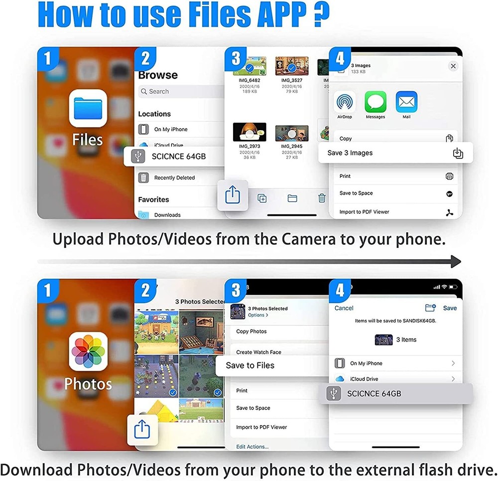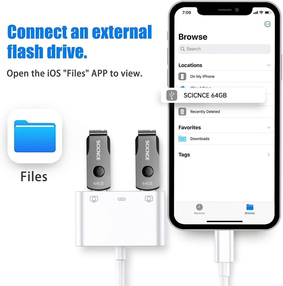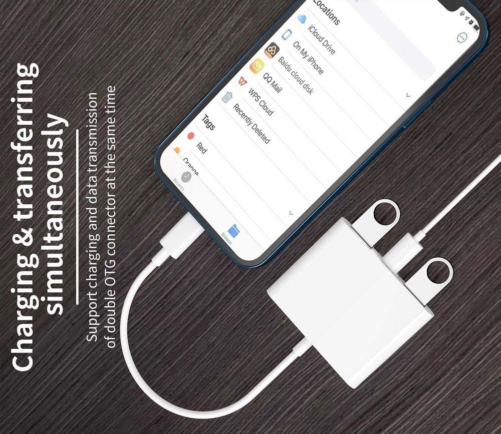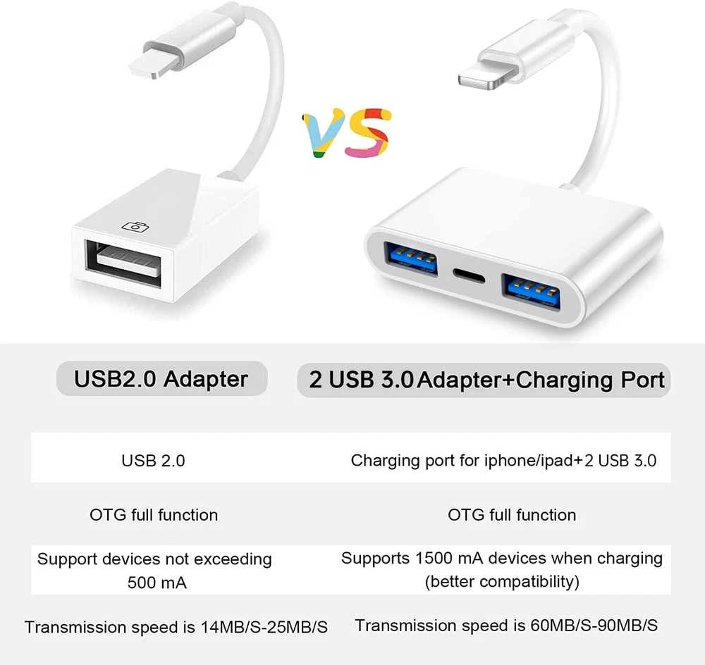 For iPhone to USB Female Adapter OTG and Charger Cable for iPhone 11 12 13 14 Mini max pro xs xr x se 7 8plus Ipad air Camera Memory Stick Flash Drive Cord Converter Charging Splitter For iPhone to USB 3.0 Adapter, USB 3.0 Camera Adapter Compatible with iPhone iPad, iPhone USB Adapter with 2 USB 3.0 and 1 Charging Port, No Application, Plug and Play (White) About this item: ✔ P lug and Play: The usb adapter for iPhone/iPad does not require an application, and there is no need to remove the camera's memory card.Using a usb to iPhone adapter, you can copy beautiful scenery and cute people photos and videos to iPhone and iPad.This is an excellent choice for copying photos or videos from the camera in a short time. The transmission is 60MB/S-90MB/S. ✔ Import & Export Photos/Video/Files/Audio: This dual usb camera otg adapter more convenient to transmit photos and videos from camera to iPhone and iPad. For iOS 9.2-13, support transfer the picture video is the one-way transmit. For iOS 13 and later, it can import & export transfer Photos, Video, MP3 files, Excel, Word, PPT, PDF by open the 'Files' App. ✔ Friendly Office Helper: Light and durable, short cable, better performance.With usb ipad adapter, you can directly plug the PC keyboard or mouse into the iPad,improving your typing speed and productivity. usb adapter for iPad widely compatible with more USB devices, like Hubs, USB flash drives, Camera, Guitar, MIDI keyboard, Digital piano, Mouse etc. Compatible with iPhone 13 mini/13/13 Pro/13 Pro Max/12 mini/12/12 Pro/12 Pro Max/11/11 Pro/X/XS/XS MAX/XR/8/8Plus/7/7 Plus/iPad/iPod. ✔ Charge Your iPhone and iPad: This usb adapter for iphone adds a charging port for iphone/ipad, charging,view photos or videos can be operated at the same time.Don't worry about the power shortage of your phone anymore.More importantly, this usb to iPhone adapter can also allow you to share battery power with your friends and solve your friends' urgent needs. ✔ Do The Best: Using the usb iphone adapter,Will bring you more interesting moments,Using the iphone to usb adapter, Will bring you more convenience . Buyer Note: If you are satisfied with our service, we appreciate you leaving us a positive feedback and 5 star rating review! Your opinion is important to the success of our business. If you are not satisfied with the product or have not received the product for more than 35 days, please contact us to resolve, we will do our best to solve. We are sure to come up with a satisfactory solution. Please contact us first before leaving cold feedback or good feedback of 1-3 stars and opening the case. We'll do our best to solve your problem. Because we believe that everything can be solved through communication. Thank you very much!