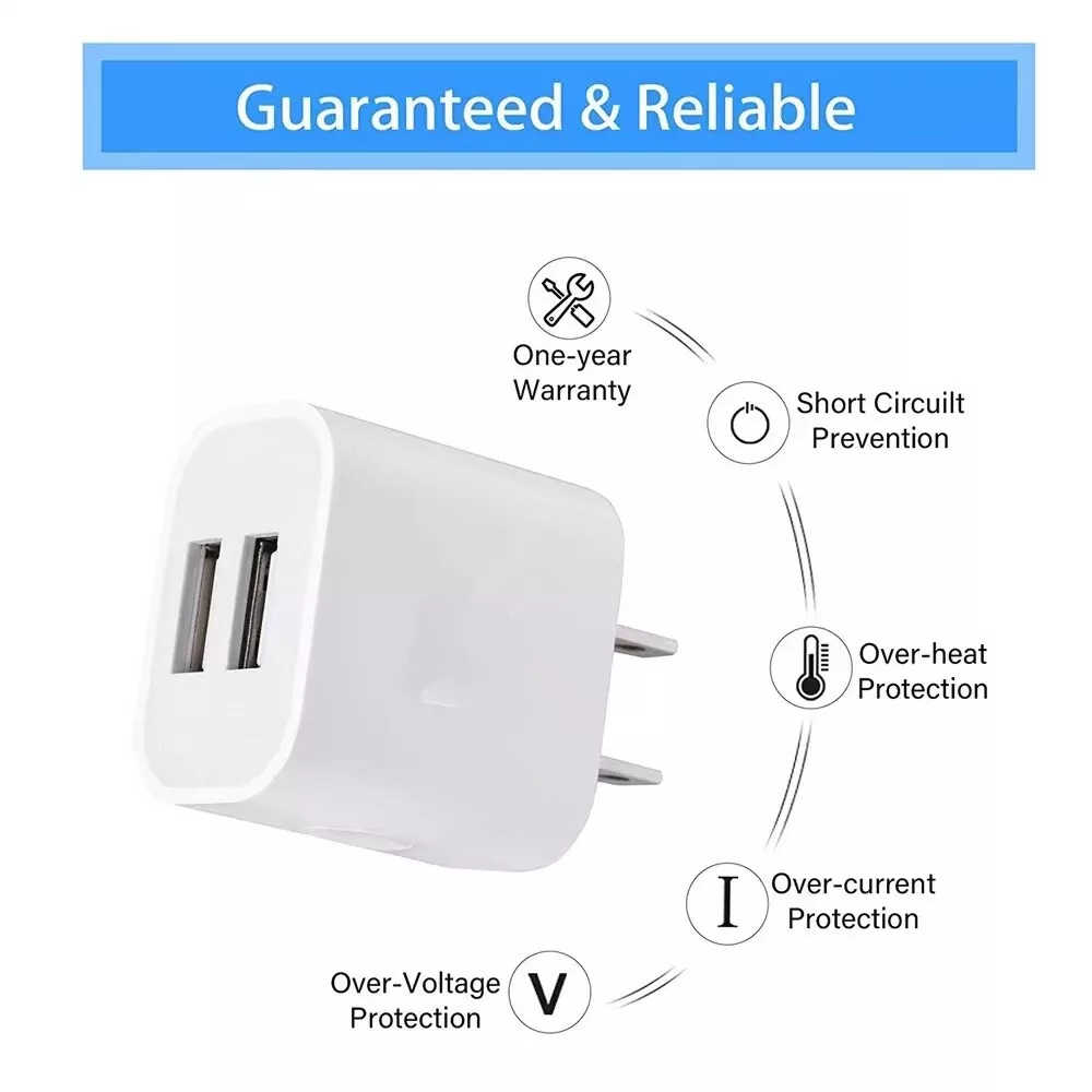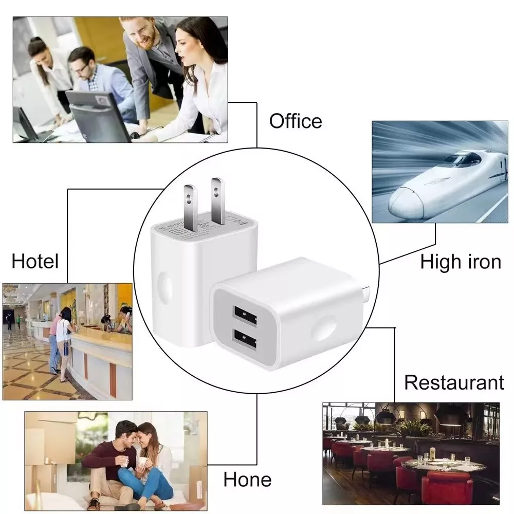 Product Compatibility: Compatible with all USB cable charging devices.Such as iPhone11/X/8/7/7 plus/6/6 plus 5S/5/4S, Pad Pro/Mini/Air,Samsung S8/S7/S6/S5/S4,Note 4/Note 3,Google Nexus,HTC.LG Nokia.Motorola. Reliable Quality: Intelligent circuit design,can protects against short circuiting, over-heating, over-currents, and over-charging, Charging stops when battery is full Easy to install: this adapter allows charging at home , in the office,or in the hotel.Simply connect with your phone USB cable,and plug into a electrical socket,then it working Product characteristics: Wide range 100 - 240V AC input Available in all country,lightweight perfect for travelling,and 2A high charging speed Specification: USB Output: Dual USB Port Input: AC100-240V 50/60Hz Output: DC 5V 2A Color: white Package Included: 1/2/3/5/10/20/50/100/200/500/1000 x Wall Charger Adapter Tips: -Charging speed also concern with battery capacity,it charging faster for small battery than larger one. -it is normal condition for the wall charger get a little hot when it working