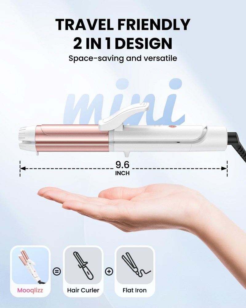 Dual Voltage Curling Iron, Travel Flat Iron Hair Curler in One for European, 1 1/4 Inch Ceramic Plates with Adjustable Temperature, White Travel-Friendly 2 in 1 Design: Space-saving and versatile. Eliminate the need to pack multiple styling tools that lets you effortlessly switch between curly and straight hairstyles. Perfect for travelers looking to minimize their packing without compromising style. NOTICE: Press and hold for three seconds to turn on. Universal Dual Voltage for Global Use: Designed for the international traveler, this curling iron features 100-240V dual voltage. Designed to adapt automatically to the local voltage in Europe and beyond, it eliminates the need for a transformer, ensuring you can achieve your perfect hairstyle anywhere in the world. Adjustable Temperature Settings: With two heat settings, 360°F for delicate noraml hair and 410°F for thicker coarse locks, it caters to all hair types. This allows for personalized styling that protects your hair from heat damage, ensuring healthy-looking results. Rapid Heating Technology: Achieve your desired look in no time with our fast-heating PTC technology. The ceramic coating ensures even heat distribution, reducing styling time and minimizing hair damage for quicker, more effective styling sessions. Travel-Friendly Safety Features: Features include 60mins auto shut-off, a tangle-free swivel cord, a lockable design for compact storage, and cooling tips, plus a heat-resistant glove. It's engineered for both safety and convenience, offering peace of mind while styling on the go.